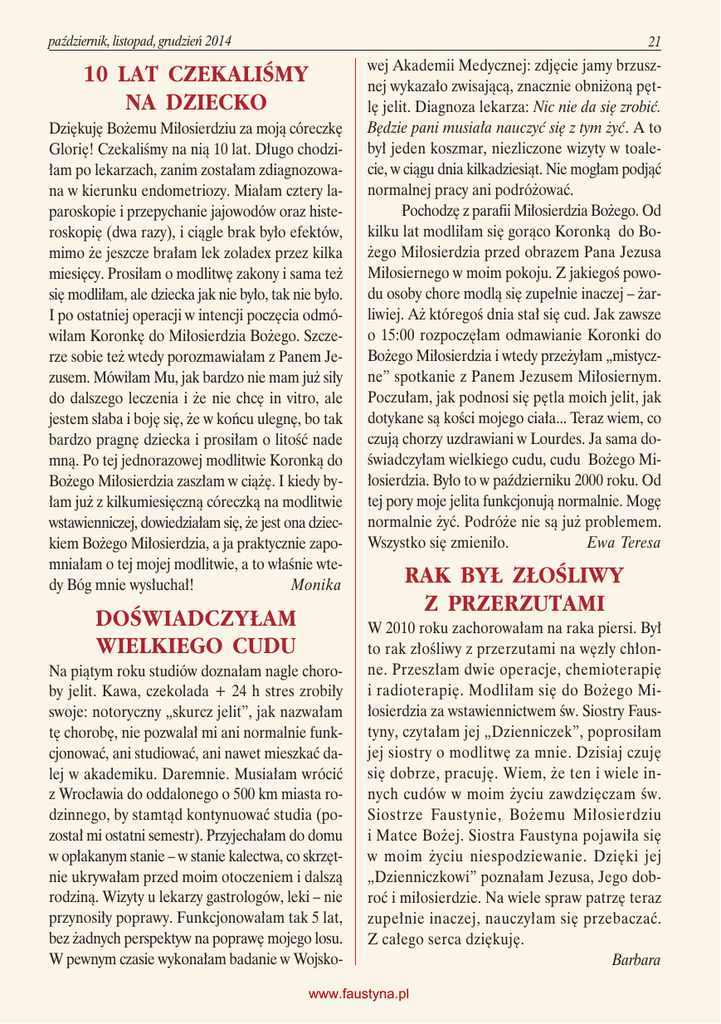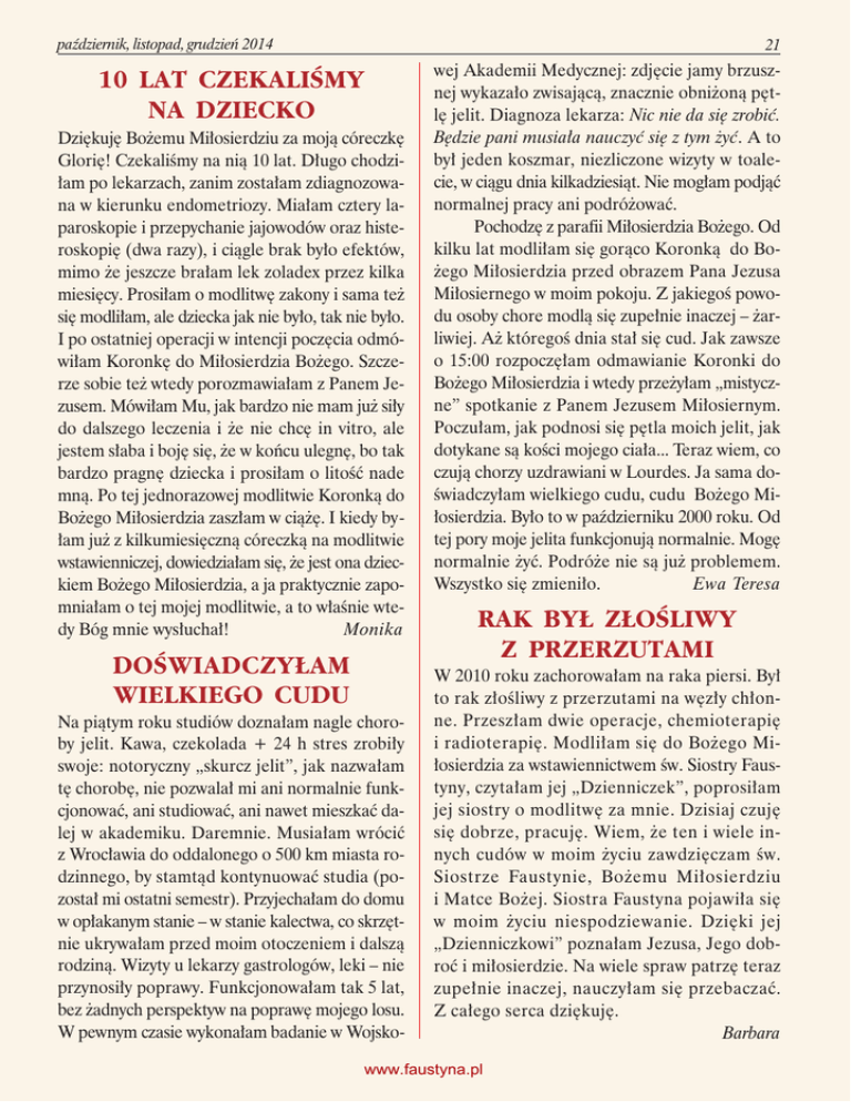 październik, listopad, grudzień 2014 21 10 LAT CZEKALIŚMY NA DZIECKO Dziękuję Bożemu Miłosierdziu za moją córeczkę Glorię! Czekaliśmy na nią 10 lat. Długo chodziłam po lekarzach, zanim zostałam zdiagnozowana w kierunku endometriozy. Miałam cztery laparoskopie i przepychanie jajowodów oraz histeroskopię (dwa razy), i ciągle brak było efektów, mimo że jeszcze brałam lek zoladex przez kilka miesięcy. Prosiłam o modlitwę zakony i sama też się modliłam, ale dziecka jak nie było, tak nie było. I po ostatniej operacji w intencji poczęcia odmówiłam Koronkę do Miłosierdzia Bożego. Szczerze sobie też wtedy porozmawiałam z Panem Jezusem. Mówiłam Mu, jak bardzo nie mam już siły do dalszego leczenia i że nie chcę in vitro, ale jestem słaba i boję się, że w końcu ulegnę, bo tak bardzo pragnę dziecka i prosiłam o litość nade mną. Po tej jednorazowej modlitwie Koronką do Bożego Miłosierdzia zaszłam w ciążę. I kiedy byłam już z kilkumiesięczną córeczką na modlitwie wstawienniczej, dowiedziałam się, że jest ona dzieckiem Bożego Miłosierdzia, a ja praktycznie zapomniałam o tej mojej modlitwie, a to właśnie wtedy Bóg mnie wysłuchał! Monika DOŚWIADCZYŁAM WIELKIEGO CUDU Na piątym roku studiów doznałam nagle choroby jelit. Kawa, czekolada + 24 h stres zrobiły swoje: notoryczny „skurcz jelit”, jak nazwałam tę chorobę, nie pozwalał mi ani normalnie funkcjonować, ani studiować, ani nawet mieszkać dalej w akademiku. Daremnie. Musiałam wrócić z Wrocławia do oddalonego o 500 km miasta rodzinnego, by stamtąd kontynuować studia (pozostał mi ostatni semestr). Przyjechałam do domu w opłakanym stanie – w stanie kalectwa, co skrzętnie ukrywałam przed moim otoczeniem i dalszą rodziną. Wizyty u lekarzy gastrologów, leki – nie przynosiły poprawy. Funkcjonowałam tak 5 lat, bez żadnych perspektyw na poprawę mojego losu. W pewnym czasie wykonałam badanie w Wojsko- wej Akademii Medycznej: zdjęcie jamy brzusznej wykazało zwisającą, znacznie obniżoną pętlę jelit. Diagnoza lekarza: Nic nie da się zrobić. Będzie pani musiała nauczyć się z tym żyć. A to był jeden koszmar, niezliczone wizyty w toalecie, w ciągu dnia kilkadziesiąt. Nie mogłam podjąć normalnej pracy ani podróżować. Pochodzę z parafii Miłosierdzia Bożego. Od kilku lat modliłam się gorąco Koronką do Bożego Miłosierdzia przed obrazem Pana Jezusa Miłosiernego w moim pokoju. Z jakiegoś powodu osoby chore modlą się zupełnie inaczej – żarliwiej. Aż któregoś dnia stał się cud. Jak zawsze o 15:00 rozpoczęłam odmawianie Koronki do Bożego Miłosierdzia i wtedy przeżyłam „mistyczne” spotkanie z Panem Jezusem Miłosiernym. Poczułam, jak podnosi się pętla moich jelit, jak dotykane są kości mojego ciała... Teraz wiem, co czują chorzy uzdrawiani w Lourdes. Ja sama doświadczyłam wielkiego cudu, cudu Bożego Miłosierdzia. Było to w październiku 2000 roku. Od tej pory moje jelita funkcjonują normalnie. Mogę normalnie żyć. Podróże nie są już problemem. Wszystko się zmieniło. Ewa Teresa RAK BYŁ ZŁOŚLIWY Z PRZERZUTAMI W 2010 roku zachorowałam na raka piersi. Był to rak złośliwy z przerzutami na węzły chłonne. Przeszłam dwie operacje, chemioterapię i radioterapię. Modliłam się do Bożego Miłosierdzia za wstawiennictwem św. Siostry Faustyny, czytałam jej „Dzienniczek”, poprosiłam jej siostry o modlitwę za mnie. Dzisiaj czuję się dobrze, pracuję. Wiem, że ten i wiele innych cudów w moim życiu zawdzięczam św. Siostrze Faustynie, Bożemu Miłosierdziu i Matce Bożej. Siostra Faustyna pojawiła się w moim życiu niespodziewanie. Dzięki jej „Dzienniczkowi” poznałam Jezusa, Jego dobroć i miłosierdzie. Na wiele spraw patrzę teraz zupełnie inaczej, nauczyłam się przebaczać. Z całego serca dziękuję. Barbara www.faustyna.pl