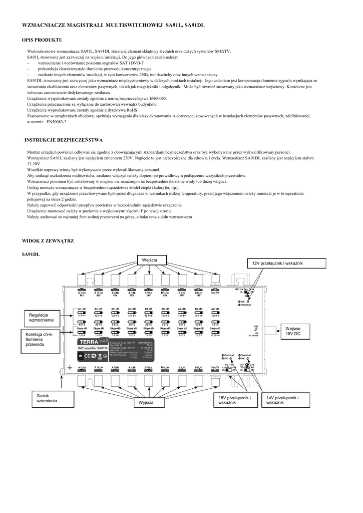 WZMACNIACZE MAGISTRALI MULTISWITCHOWEJ SA91L, SA91DL OPIS PRODUKTU Wielozakresowe wzmacniacze SA91L, SA91DL stanowią element składowy średnich oraz dużych systemów SMATV. SA91L stosowany jest zazwyczaj na wejściu instalacji. Do jego głównych zadań należy: – wzmocnienie i wyrównanie poziomu sygnałów SAT i DVB-T – prekorekcja charakterystyki tłumienia przewodu koncentrycznego – zasilanie innych elementów instalacji, w tym konwerterów LNB, multiswitchy oraz innych wzmacniaczy SA91DL stosowany jest zazwyczaj jako wzmacniacz międzystopniowy w dalszych punktach instalacji. Jego zadaniem jest kompensacja tłumienia sygnału wynikająca ze stosowania okablowania oraz elementów pasywnych, takich jak rozgałęźniki i odgałęźniki. Może być również stosowany jako wzmacniacz wejściowy. Konieczne jest wówczas zastosowanie dedykowanego zasilacza. Urządzenia wyrpdoukowane zostały zgodnie z normą bezpieczeńsytwa EN60065. Urządzenia przeznaczone są wyłącznie do zastosowań wewnątrz budynków. Urządzenia wyprodukowane zostały zgodnie z dyrektywą RoHS Zastosowane w urządzeniach obudowy, spełniają wymagania dla klasy ekranowania A dotyczącej stosowanych w instalacjach elementów pasywnych, zdefiniowanej w normie EN50083-2. INSTRUKCJE BEZPIECZEŃSTWA Montaż urządzeń powinien odbywać się zgodnie z obowiązującymi standardami bezpieczeństwa oraz być wykonywany przez wykwalifikowany personel. Wzmacniacz SA91L zasilany jest napięciem zmiennym 230V. Napięcie to jest niebezpieczne dla zdrowia i życia. Wzmacniacz SA91DL zasilany jest napięciem stałym 12-20V. Wszelkie naprawy winny być wykonywane przez wykwalifikowany personel. Aby uniknąć uszkodzenia multiswitcha, zasilanie włączyć należy dopiero po prawidłowym podłączeniu wszystkich przewodów. Wzmacniacz powinien być instalowany w miejscu nie narażonym na bezpośrednie działanie wody lub dużej wilgoci. Unikaj montażu wzmacniacza w bezpośrednim sąsiedztwie źródeł ciepła (kaloryfer, itp.). W przypadku, gdy urządzenie przechowywane było przez długi czas w warunkach niskiej temperatury, przed jego włączeniem należy umieścić je w temperaturze pokojowej na okres 2 godzin. Należy zapewnić odpowiedni przepływ powietrza w bezpośrednim sąsiedztwie urządzenia. Urządzenie montować należy w poziomie z wejściowymi złączmi F po lewej stronie. Należy zachować co najmniej 5cm wolnej przestrzeni na górze, z boku oraz z dołu wzmacniacza WIDOK Z ZEWNĄTRZ SA91DL Wejścia 12V przełącznik i wskaźnik Regulacja wzmocnienia Wejście 18V DC Wejście Korekcja ch-ki tłumienia przewodu Zacisk uziemienia Wyjścia 18V przełącznik i wskaźnik 14V przełącznik i wskaźnik SA91L Wejścia 12V przełącznik i wskaźnik Regulacja wzmocnienia Korekcja ch-ki tłumienia przewodu Zacisk uziemienia 18V przełącznik i wskaźnik Wyjścia 14V przełącznik i wskaźnik DZIAŁANIE Wielozakresowy wzmacniacz zawiera separowane tory wzmacniające dla każdego z sygnałów wejściowych. Przełączniki odpowiedzialne za poziom sygnału wyjściowego ulokowane są między wejściem a wyjściem sygnałowym dla każdego torów. Regulacja wzmocnienia odbywa się za pomocą dwóch przełączników. Pierwszy z nich przyjąć może jedną z 4 wartości z odstępem 4dB, drugi z odstępem 1dB. Wartość ustawiona na obu przełącznikach jest sumowana i odejmowana od maksymalnego wzmocnienia wzmacniacza. Regulacja korekcji charakterystyki tłumienia przewodu obydwa się przemocą czteropozycyjnego przełącznika. Ustawiona wartość stanowi różnicę w wartości wzmocnienia dla najwyższych (większe wzmocnienie) i najniższych (mniejsze wzmocnienie) częstotliwości. Wzmacniacz SA91L zapewnia zasilanie 18V na wszystkich liniach sygnałowych polaryzacji poziomej, 14V na wszystkich liniach polaryzacji pionowej oraz 12V w torze wejściowym telewizji naziemnej. Przełączniki umieszczone po stronie wyjść pozwalają na włączanie oraz wyłączanie napięcia na wyjściach urządzenia. Napięcie to wykorzystać można do zasilania innych urządzeń w sieci. W przypadku, gdy w systemie stosowane są inne źródła zasilania, należy wyłączyć napięcie na wyjściach wzmacniacza. Pozostawienie przełączników włączonych może skutkować zakłóceniami interferencyjnymi. Wszystkie obwody sygnałowe wyposażone są w układu przeciwzwarciowe. O ewentualnym zwarciu informują umieszczone na obudowie diody LED. Kolor zielony oznacza prawidłową pracę urządzenia. Kolor czerwony oznacza zwarcie w torze sygnałowym lub przeciążenie zasilacza. W przypadku przeciążenia zasilacza dioda 18V świeci pulsacyjnie w kolorze czerwonym. W przypadku, gdy któraś z diod zaświeci się na czerwono należy odłączyć zasilanie wzmacniacza i poprawić instalację. Nie należy ponownie włączać zasilania wzmacniacza przed upływem 30 sekund. Wzmacniacz SA91DL zasilany jest ze zdalnych źródeł zasilania (np. wzmacniacza SA91L) po liniach sygnałowych H. Wzmacniacz wyposażony jest również w wejście AUX dla podłączenia lokalnego zasilacza 18VDC, jeśli istnieje taka potrzeba. W przypadku podłączenia zasilacza lokalnego, napięcie jest dystrybuowane w torach sygnałowych H w sposób taki sam, jak w przypadku wzmacniacza SA91L. Obecność napięcia w linii owocuje zapaleniem się odpowiedniej diody LED na zielono. 12V w torze TV dostępne będzie wyłącznie w sytuacji, gdy w torze H obecne będzie napięcie 18V. PARAMETRY TECHNICZNE Nazwa SA-91L SA-91LD Kod R70901 R70911 SAT 950 - 2400 Pasmo pracy [MHz] DVB-T/Radio 47 - 790 SAT 22 DVB-T/Radio 22 Wzmocnienie [dB] SAT 0...-15, krok 1dB DVB-T/Radio 0...-15, krok 1dB Regulacja wzmocnienia [dB] SAT 0/3/5/7 Korekcja ch-ki tłumienia przewodu [dB] DVB-T/Radio 0/6/12/18 SAT/SAT 30 SAT/DVB-T 30 Separacja [dB] Szumy własne [dB] <9 Max. poziom sygnału TV naziemnej (IMD3=60dB)**** [dBμV] 109 Max. poziom sygnału SAT (IMD3=35dB)**** [dBμV] Zasilanie innych urządzeń 114 tor 
