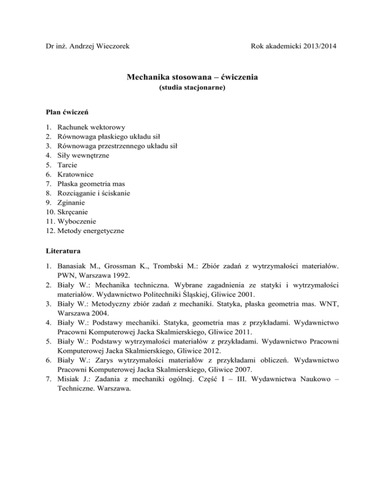 Dr inż. Andrzej Wieczorek Rok akademicki 2013/2014 Mechanika stosowana – ćwiczenia (studia stacjonarne) Plan ćwiczeń 1. Rachunek wektorowy 2. Równowaga płaskiego układu sił 3. Równowaga przestrzennego układu sił 4. Siły wewnętrzne 5. Tarcie 6. Kratownice 7. Płaska geometria mas 8. Rozciąganie i ściskanie 9. Zginanie 10. Skręcanie 11. Wyboczenie 12. Metody energetyczne Literatura 1. Banasiak M., Grossman K., Trombski M.: Zbiór zadań z wytrzymałości materiałów. PWN, Warszawa 1992. 2. Biały W.: Mechanika techniczna. Wybrane zagadnienia ze statyki i wytrzymałości materiałów. Wydawnictwo Politechniki Śląskiej, Gliwice 2001. 3. Biały W.: Metodyczny zbiór zadań z mechaniki. Statyka, płaska geometria mas. WNT, Warszawa 2004. 4. Biały W.: Podstawy mechaniki. Statyka, geometria mas z przykładami. Wydawnictwo Pracowni Komputerowej Jacka Skalmierskiego, Gliwice 2011. 5. Biały W.: Podstawy wytrzymałości materiałów z przykładami. Wydawnictwo Pracowni Komputerowej Jacka Skalmierskiego, Gliwice 2012. 6. Biały W.: Zarys wytrzymałości materiałów z przykładami obliczeń. Wydawnictwo Pracowni Komputerowej Jacka Skalmierskiego, Gliwice 2007. 7. Misiak J.: Zadania z mechaniki ogólnej. Część I – III. Wydawnictwa Naukowo – Techniczne. Warszawa.