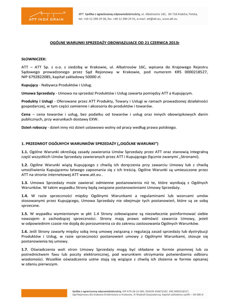 OGÓLNE WARUNKI SPRZEDAŻY OBOWIĄZUJĄCE OD 21 CZERWCA 2013r SŁOWNICZEK: ATT – ATT Sp. z o.o. z siedzibą w Krakowie, ul. Albatrosów 16C, wpisana do Krajowego Rejestru Sądowego prowadzonego przez Sąd Rejonowy w Krakowie, pod numerem KRS 0000218527, NIP 6792822085, kapitał zakładowy 50000 zł. Kupujący - Nabywca Produktów i Usług. Umowa Sprzedaży - Umowa na sprzedaż Produktów i Usług zawarta pomiędzy ATT a Kupującym. Produkty i Usługi - Oferowane przez ATT Produkty, Towary i Usługi w ramach prowadzonej działalności gospodarczej, w tym części zamienne i akcesoria do produktów i towarów. Cena – cena towarów i usług, bez podatku od towarów i usług oraz innych obowiązkowych danin publicznych, przy warunkach dostawy EXW. Dzień roboczy - dzień inny niż dzień ustawowo wolny od pracy według prawa polskiego. 1. PRZEDMIOT OGÓLNYCH WARUNKÓW SPRZEDAŻY („OGÓLNE WARUNKI”) 1.1. Ogólne Warunki określają zasady zawierania Umów Sprzedaży przez ATT oraz stanowią integralną część wszystkich Umów Sprzedaży zawieranych przez ATT i Kupującego (łącznie zwanymi „Stronami). 1.2. Ogólne Warunki wiążą Kupującego z chwilą ich doręczenia przy zawarciu Umowy lub z chwilą umożliwienia Kupującemu łatwego zapoznania się z ich treścią. Ogólne Warunki są umieszczone przez ATT na stronie internetowej ATT www.att.eu . 1.3. Umowa Sprzedaży może zawierać odmienne postanowienia niż te, które wynikają z Ogólnych Warunków. W takim wypadku Strony będą związane postanowieniami Umowy Sprzedaży. 1.4. W razie sprzeczności między Ogólnymi Warunkami a regulaminami lub wzorcami umów stosowanymi przez Kupującego, Umowa Sprzedaży nie obejmuje tych postanowień, które są ze sobą sprzeczne. 1.5. W wypadku wymienionym w pkt 1.4 Strony zobowiązane są niezwłocznie poinformować siebie nawzajem o zachodzącej sprzeczności. Strony mają prawo odmówić zawarcia Umowy, jeżeli w odpowiednim czasie nie dojdą do porozumienia co do zakresu zastosowania Ogólnych Warunków. 1.6. Jeśli Strony zawarły między sobą inną umowę związaną z regulacją zasad sprzedaży lub dystrybucji Produktów i Usług, w razie sprzeczności postanowień umowy z Ogólnymi Warunkami, stosuje się postanowienia tej umowy. 1.7. Oświadczenia woli stron Umowy Sprzedaży mogą być składane w formie pisemnej lub za pośrednictwem faxu lub poczty elektronicznej, pod warunkiem otrzymania potwierdzenia odbioru wiadomości. Wszelkie oświadczenia ustne stają się wiążące z chwilą ich złożenia w formie opisanej w zdaniu pierwszym. 2. ZAMÓWIENIA 2.1. W celu rozpoczęcia procedury zawarcia Umowy Sprzedaży Kupujący prześle ATT (a) zapytanie dotyczące możliwości i warunków nabycia wskazanych w zapytaniu Produktów i Usług (patrz punkt 2.2-2.8) albo (b) zamówienie na Produkty i Usługi (patrz punkty 2.9 – 2.13). 2.2. W przypadku otrzymania zapytania ATT prześle Kupującemu ofertę, która zawierać będzie co najmniej: a) specyfikację w planach Produktów i Usług zweryfikowaną pod względem dostępności produktów produkcyjnych, b) cenę netto wyrażoną w PLN/EUR/USD c) warunki płatności, w tym termin zapłaty ceny, orientacyjny termin realizacji dostawy. 2.3. Przedstawiona przez ATT oferta będzie wiążąca dla ATT przez okres 14 dni, o ile inaczej nie wskazano w treści oferty. 2.4. W okresie ważności oferty Kupujący może w każdym czasie ofertę przyjąć poprzez złożenie zamówienia na Produkty i Usługi objęte ofertą. 2.5. Zamówienie Kupującego poprzedzone ofertą ATT powinno zawierać: a - powołanie się na ofertę, specyfikację zamawianych Produktów i Usług, zgodnie z oznaczeniami zawartymi w ofercie, wymagany termin dostawy nie krótszy niż termin wskazany w ofercie, b - miejsce dostawy Produktów i Usług, c - imię i nazwisko osoby upoważnionej do odbioru Produktów i Usług. 2.6. Zamówienia zawierające zmiany w stosunku do oferty lub uzupełniające jej treść nie będą traktowane jako przyjęcie oferty, lecz jako nowe zapytanie o możliwość nabycia Produktów i Usług, które wymaga sporządzenia nowej oferty. W takim przypadku dotychczasowa oferta traci ważność. 2.7. Po otrzymaniu zamówienia, o którym mowa w punkcie 2.5, ATT niezwłocznie (2 dni robocze) prześle Kupującemu potwierdzenie przyjęcia zamówienia wskazując w nim wartość Produktów, termin płatności ceny oraz termin dostawy. 2.8. Z chwilą przyjęcia oferty przez Kupującego (tj. otrzymania przez ATT zamówienia), zostaje zawarta Umowa Sprzedaży, na którą składają się: oferta ATT, zamówienie Kupującego i Ogólne Warunki. 2.9. Kupujący może zrezygnować z etapu składania zapytania o warunki nabycia Produktów i Usług, i złożyć ATT od razu zamówienie na Produkty i Usługi, które w takim przypadku stanowić będzie ofertę Kupującego nabycia Produktów i Usług na warunkach określonych w zamówieniu. 2.10. Zamówienie Kupującego, które nie było poprzedzone ofertą ATT, musi zawierać następujące elementy: (a) specyfikacja zamawianych Produktów i Usług, (b) wymagany termin dostawy nie krótszy niż wskazany w punkcie 3.1 lub 3.2 Ogólnych Warunków, (c) ewentualne inne warunki uzgodnione uprzednio z ATT. 2.11. O ile inaczej nie uzgodniono z ATT, w przypadku zamówienia składanego w trybie opisanym w punkcie 2.9, cena Produktów i Usług będzie ustalana na podstawie aktualnego cennika oraz ewentualnych rabatów przyznanych danemu Kupującemu, zaś warunki zapłaty ceny będą ustalane na podstawie punktu 5.4 Ogólnych Warunków. 2.12. ATT akceptuje zamówienie Kupującego składane w trybie opisanym w punkcie 2.9 poprzez przesłanie Kupującemu potwierdzenia przyjęcia zamówienia. Z chwilą otrzymania przez Kupującego potwierdzenia zamówienia, zostaje zawarta Umowa Sprzedaży, na którą składają się: zamówienie Kupującego, potwierdzenie przyjęcia zamówienie przez ATT i Ogólne Warunki. 2.13. ATT może odmówi