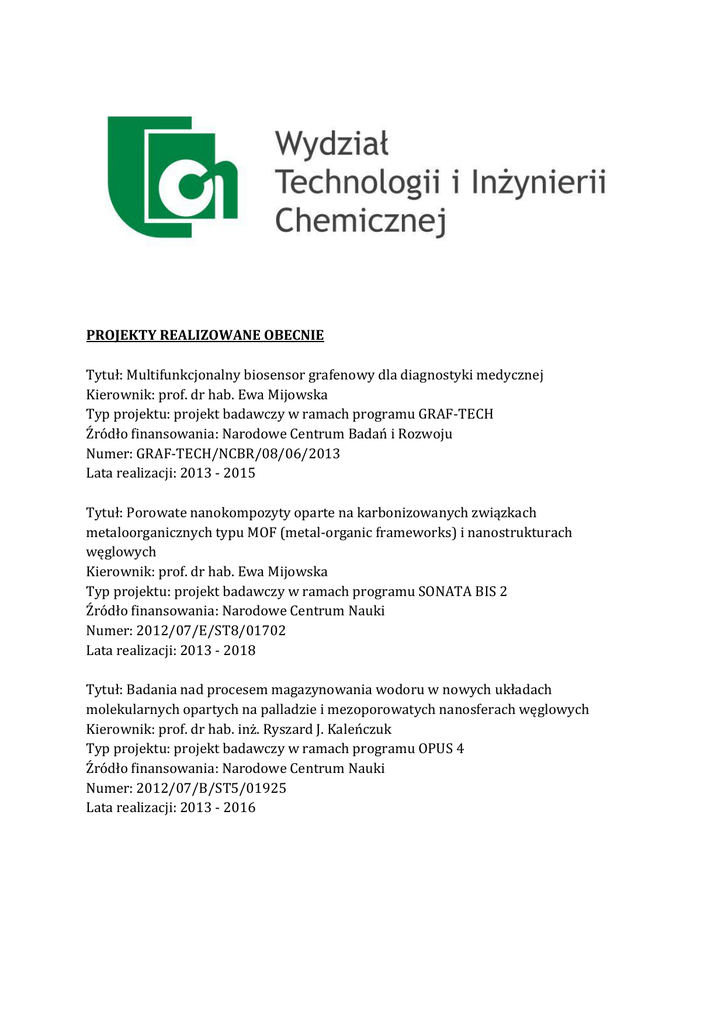 PROJEKTY REALIZOWANE OBECNIE Tytuł: Multifunkcjonalny biosensor grafenowy dla diagnostyki medycznej Kierownik: prof. dr hab. Ewa Mijowska Typ projektu: projekt badawczy w ramach programu GRAF-TECH Źródło finansowania: Narodowe Centrum Badań i Rozwoju Numer: GRAF-TECH/NCBR/08/06/2013 Lata realizacji: 2013 - 2015 Tytuł: Porowate nanokompozyty oparte na karbonizowanych związkach metaloorganicznych typu MOF (metal-organic frameworks) i nanostrukturach węglowych Kierownik: prof. dr hab. Ewa Mijowska Typ projektu: projekt badawczy w ramach programu SONATA BIS 2 Źródło finansowania: Narodowe Centrum Nauki Numer: 2012/07/E/ST8/01702 Lata realizacji: 2013 - 2018 Tytuł: Badania nad procesem magazynowania wodoru w nowych układach molekularnych opartych na palladzie i mezoporowatych nanosferach węglowych Kierownik: prof. dr hab. inż. Ryszard J. Kaleńczuk Typ projektu: projekt badawczy w ramach programu OPUS 4 Źródło finansowania: Narodowe Centrum Nauki Numer: 2012/07/B/ST5/01925 Lata realizacji: 2013 - 2016 PROJEKTY LIDER Projekty zakończone w roku 2013: Tytuł: Opracowanie procesu produkcji ekstrakcyjnego kwasu fosforowego metodą dwuwodzianowo-półwodzianową Kierownik: dr inż. Bogumił Kic Typ projektu: badawczy własny Źródło finansowania: Ministerstwo Nauki i Szkolnictwa Wyższego Numer: N N 209 217538 Lata realizacji: 2010 - 2013 Tytuł: Biotechnologiczna konwersja glicerolu do polioli i kwasów dikarboksylowych Kierownik: dr hab inż. Marek Gryta Typ projektu: Projekt w ramach Programu Operacyjnego Innowacyjna Gospodarka (2007-2013) Źródło finansowania: Europejski Fundusz Rozwoju Regionalnego (85%), Budżet Państwa (15%) Numer: PO IG 01.01.02-00-074/09 Lata realizacji: 2007– 2013 Informacje o projekcie: www pl eng Tytuł: Określenie wpływu ditlenku tytanu indukowanego światłem i aktywności wody na wzrost grzybów występujących w środowisku pomieszczeń zamkniętych Kierownik:dr inż. Agata Markowska-Szczupak Typ projektu: Źródło finansowania: Ministerstwo Nauki i Szkolnictwa Wyższego Numer: N N 209 106439 Lata realizacji: 2010 – 2013 Projekty zakończone w roku 2011: Tytuł: Badanie separacji etanolu w bioreaktorze membranowym Kierownik: dr hab. inż. Marek Gryta Typ projektu: Źródło finansowania: Ministerstwo Nauki i Szkolnictwa Wyższego Numer: N N209 114637 Lata realizacji: 2009 – 2011 Tytuł: Badanie aktywności katalitycznej systemów platyna-tlenek ceru w reakcji utleniania tlenku węgla Kierownik: dr inż. Rafał J. Wróbel Typ projektu: habilitacyjny Źródło finansowania: Ministerstwo Nauki i Szkolnictwa Wyższego Numer: N N209 336737 Lata realizacji: 2009 – 2011 Tytuł: Otrzymywanie kompozytów polimerowych z dodatkiem nanorurek węglowych o właściwościach magnetycznych i polepszonych właściwościach mechanicznych Kierownik: dr inż. Iwona Pełech Typ projektu: badawczy własny Źródło finansowania: Ministerstwo Nauki i Szkolnictwa Wyższego Numer: N N205 112135 Lata realizacji: 2008 – 2011 Tytuł: Nowe katalizatory do usuwania SO2 z gazów odlotowych oparte na nanokompozytach C-Fe(Pt) Kierownik: prof. dr hab. inż. Urszula Narkiewicz Typ projektu: badawczy własny Źródło finansowania: Ministerstwo Nauki i Szkolnictwa Wyższego Numer: N N205 018034 Lata realizacji: 2008 – 2011 Tytuł: Wytwarzanie pigmentu ditlenku tytanu o wysokiej fotostabilności Kierownik: dr hab. inż. Barbara Grzmil, prof. ndzw. ZUT Typ projektu: badawczy własny Źródło finansowania: Ministerstwo Nauki i Szkolnictwa Wyższego Numer: N N205 100535 Lata realizacji: 2008 – 2011 Tytuł: Badanie procesu fotokatalityznego otrzymywania wodoru w środowisku ścieków organicznych Kierownik:dr inż. Beata Zielińska Typ projektu: badawczy własny Źródło finansowania: Ministerstwo Nauki i Szkolnictwa Wyższego Numer: N523 025 32/0983 Lata realizacji: 2008 – 2011 Tytuł: Badania nad możliwością fotokatalitycznej konwersji materii organicznej do użytecznych węglowodorów. Opracowanie podstaw nowej technologii wytwarzania biogazu Kierownik: dr inż. Sylwia Mozia Typ projektu: badawczy własny Źródło finansowania: Ministerstwo Nauki i Szkolnictwa Wyższego Numer: NN523413435 Lata realizacji: 2008 – 2011 Tytuł: Jednoetapowa metoda otrzymywania adsorbentów węglowych o kontrolowanej strukturze porowatej do usuwania zanieczyszczeń w szerokim zakresie mas cząsteczkowych Kierownik: dr inż. Jacek Przepiórski Typ projektu: badawczy własny Źródło finansowania: Ministerstwo Nauki i Szkolnictwa Wyższego Numer: NN205012734 Lata realizacji: 2008 – 2011 Projekty zakończone w roku 2010: Tytuł: Niskotemperaturowa aktywacja metanu w oleum Kierownik: dr hab. inż. Beata Michalkiewicz Typ projektu: badawczy własny Źródło finansowania: Ministerstwo Nauki i Szkolnictwa Wyższego Numer: 205 3705 33 Lata realizacji: 2007 – 2010 Tytuł: Otrzymywanie nawozów o kontrolowanym uwalnianiu składników odżywczych przy zastosowaniu polimerów biodegradowalnych Kierownik: dr inż. Krzysztof Lubkowski Typ projektu: badawczy własny Źródło finansowania: Ministerstwo Nauki i Szkolnictwa Wyższego Numer: N 205 038 32/2216 Lata realizacji: 2007 – 2010 Tytuł: Multi-functional carbon nanotubes for biomedical applications Kierownik: dr hab. Ewa Borowiak-Paleń Typ projektu: projekt Europejski 6 P.R. Źródło finansowania: projekt Europejski 6 P.R. Numer: MRTN-CT-2006-035616 Lata realizacji: 2006 – 2010 Tytuł: Multifunkcjonalne nanorurki węglowe dla biomedycznego zastosowania Kierownik: dr hab. Ewa Borowiak-Paleń Typ projektu: dofinansowanie projektu MRTN-CT-2006-035616 Źródło finansowania: Ministerstwo Nauki i Szkolnictwa Wyższego Numer: 295/6.PR UE/2006/7 Lata realizacji: 2006 – 2010 Tytuł: Katalizatory syntezy amoniaku na bazie nanokrystalicznego kobaltu dodatkowo promotowanego manganem i chromem Kierownik: dr inż. Zofia Lendzion-Bieluń Typ projektu: badawczy własny Źródło finansowania: Ministerstwo Nauki i Szkolnictwa Wyższego