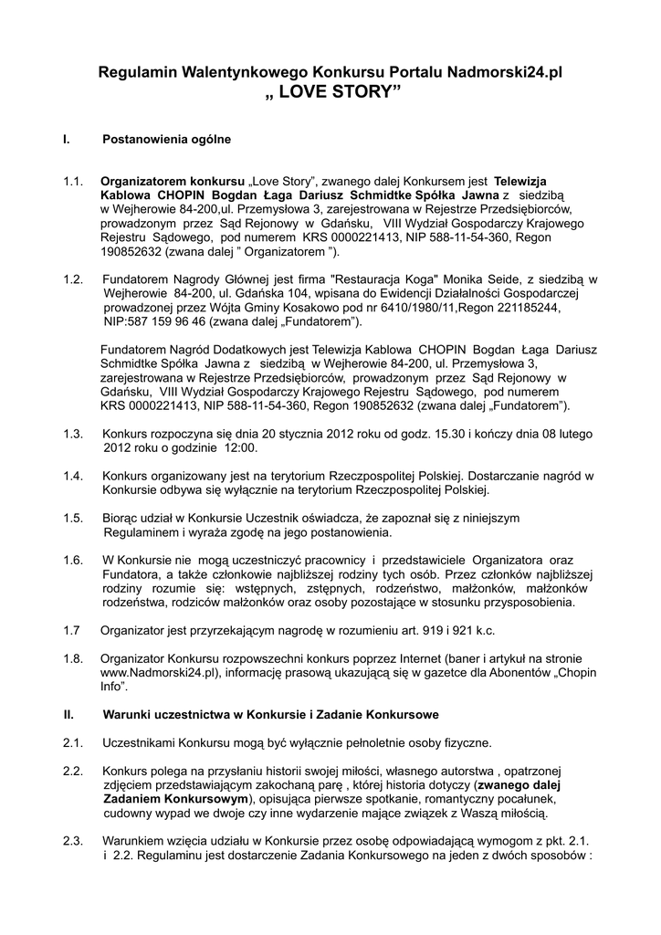 Regulamin Walentynkowego Konkursu Portalu Nadmorski24.pl „ LOVE STORY” I. Postanowienia ogólne 1.1. Organizatorem konkursu „Love Story”, zwanego dalej Konkursem jest Telewizja Kablowa CHOPIN Bogdan Łaga Dariusz Schmidtke Spółka Jawna z siedzibą w Wejherowie 84-200,ul. Przemysłowa 3, zarejestrowana w Rejestrze Przedsiębiorców, prowadzonym przez Sąd Rejonowy w Gdańsku, VIII Wydział Gospodarczy Krajowego Rejestru Sądowego, pod numerem KRS 0000221413, NIP 588-11-54-360, Regon 190852632 (zwana dalej ” Organizatorem ”). 1.2. Fundatorem Nagrody Głównej jest firma "Restauracja Koga" Monika Seide, z siedzibą w Wejherowie 84-200, ul. Gdańska 104, wpisana do Ewidencji Działalności Gospodarczej prowadzonej przez Wójta Gminy Kosakowo pod nr 6410/1980/11,Regon 221185244, NIP:587 159 96 46 (zwana dalej „Fundatorem”). Fundatorem Nagród Dodatkowych jest Telewizja Kablowa CHOPIN Bogdan Łaga Dariusz Schmidtke Spółka Jawna z siedzibą w Wejherowie 84-200, ul. Przemysłowa 3, zarejestrowana w Rejestrze Przedsiębiorców, prowadzonym przez Sąd Rejonowy w Gdańsku, VIII Wydział Gospodarczy Krajowego Rejestru Sądowego, pod numerem KRS 0000221413, NIP 588-11-54-360, Regon 190852632 (zwana dalej „Fundatorem”). 1.3. Konkurs rozpoczyna się dnia 20 stycznia 2012 roku od godz. 15.30 i kończy dnia 08 lutego 2012 roku o godzinie 12:00. 1.4. Konkurs organizowany jest na terytorium Rzeczpospolitej Polskiej. Dostarczanie nagród w Konkursie odbywa się wyłącznie na terytorium Rzeczpospolitej Polskiej. 1.5. Biorąc udział w Konkursie Uczestnik oświadcza, że zapoznał się z niniejszym Regulaminem i wyraża zgodę na jego postanowienia. 1.6. W Konkursie nie mogą uczestniczyć pracownicy i przedstawiciele Organizatora oraz Fundatora, a także członkowie najbliższej rodziny tych osób. Przez członków najbliższej rodziny rozumie się: wstępnych, zstępnych, rodzeństwo, małżonków, małżonków rodzeństwa, rodziców małżonków oraz osoby pozostające w stosunku przysposobienia. 1.7 Organizator jest przyrzekającym nagrodę w rozumieniu art. 919 i 921 k.c. 1.8. Organizator Konkursu rozpowszechni konkurs poprzez Internet (baner i artykuł na stronie www.Nadmorski24.pl), informację prasową ukazującą się w gazetce dla Abonentów „Chopin Info”. II. Warunki uczestnictwa w Konkursie i Zadanie Konkursowe 2.1. Uczestnikami Konkursu mogą być wyłącznie pełnoletnie osoby fizyczne. 2.2. Konkurs polega na przysłaniu historii swojej miłości, własnego autorstwa , opatrzonej zdjęciem przedstawiającym zakochaną parę , której historia dotyczy (zwanego dalej Zadaniem Konkursowym), opisująca pierwsze spotkanie, romantyczny pocałunek, cudowny wypad we dwoje czy inne wydarzenie mające związek z Waszą miłością. 2.3. Warunkiem wzięcia udziału w Konkursie przez osobę odpowiadającą wymogom z pkt. 2.1. i 2.2. Regulaminu jest dostarczenie Zadania Konkursowego na jeden z dwóch sposobów : a) przesłać historię swojej miłości własnego autorstwa wraz ze zdjęciem na adres e- mailowy [email protected]. Prawidłowy e-mail musi zawierać oprócz odpowiedzi na Zadanie Konkursowe również dodatkowo imię, nazwisko uczestnika Konkursu, adres zamieszkania, e-mail zwrotny, numer telefonu, wiek oraz akceptację warunków regulaminu. Wg wzoru: W TEMACIE e-mail napisać: • IMIĘ i NAZWISKO + KONKURS WALENTYNKOWY (np. Jan Kowalski, KONKURS WALENTYNKOWY ) W TREŚCI e-mail podać: • IMIĘ i NAZWISKO • ADRES ZAMIESZKANIA • ODPOWIEDŹ NA ZADANIE KONKURSOWE • WIEK • NUMER TELEFONU • AKCEPTACJĘ WARUNKÓW REGULAMINU • OŚWIADCZENIE UCZESTNIKA KONKURSU potwierdzające jego prawa autorskie (np. "Potwierdzam swoje prawa autorskie do nadesłanego Zadania Konkursowego - JAN KOWALSKI") lub b) przynieść je osobiście do siedziby Telewizji Kablowej Chopin w Wejherowie, ul. Przemysłowa 3, w formie elektronicznej – na płycie CD lub DVD w formacie jpg. Z dołączonymi informacjami (wg wzoru jak w pkt.2.3.a). 2.4. Zgłoszenie do udziału w Konkursie, dokonane zgodnie z punktem poprzedzającym, musi nastąpić nie wcześniej niż dnia 20 stycznia 2012 od godz.15.30 i nie później niż dnia 8 lutego 2012 do godziny 12.00. Zgłoszenia wcześniejsze lub późniejsze nie będą brane pod uwagę w ramach Konkursu. 2.5. Każdy Uczestnik w czasie trwania Konkursu może przesłać nie więcej niż jeden e-mail z Zadaniem Konkursowym. Jeżeli Uczestnik prześle w czasie trwania Konkursu kilka e-maili, wówczas tylko pierwszy z nich będzie brany pod uwagę w ramach Konkursu. 2.6. W Konkursie nie będą uwzględniane nadesłane Zadania Konkursowe, które nie zostały wykonane osobiście przez Uczestnika Konkursu oraz gdy będą one zawierały treść powszechnie uznaną za wulgarną lub obraźliwą albo naruszającą dobra osobiste lub prawa osób trzecich. Organizator zastrzega sobie prawo do usunięcia Zadania Konkursowego Uczestnika konkursu , który dopuścił się takiego naruszenia. Działania Organizatora w określonym powyżej zakresie nie wymagają dla swej ważności przesłania do Uczestnika jakiegokolwiek oświadczenia. 2.7 W ramach przystąpienia do konkursu uczestnik oświadcza, że: • posiada pełnię praw autorskich, osobistych i majątkowych do zamieszczonego przez niego Zadania Konkursowego; • zgłoszone do konkursu Zadanie Konkursowe nie narusza praw osób trzecich, w szczególności praw majątkowych i osobistych, a także praw autorskich innych podmiotów; • posiada zgodę osób, których wizerunek utrwalono na Zadaniu Konkursowym i jest uprawniony do wykorzystania tego wizerunku, opublikowania go i publicznej prezentacji; • udziela Organizatorowi bezterminowej i nieodpłatnej licencji na korzystanie z Zadania Konkursowego w celu jego publikacji na stronie internetowej Organizatora oraz materiałach reklamowych, bez ograniczeń czasowych i terytorialnych. • udziela dobrowolnie nieodpłatnej zgody na ukazywanie swojego wizerunku w formie dr