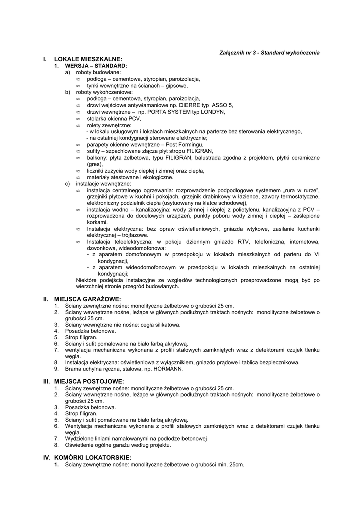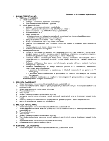 Załącznik nr 3 - Standard wykończenia I. LOKALE MIESZKALNE: 1. WERSJA – STANDARD: a) roboty budowlane: • podłoga – cementowa, styropian, paroizolacja, • tynki wewnętrzne na ścianach – gipsowe, b) roboty wykończeniowe: • podłoga – cementowa, styropian, paroizolacja, • drzwi wejściowe antywłamaniowe np. DIERRE typ ASSO 5, • drzwi wewnętrzne – np. PORTA SYSTEM typ LONDYN, • stolarka okienna PCV, • rolety zewnętrzne: - w lokalu usługowym i lokalach mieszkalnych na parterze bez sterowania elektrycznego, - na ostatniej kondygnacji sterowane elektrycznie; • parapety okienne wewnętrzne – Post Formingu, • sufity – szpachlowane złącza płyt stropu FILIGRAN, • balkony: płyta Ŝelbetowa, typu FILIGRAN, balustrada zgodna z projektem, płytki ceramiczne (gres), • liczniki zuŜycia wody ciepłej i zimnej oraz ciepła, • materiały atestowane i ekologiczne. c) instalacje wewnętrzne: • instalacja centralnego ogrzewania: rozprowadzenie podpodłogowe systemem „rura w rurze”, grzejniki płytowe w kuchni i pokojach, grzejnik drabinkowy w łazience, zawory termostatyczne, elektroniczny podzielnik ciepła (usytuowany na klatce schodowej), • instalacja wodno – kanalizacyjna: wody zimnej i ciepłej z polietylenu, kanalizacyjna z PCV – rozprowadzona do docelowych urządzeń, punkty poboru wody zimnej i ciepłej – zaślepione korkami. • Instalacja elektryczna: bez opraw oświetleniowych, gniazda wtykowe, zasilanie kuchenki elektrycznej – trójfazowe. • Instalacja teleelektryczna: w pokoju dziennym gniazdo RTV, telefoniczna, internetowa, dzwonkowa, wideodomofonowa: - z aparatem domofonowym w przedpokoju w lokalach mieszkalnych od parteru do VI kondygnacji, - z aparatem wideodomofonowym w przedpokoju w lokalach mieszkalnych na ostatniej kondygnacji; Niektóre podejścia instalacyjne ze względów technologicznych przeprowadzone mogą być po wierzchniej stronie przegród budowlanych. II. MIEJSCA GARAśOWE: 1. 2. 3. 4. 5. 6. 7. 8. 9. Ściany zewnętrzne nośne: monolityczne Ŝelbetowe o grubości 25 cm. Ściany wewnętrzne nośne, leŜące w głównych podłuŜnych traktach nośnych: monolityczne Ŝelbetowe o grubości 25 cm. Ściany wewnętrzne nie nośne: cegła silikatowa. Posadzka betonowa. Strop filigran. Ściany i sufit pomalowane na biało farbą akrylową. wentylacja mechaniczna wykonana z profili stalowych zamkniętych wraz z detektorami czujek tlenku węgla. Instalacja elektryczna: oświetleniowa z wyłącznikiem, gniazdo prądowe i tablica bezpiecznikowa. Brama uchylna ręczna, stalowa, np. HÖRMANN. III. MIEJSCA POSTOJOWE: 1. 2. 3. 4. 5. 6. 7. 8. Ściany zewnętrzne nośne: monolityczne Ŝelbetowe o grubości 25 cm. Ściany wewnętrzne nośne, leŜące w głównych podłuŜnych traktach nośnych: monolityczne Ŝelbetowe o grubości 25 cm. Posadzka betonowa. Strop filigran. Ściany i sufit pomalowane na biało farbą akrylową. Wentylacja mechaniczna wykonana z profili stalowych zamkniętych wraz z detektorami czujek tlenku węgla. Wydzielone liniami namalowanymi na podłodze betonowej Oświetlenie ogólne garaŜu według projektu. IV. KOMÓRKI LOKATORSKIE: 1. Ściany zewnętrzne nośne: monolityczne Ŝelbetowe o grubości min. 25cm. 2. 3. 4. 5. 6. 7. 8. Ściany murowane: z bloczków silikatowych 8.0 cm na zaprawie cienkowarstwowej. Ściany do wysokości 1,0m – pełne, a wyŜej aŜurowe. Posadzka betonowa. Strop filigran. Ściany i sufit pomalowane na biało farbą akrylową. Instalacja elektryczna: punkt świetlny z wyłącznikiem. Drzwi przesuwne albo roleta (lub drzwi np. PORTA SYSTEM typ LONDYN). V. LOKALE UśYTKOWE: 1. 2. 3. 4. 5. 6. 7. 8. 9. 10. 11. 12. Drzwi wejściowe aluminiowe. Brak ościeŜnic i drzwi wewnętrznych. Podłoga – cementowa. Brak tynków wewnętrznych. Ślusarka okienna aluminiowa. W pomieszczeniach sanitarnych instalacja wodna z polietylenu, instalacja kanalizacyjna z PCV. Instalacja elektryczna ograniczona do skrzynki rozdzielczej, bez rozprowadzenia. Instalacja centralnego ogrzewania – rozprowadzenie w systemie „rura w rurze” bez grzejników. Instalacja telefoniczna zakończona gniazdem telefonicznym. Zapewniona moŜliwość wpięcia do systemu zbiorczej anteny RTV. W lokalach zamontowany domofon. Wentylacja pomieszczeń – grawitacyjna. KaŜda z pozycji będzie zastosowana, o ile przewidziano ją w dokumentacji dla konkretnego rodzaju Przedmiotu Umowy. W związku z dąŜeniem do ciągłego ulepszania produktu, DEWELOPER zastrzega sobie prawo do zmian opisanego wykończenia Przedmiotu Umowy na elementy i systemy o porównywalnej jakości i standardzie. DEWELOPER ZAMAWIAJĄCY ...................................................................................... ...................................................................................... (pieczątka, podpis) (czytelny podpis)