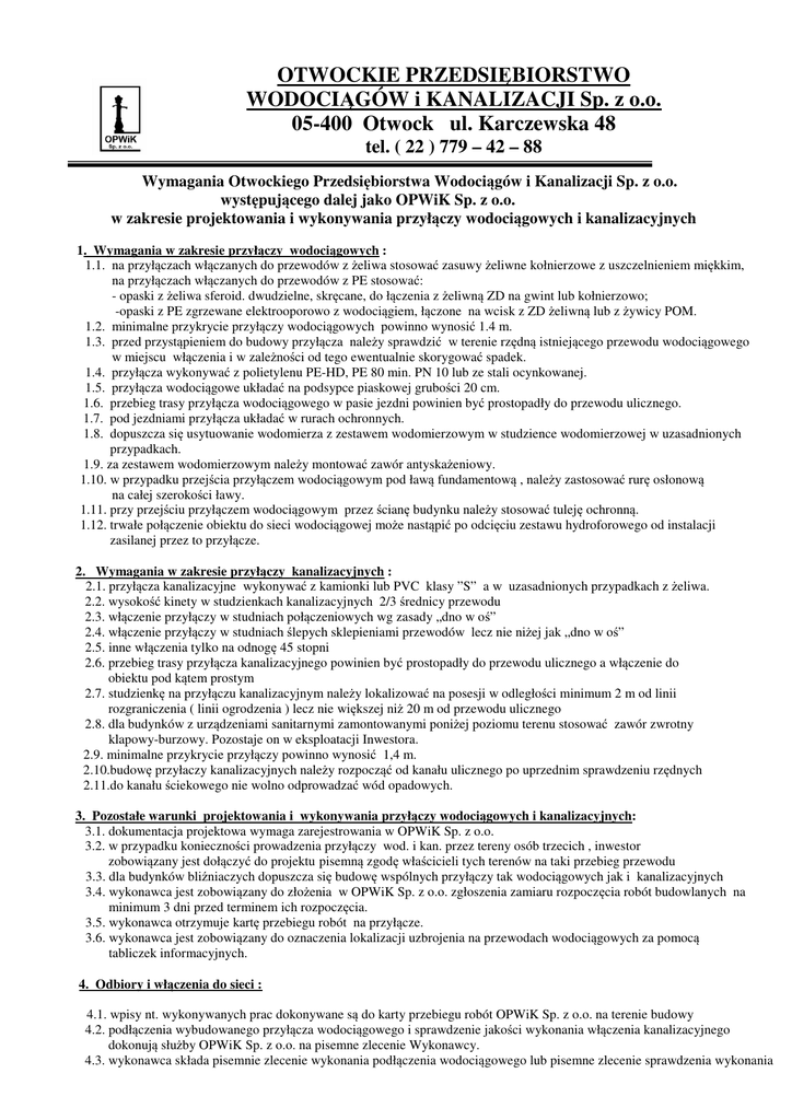 OTWOCKIE PRZEDSIĘBIORSTWO WODOCIĄGÓW i KANALIZACJI Sp. z o.o. 05-400 Otwock ul. Karczewska 48 tel. ( 22 ) 779 – 42 – 88 Wymagania Otwockiego Przedsiębiorstwa Wodociągów i Kanalizacji Sp. z o.o. występującego dalej jako OPWiK Sp. z o.o. w zakresie projektowania i wykonywania przyłączy wodociągowych i kanalizacyjnych 1. Wymagania w zakresie przyłączy wodociągowych : 1.1. na przyłączach włączanych do przewodów z żeliwa stosować zasuwy żeliwne kołnierzowe z uszczelnieniem miękkim, na przyłączach włączanych do przewodów z PE stosować: - opaski z żeliwa sferoid. dwudzielne, skręcane, do łączenia z żeliwną ZD na gwint lub kołnierzowo; -opaski z PE zgrzewane elektrooporowo z wodociągiem, łączone na wcisk z ZD żeliwną lub z żywicy POM. 1.2. minimalne przykrycie przyłączy wodociągowych powinno wynosić 1.4 m. 1.3. przed przystąpieniem do budowy przyłącza należy sprawdzić w terenie rzędną istniejącego przewodu wodociągowego w miejscu włączenia i w zależności od tego ewentualnie skorygować spadek. 1.4. przyłącza wykonywać z polietylenu PE-HD, PE 80 min. PN 10 lub ze stali ocynkowanej. 1.5. przyłącza wodociągowe układać na podsypce piaskowej grubości 20 cm. 1.6. przebieg trasy przyłącza wodociągowego w pasie jezdni powinien być prostopadły do przewodu ulicznego. 1.7. pod jezdniami przyłącza układać w rurach ochronnych. 1.8. dopuszcza się usytuowanie wodomierza z zestawem wodomierzowym w studzience wodomierzowej w uzasadnionych przypadkach. 1.9. za zestawem wodomierzowym należy montować zawór antyskażeniowy. 1.10. w przypadku przejścia przyłączem wodociągowym pod ławą fundamentową , należy zastosować rurę osłonową na całej szerokości ławy. 1.11. przy przejściu przyłączem wodociągowym przez ścianę budynku należy stosować tuleję ochronną. 1.12. trwałe połączenie obiektu do sieci wodociągowej może nastąpić po odcięciu zestawu hydroforowego od instalacji zasilanej przez to przyłącze. 2. Wymagania w zakresie przyłączy kanalizacyjnych : 2.1. przyłącza kanalizacyjne wykonywać z kamionki lub PVC klasy ”S” a w uzasadnionych przypadkach z żeliwa. 2.2. wysokość kinety w studzienkach kanalizacyjnych 2/3 średnicy przewodu 2.3. włączenie przyłączy w studniach połączeniowych wg zasady „dno w oś” 2.4. włączenie przyłączy w studniach ślepych sklepieniami przewodów lecz nie niżej jak „dno w oś” 2.5. inne włączenia tylko na odnogę 45 stopni 2.6. przebieg trasy przyłącza kanalizacyjnego powinien być prostopadły do przewodu ulicznego a włączenie do obiektu pod kątem prostym 2.7. studzienkę na przyłączu kanalizacyjnym należy lokalizować na posesji w odległości minimum 2 m od linii rozgraniczenia ( linii ogrodzenia ) lecz nie większej niż 20 m od przewodu ulicznego 2.8. dla budynków z urządzeniami sanitarnymi zamontowanymi poniżej poziomu terenu stosować zawór zwrotny klapowy-burzowy. Pozostaje on w eksploatacji Inwestora. 2.9. minimalne przykrycie przyłączy powinno wynosić 1,4 m. 2.10.budowę przyłaczy kanalizacyjnych należy rozpocząć od kanału ulicznego po uprzednim sprawdzeniu rzędnych 2.11.do kanału ściekowego nie wolno odprowadzać wód opadowych. 3. Pozostałe warunki projektowania i wykonywania przyłączy wodociągowych i kanalizacyjnych: 3.1. dokumentacja projektowa wymaga zarejestrowania w OPWiK Sp. z o.o. 3.2. w przypadku konieczności prowadzenia przyłączy wod. i kan. przez tereny osób trzecich , inwestor zobowiązany jest dołączyć do projektu pisemną zgodę właścicieli tych terenów na taki przebieg przewodu 3.3. dla budynków bliźniaczych dopuszcza się budowę wspólnych przyłączy tak wodociągowych jak i kanalizacyjnych 3.4. wykonawca jest zobowiązany do złożenia w OPWiK Sp. z o.o. zgłoszenia zamiaru rozpoczęcia robót budowlanych na minimum 3 dni przed terminem ich rozpoczęcia. 3.5. wykonawca otrzymuje kartę przebiegu robót na przyłącze. 3.6. wykonawca jest zobowiązany do oznaczenia lokalizacji uzbrojenia na przewodach wodociągowych za pomocą tabliczek informacyjnych. 4. Odbiory i włączenia do sieci : 4.1. wpisy nt. wykonywanych prac dokonywane są do karty przebiegu robót OPWiK Sp. z o.o. na terenie budowy 4.2. podłączenia wybudowanego przyłącza wodociągowego i sprawdzenie jakości wykonania włączenia kanalizacyjnego dokonują służby OPWiK Sp. z o.o. na pisemne zlecenie Wykonawcy. 4.3. wykonawca składa pisemnie zlecenie wykonania podłączenia wodociągowego lub pisemne zlecenie sprawdzenia wykonania włączenia kanalizacyjnego, minimum na jeden dzień przed proponowaną datą wykonania usługi, dołączając oświadczenie o wykonaniu przyłącza zgodnie z dokumentacją projektową zaopiniowaną w OPWiK. Sp. z o.o. 4.4. wykonawca zabezpiecza front robót. W przypadku stwierdzenia przez służby OPWiK Sp. z o.o. nieodpowiedniego przygotowania frontu robót, może nastąpić odmowa ( potwierdzona wpisem do karty przebiegu robót OPWiK Sp. z o.o. ) wykonania wcinki wodociągowej lub sprawdzenia włączenia kanalizacyjnego 4.5. po wykonaniu podłączenia, pracownicy OPWiK Sp. z o.o. dokonują płukania przyłącza z zanieczyszczeń stałych i montują wodomierz 4.6. na zlecenie Wykonawcy, służby OPWiK Sp. z o.o. pobierają wodę i wykonują jej badania bakteriologiczne Po pobraniu próbek wody , służby OPWiK Sp. z o.o. zamykają zasuwę domową 4.7. po uzyskaniu pozytywnych wyników badania wody , pracownicy służb eksploatacyjnych OPWiK Sp. z o.o. dokonują otwarcia zasuwy, stwierdzając tym samym możliwość korzystania z przyłącza. Z uwagi na bezpieczeństwo ( zalanie pomieszczeń budynku ) przy otwieraniu zasuwy niezbędna jest obecność Inwestora lub jego przedstawiciela. 4.8.odbiór końcowy wykonawca zwołuje w formie pisemnej min. trzy dni robocze przed terminem odbioru dostarczając: - inwentaryzację geodezyjną przewodu z rzędnymi charakterystycznych punktów - d