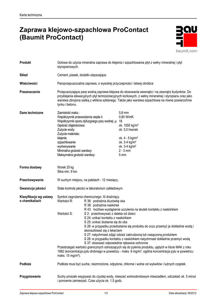 Karta techniczna Zaprawa klejowo-szpachlowa ProContact (Baumit ProContact) Produkt Gotowa do użycia mineralna zaprawa do klejenia i szpachlowania płyt z wełny mineralnej i płyt styropianowych. Skład Cement, piasek, dodatki ulepszające. Właściwości Paroprzepuszczalna zaprawa, o wysokiej przyczepności i łatwej obróbce Przeznaczenie Przepuszczająca parę wodną zaprawa klejowa do stosowania wewnątrz i na zewnątrz budynków. Do przyklejania elewacyjnych płyt termoizolacyjnych korkowych, z wełny mineralnej i styropianu oraz jako warstwa zbrojona siatką z włókna szklanego. Także jako warstwa szpachlowa na równe powierzchnie tynku i betonu. Dane techniczne Ziarnistość maks.: 0,8 mm Współczynnik przewodzenia ciepła λ: 0,80 W/mK Współczynnik oporu dyfuzyjnego pary wodnej µ: 18 Gęstość objętościowa: ok. 1550 kg/m³ Zużycie wody: ok. 5,5 l/worek Zużycie materiału: klejenie ok. 4 - 5 kg/m² szpachlowanie ok. 3-4 kg/m² ok. 3-4 kg/m² wyrównywanie Minimalna grubość warstwy: 2 - 3 mm Maksymalna grubość warstwy: 5 mm Forma dostawy Worek 25 kg Silos min. 9 ton Przechowywanie W suchym miejscu, na paletach - 12 miesięcy. Gwarancja jakości Stała kontrola jakości w laboratorium zakładowym. Klasyfikacja wg ustawy o chemikaliach Symbol zagrożenia chemicznego: Xi drażniący. Wartości R: R 36: podrażnia śluzówkę oka R 38: podrażnia naskórek R 43: możliwe wystąpienie uczulenia na skutek kontaktu z naskórkiem Wartości S: S 2: przechowywać z daleka od dzieci S 24: unikać kontaktu z naskórkiem S 25: unikać dostania się do oka S 26: w przypadku przedostania się produktu do oczu przemyć je dokładnie wodą i skonsultować się z lekarzem S 27: natychmiast zdjąć odzież zabrudzoną lub nasączoną produktem S 28: w przypadku kontaktu z naskórkiem natychmiast dokładnie przemyć wodą S 37: stosować odpowiednie rękawice ochronne Przestrzegać wartości granicznych odnoszących się do pylenia produktu, ujętych w liście MAK z roku 1992 (koncentracja pyłu drobnego w powietrzu - maks. 6 mg/m³, ogólna koncentracja pyłu w powietrzu: maks. 15 mg/m³). Podłoże Podłoże musi być suche, niezmrożone, odpylone, chłonne i wolne od wykwitów i luźnych cząstek. Przygotowanie Suchy proszek wsypywać do czystej wody, mieszać wolnoobrotowym mieszadłem, odczekać ok. 5 minut i ponownie zamieszać. Czas użycia ok. 1,5 godz. Zaprawa klejowo-szpachlowa ProContact 1/3 Data aktualizacji: 09/2012 Karta techniczna Obróbka Sposób użycia: W systemie ocieplania BAUMIT - płyty korkowe i z wełny mineralnej: Jako klej: Ściana musi być równa (± 5 mm/m). Większe nierówności należy usuwać (wyrównywać) w oddzielnej operacji. Nierówności do 10 mm wyrównywać przy użyciu zaprawy klejowej. Nierówności większe poprzez warstwę tynku. Nanosić na płytę izolacyjną w postaci ciągłego garbu na brzegach i min. 3 punktów na środku płyty. Przy równym podłożu możliwe jest także nanoszenie całopowierzchniowe pacą zębatą. Min. 24 godz. po klejeniu należy płyty termoizolacyjne dodatkowo mocować kołkami ze stalowym trzpieniem. Jako warstwa wyrównawcza: Na ułożone równo na styk i umocowane kołkami płyty termoizolacyjne nanieść najpóźniej po 14 dniach jako warstwę wyrównawczą, przy pomocy nierdzewnej packi stalowej, zaprawę klejącą o grubości warstwy co najmniej 3 mm. Jako warstwa zbrojeniowa: Po min. trzydniowej przerwie na podłoże nanieść 10-milimetrową szpachlą ząbkowaną ponownie 2 - 3 mm warstwę zaprawy klejącej. Do świeżej zaprawy wciskać pionowe pasy siatki zbrojeniowej z włókna szklanego - minimalna zakładka: 10 cm - i dodając materiał równo zaszpachlować. Siatka nie może być widoczna. Minimalna grubość warstwy szpachlowej: 2 - 3 mm. W systemie ocieplania BAUMIT - płyty styropianowe Jako klej: Powierzchnia ściany musi być równa (± 5 mm/m). Większe nierówności usuwać w oddzielnej operacji. Nierówności do 10 mm przy użyciu szpachlówki klejącej. Nierówności większe poprzez wykonanie warstwy tynku. Nanosić na płytę izolacyjną w postaci ciągłego garbu na obrzeżach i min. 3 punkty na środku płyty. Przy równym podłożu możliwe jest nanoszenie na całej powierzchni pacą zębatą. Kołkowanie płyty jest możliwe po min. 24 godzinach od klejenia. Jako warstwa szpachlowa: Na płasko ułożone na styk i przeszlifowane płyty styropianowe nanosić i wtapiać siatkę z włókna szklanego. Nierówności podłoża nie można wyrównywać warstwą zbrojoną siatki. Szczelin w płytach elewacyjnych nie wolno wypełniać szpachlówką klejącą. Jeśli warstwy zbrojeniowej nie naniesiono w ciągu 2 tygodni, należy płyty ponownie przeszlifować. Masę klejowo-szpachlową nanosić na podłoże pacą zębatą 10 mm, następnie wciskać pionowe pasy siatki zbrojeniowej z włókna szklanego - minimalny zakład siatki 10 cm -i szpachlować na równo świeżą masą klejowo-szpachlową. Siatka nie może być widoczna. Minimalna grubość szpachlówki 2 - 3 mm. Jako szpachlowanie na (starych) mineralnych elewacjach: Odpowiednio przygotować podłoże, ewentualnie zazbroić. Jako szpachlowanie na tynkach lekkich podkładowych: Np. w systemie z siatką zbrojeniową z włókna szklanego na tynk docieplający Baumit i tynk podkładowy lekki Baumit. Warstwa szpachlówki przed naniesieniem warstwy wykończeniowej musi schnąć przynajmniej 7 dni. Przy zbrojeniu podwójnym, drugą warstwę należy nałożyć najwcześniej po 1 dniu. Wskazówki: Nie pracować poniżej +5ºC, na zamrożonym podłożu lub przy zapowiedzi mrozu. Nie dodawać środków przeciwmroźnych. Zaprawa klejowo-szpachlowa ProContact 2/3 Data aktualizacji: 09/2012 Karta techniczna Powłoki wykończeniowe podkład uniwersalny Baumit UniPrimer: z tynkiem akrylowym Baumit GranoporTop z tynkiem dekoracyjnym Baumit StyleTop z tynkiem silikonowym Baumit SilikonTop z tynkiem silikatowym Baumit SilikatTop z tynkiem dekoracyjnym Bau