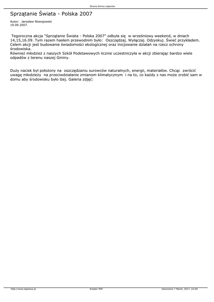 Strona Gminy Łapanów Sprzątanie Świata - Polska 2007 Autor: Jarosław Nowojowski 19.09.2007. Tegoroczna akcja "Sprzątanie Świata - Polska 2007" odbyła się w wrześniowy weekend, w dniach 14,15,16.09. Tym razem hasłem przewodnim było: Oszczędzaj. Wyłączaj. Odzyskuj. Świeć przykładem. Celem akcji jest budowanie świadomości ekologicznej oraz inicjowanie działań na rzecz ochrony środowiska. Również młodzież z naszych Szkół Podstawowych licznie uczestniczyła w akcji zbierając bardzo wiele odpadów z terenu naszej Gminy. Duży nacisk był położony na oszczędzaniu surowców naturalnych, energii, materiałów. Chcąc zwrócić uwagę młodzieży na przeciwdziałanie zmianom klimatycznym i na to, co każdy z nas może zrobić sam w domu aby środowisku było lżej. Galeria zdjęć: http://www.lapanow.pl Kreator PDF Utworzono 7 March, 2017, 22:00