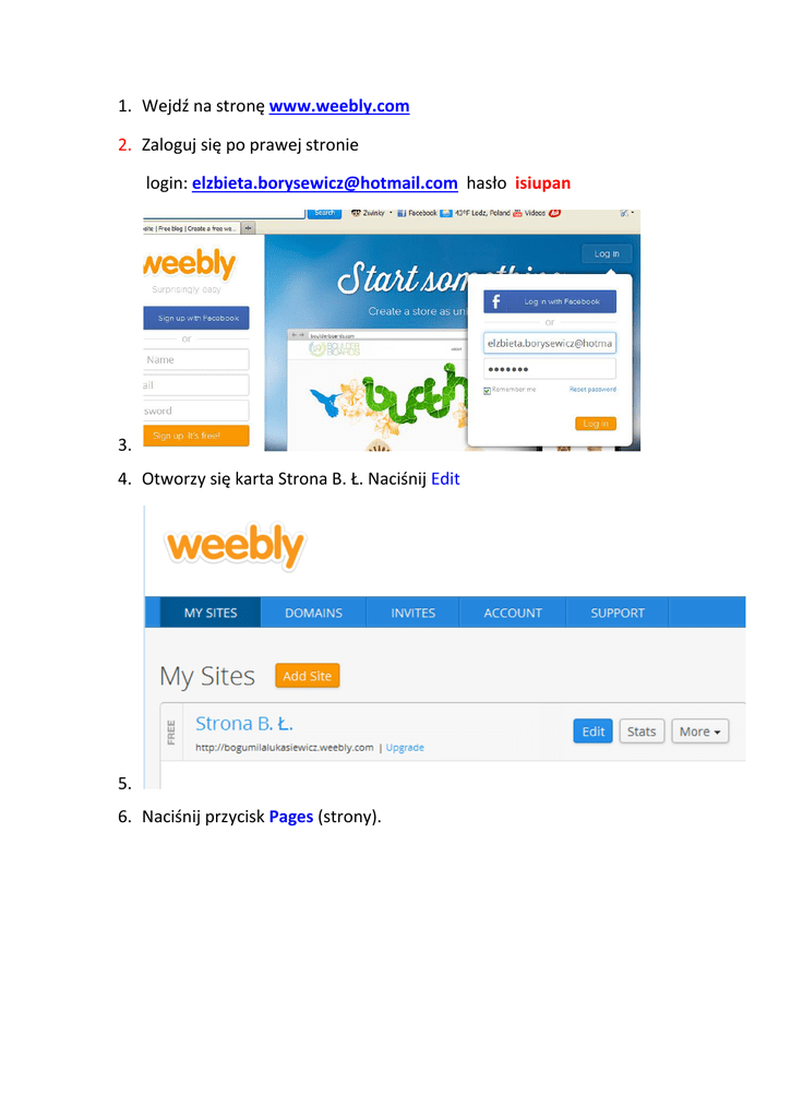 1. Wejdź na stronę www.weebly.com 2. Zaloguj się po prawej stronie login: [email protected] hasło isiupan 3. 4. Otworzy się karta Strona B. Ł. Naciśnij Edit 5. 6. Naciśnij przycisk Pages (strony). 7. 8. Po lewej stronie jest Menu wybierz Galerie Martynki 9. 10.Naciśnij Save&Edit 11. 12.Kliknij 2 x na jakieś zdjęciu np. Martynki i Isia 13. 14.Otworzy się okienko dodawania zdjęć wciśnij przycisk Add dodaj i wybierz z twojego komputera zdjęcie Martynki i Isia z serduszkiem 15.Nastepnie naciśnij przycisk Publish żeby opublikować strone 16.