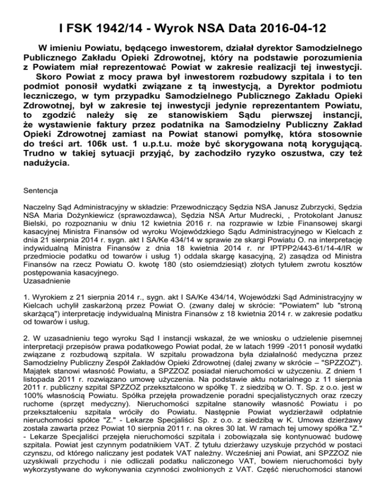 I FSK 1942/14 - Wyrok NSA Data 2016-04-12 W imieniu Powiatu, będącego inwestorem, działał dyrektor Samodzielnego Publicznego Zakładu Opieki Zdrowotnej, który na podstawie porozumienia z Powiatem miał reprezentować Powiat w zakresie realizacji tej inwestycji. Skoro Powiat z mocy prawa był inwestorem rozbudowy szpitala i to ten podmiot ponosił wydatki związane z tą inwestycją, a Dyrektor podmiotu leczniczego, w tym przypadku Samodzielnego Publicznego Zakładu Opieki Zdrowotnej, był w zakresie tej inwestycji jedynie reprezentantem Powiatu, to zgodzić należy się ze stanowiskiem Sądu pierwszej instancji, że wystawienie faktury przez podatnika na Samodzielny Publiczny Zakład Opieki Zdrowotnej zamiast na Powiat stanowi pomyłkę, która stosownie do treści art. 106k ust. 1 u.p.t.u. może być skorygowana notą korygującą. Trudno w takiej sytuacji przyjąć, by zachodziło ryzyko oszustwa, czy też nadużycia. Sentencja Naczelny Sąd Administracyjny w składzie: Przewodniczący Sędzia NSA Janusz Zubrzycki, Sędzia NSA Maria Dożynkiewicz (sprawozdawca), Sędzia NSA Artur Mudrecki, , Protokolant Janusz Bielski, po rozpoznaniu w dniu 12 kwietnia 2016 r. na rozprawie w Izbie Finansowej skargi kasacyjnej Ministra Finansów od wyroku Wojewódzkiego Sądu Administracyjnego w Kielcach z dnia 21 sierpnia 2014 r. sygn. akt I SA/Ke 434/14 w sprawie ze skargi Powiatu O. na interpretację indywidualną Ministra Finansów z dnia 18 kwietnia 2014 r. nr IPTPP2/443-61/14-4/IR w przedmiocie podatku od towarów i usług 1) oddala skargę kasacyjną, 2) zasądza od Ministra Finansów na rzecz Powiatu O. kwotę 180 (sto osiemdziesiąt) złotych tytułem zwrotu kosztów postępowania kasacyjnego. Uzasadnienie 1. Wyrokiem z 21 sierpnia 2014 r., sygn. akt I SA/Ke 434/14, Wojewódzki Sąd Administracyjny w Kielcach uchylił zaskarżoną przez Powiat O. (zwany dalej w skrócie: "Powiatem" lub "stroną skarżącą") interpretację indywidualną Ministra Finansów z 18 kwietnia 2014 r. w zakresie podatku od towarów i usług. 2. W uzasadnieniu tego wyroku Sąd I instancji wskazał, że we wniosku o udzielenie pisemnej interpretacji przepisów prawa podatkowego Powiat podał, że w latach 1999 -2011 ponosił wydatki związane z rozbudową szpitala. W szpitalu prowadzona była działalność medyczna przez Samodzielny Publiczny Zespół Zakładów Opieki Zdrowotnej (dalej zwany w skrócie – "SPZZOZ"). Majątek stanowi własność Powiatu, a SPZZOZ posiadał nieruchomości w użyczeniu. Z dniem 1 listopada 2011 r. rozwiązano umowę użyczenia. Na podstawie aktu notarialnego z 11 sierpnia 2011 r. publiczny szpital SPZZOZ przekształcono w spółkę T. z siedzibą w O. T. Sp. z o.o. jest w 100% własnością Powiatu. Spółka przejęła prowadzenie poradni specjalistycznych oraz rzeczy ruchome (sprzęt medyczny). Nieruchomości szpitalne stanowiły własność Powiatu i po przekształceniu szpitala wróciły do Powiatu. Następnie Powiat wydzierżawił odpłatnie nieruchomości spółce "Z." - Lekarze Specjaliści Sp. z o.o. z siedzibą w K. Umowa dzierżawy została zawarta przez Powiat 10 sierpnia 2011 r. na okres 30 lat. W ramach tej umowy spółka "Z." - Lekarze Specjaliści przejęła nieruchomości szpitala i zobowiązała się kontynuować budowę szpitala. Powiat jest czynnym podatnikiem VAT. Z tytułu dzierżawy uzyskuje przychód w postaci czynszu, od którego naliczany jest podatek VAT należny. Wcześniej ani Powiat, ani SPZZOZ nie uzyskiwali przychodu i nie odliczali podatku naliczonego VAT, bowiem nieruchomości były wykorzystywane do wykonywania czynności zwolnionych z VAT. Część nieruchomości stanowi środki trwałe w budowie, część stanowi ukończone gotowe środki trwałe, oddane do użytkowania w poprzednich latach i amortyzowane na podstawie przepisów o podatku dochodowym. Inwestorem był Powiat i on ponosił wydatki na budowę szpitala. Środki na budowę pochodziły z dotacji udzielanych Powiatowi oraz środków własnych Powiatu. Faktury VAT były wystawiane na SPZZOZ. Budowa szpitala należała do zadań własnych Powiatu, zgodnie z art. 4 ust. 1 ustawy z dnia 5 czerwca 1998 r. o samorządzie powiatowym (Dz.U. z 2013 r. poz. 595 ze zm.). Powiat przejął z dniem 1 stycznia 1999 r. realizację przedmiotowej inwestycji w trybie przepisów art. 74 ustawy z 13 października 1998 r. - Przepisy wprowadzające ustawy reformujące administrację publiczną (Dz.U. z 1998 r. nr 133, poz. 872 ze zm.). Na początku budowy rachunki i faktury były wystawiane na Zespół Opieki Zdrowotnej, następnie na SPZZOZ, który jako prawny następca z dniem 1 grudnia 1998 r. przejął wszelkie umowy, dokumentację, zobowiązania i należności. Następnie od 1 stycznia 1999 r. budowa szpitala przeszła na Powiat (z mocy prawa), jednak nie zmieniono nabywcy wystawianych faktur. Ponieważ inwestycja była zadaniem własnym Powiatu i miała służyć działalności medycznej, brak było prawa do odliczenia podatku VAT naliczonego zarówno dla Powiatu jak i SPZZOZ. Wówczas żaden z wymienionych podmiotów nie zwracał uwagi na błędne oznaczenie nabywcy. Ponieważ od 2011 r. zmieniło się przeznaczenie nieruchomości, są one wydzierżawione przez Powiat dla spółki "Z." - Lekarze Specjaliści i powstaje z tego tytułu przychód oraz podatek VAT należny, wnioskodawca jako czynny podatnik VAT chciałby odliczyć część podatku naliczonego. Środki trwałe oddane w dzierżawę to budynki i budowle o wartości początkowej powyżej 15.000 zł. Przedstawiając taki stan faktyczny zadano następujące pytania.: 1) czy w związku z wydzierżawieniem spółce "Z." - Lekarze Specjaliści środków trwałych (budynki i budowle, infrastruktura o wartości początkowej powyżej 15.000 zł) oraz inwestycji w budowie "Budowa szpitala powiatowego", Powiat ma prawną możliwość odliczenia podatku VAT naliczonego zawartego w zakupach dotyczących budowy budynków szpitala i infrastruktury towarzysząc