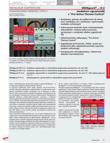 Ograniczniki kombinowane typu 1 Ograniczniki typu 1 Ograniczniki N-PE typu 1 INSTALACJE ELEKTRYCZNE OGRANICZNIKI PRZEPIĘĆ TYPU 2 Typ 2 wg PN-EN 61643-11 Klasa II wg PN-IEC 61643-1 Ograniczniki typu 2 Ograniczniki typu 3 Akcesoria DEHNguard® ... H LI modułowe ograniczniki z ‘’Pro-Active-Thermo-Control’’ • Kompletny, gotowy do podłączenia do danej sieci, składający się z podstawy i wymiennych modułów ochronnych • Jednoznaczna kontrola stanu trzystopniowym wskaźnikiem <zielony-żółty-czerwony> sprzężonym z zestykami zdalnej sygnalizacji FM • Układ kontrolno-odłączający ”Pro-ActiveThermo-Control” • Sygnalizacja przeciążenia <Żółty> przed uszkodzeniem jako zapowiedź potrzeby wymiany modułu ochronnego • Energetycznie skoordynowany z innymi produktami Czerwonej/Serii DEHNguard TNC H LI: modułowe ograniczniki ze wskaźnikiem pogorszenia parametrów, do sieci TNC DEHNguard TNS H LI: modułowe ograniczniki ze wskaźnikiem pogorszenia parametrów, do sieci TNS DEHNguard TT H LI: modułowe ograniczniki ze wskaźnikiem pogorszenia parametrów, do sieci TT i TNS (układ połączeń ”3+1”) DEHNguard T H LI: jednobiegunowe ograniczniki ze wskaźnikiem pogorszenia parametrów Jedno- i wielobiegunowe ograniczniki przepięć z rodziny DEHNguard ... H LI zapewniają najwyższe bezpieczeństwo i komfort. To pierwsze ograniczniki, które dzięki układowi Pro-Active-ThermoControl, informują użytkownika z wyprzedzeniem o spodziewanym wystąpieniu uszkodzenia modułu ochronnego. Jest to wskazane w instalacjach, które muszę spełniać najwyższe wymagania funkcjonalności, jak np. w przemyśle, rachunkowości, centrach obliczeniowych. Trójstopniowy wskaźnik optyczny <zielony-żółty-czerwony>, sprzężony z zestykami zdalnej sygnalizacji FM, informuje na bieżąco o stanie ochrony przepięciowej w instalacji. Sygnalizowanie pogorszenia parametrów (np. z powodu większego niż znamionowe obciążenie prądami udarowymi, nieodwracalnych zmian w strukturze warystora) kolorem żółtym daje użytkownikowi informację o zalecanej wymianie modułu ochronnego zanim się on uszkodzi i odłączy od sieci. Jednocześnie działa już sygnalizacja zdalna (zestyki FM). Można w ten sposób uniknąć pozostawienia instalacji bez ochrony przepięciowej ! Innym elementem bezpieczeństwa jest to, że nazwa dedykowanej sieci zawarta jest w nazwie ogranicznika przepięć do tej sieci (jak przy w przypadku innych wielobiegunowych ograniczników DEHNguard). Jest to wyrazem troski o wysokie wymagania bezpieczeństwa tak jak sama technologia trójstopniowego urządzenia kontrolno-odłączającego Pro-ActiveThermo-Control. Dodatkowo zapewniono fabrycznie mechaniczne blokady, które uniemożliwiają włączenie modułu wymiennego w nieodpowiednie miejsce. Dotyczy to zarówno jedno- jak i wielobiegunowych ograniczników oraz każdego bieguna. www.dehn.pl W tej rodzinie ograniczników są dostępne również jednobiegunowe DEHNguard T H LI do uniwersalnego zastosowania. Wszystkie wykonania DEHNguard ... H LI posiadają zestyki FM do zdalnej sygnalizacji (3 styki). Dzięki takiemu wykonaniu zestyku zdalnej sygnalizacji jako bezpotencjałowy zestyk przełączny można, zależnie od przyjętej zasady sygnalizacji, wykorzystywać te rozwierne (normalnie zamknięte) lub zwierne (normalnie otwarte). Ograniczniki z rodziny DEHNguard ... H LI wyposażone są w wielofunkcyjne zaciski w standardowej szerokości 1 modułu oraz służą do podłączania przewodów i szyn grzebieniowych jednocześnie, co pozwala na łączenie za pomocą szyn z sąsiednimi aparatami. Jednym z zastosowań jest możliwość podłączenia w optymalnym układzie V zgodnie z normą PN-HD 60634-5-534 i stosownie do zaleceń VdS 2031. Kolor żółty: zalecana wymiana modułu ochronnego 101 Ograniczniki typu 2 Do ochrony instalacji niskiego napięcia przed przepięciami. Do stosowania zgodnie ze Strefową Koncepcją Ochrony Odgromowej jako przejście pomiędzy strefami 0B – 1 i wyżej. Ograniczniki kombinowane typu 1 Ograniczniki typu 1 Ograniczniki N-PE typu 1 Ograniczniki typu 2 DEHNguard® ... H LI DEHNguard TT H LI Ograniczniki typu 3 Akcesoria INSTALACJE ELEKTRYCZNE OGRANICZNIKI PRZEPIĘĆ TYPU 2 PE Wysokość do szyny 12 11 14 L1 L2 L3 N Schemat połączeń DG TT H230 400 LI Rysunek wymiarowy DG TT H230 400 LI Ograniczniki typu 2 DG TT H LI: modułowe ograniczniki z trzystopniowym wskaźnikiem optycznym Pro-Active-Thermo-Control (zielony-żółty-czerwony) do sieci TT i TNS (układ połączeń ”3+1”) Ogranicznik przepięć wg PN-EN 61643-11 Ogranicznik przepięć wg PN-IEC 61643-1 Napięcie znamionowe AC Największe napięcie trwałej pracy AC [L-N] Największe napięcie trwałej pracy AC [N-PE] Maksymalny prąd wyładowczy (8/20) [L-N] Imax Maksymalny prąd wyładowczy (8/20) [N-PE] Prąd udarowy (10/350) [N-PE] Napięciowy poziom ochrony [L-N] Napięciowy poziom ochrony [L-N] przy 5 kA Napięciowy poziom ochrony [N-PE] Zdolność gaszenia prądu następczego [N-PE] Czas zadziałania [L-N] Czas zadziałania [N-PE] Maksymalny bezpiecznik dodatkowy Wytrzymałość zwarciowa przy maks. bezpieczniku Przepięcie dorywcze [L-N] Przepięcie dorywcze [N-PE] Przepięcia dorywcze - cecha Zakres temperatur pracy Przekroje przewodów (min.) Przekroje przewodów (maks.) Montaż Materiał obudowy Stopień ochrony Szerokość montażowa Certyfikaty Sygnalizacja uszkodzenia FM / Typ zestyku Parametry obwodu sygnalizacji AC Parametry obwodu sygnalizacji DC Przekroje przewodów sygnalizacji FM Wskaźnik działania / uszkodzenia DG TT H230 400 LI DG TT H230 400 LI385 Typ 2 Klasa II 230/400 V 275 V 255 V 65 kA 65 kA 12 kA ≤ 1,25 kV ≤ 1 kV ≤ 1,5 kV 100 Aeff ≤ 25 ns ≤ 100 ns 160 A gL/gG 20 kAeff 335 V / 5 sekund 1200 V / 200 ms wytrzymały -40°C...+55°C 1,5 mm2 drut / linka 35 mm2 wielodrutowo /25 mm2 linka szyna 35 mm wg EN 60715 Thermoplast, kolor czerwony, UL 94 V-0 IP 20 4 moduły, DIN 43880 KEMA przełączny