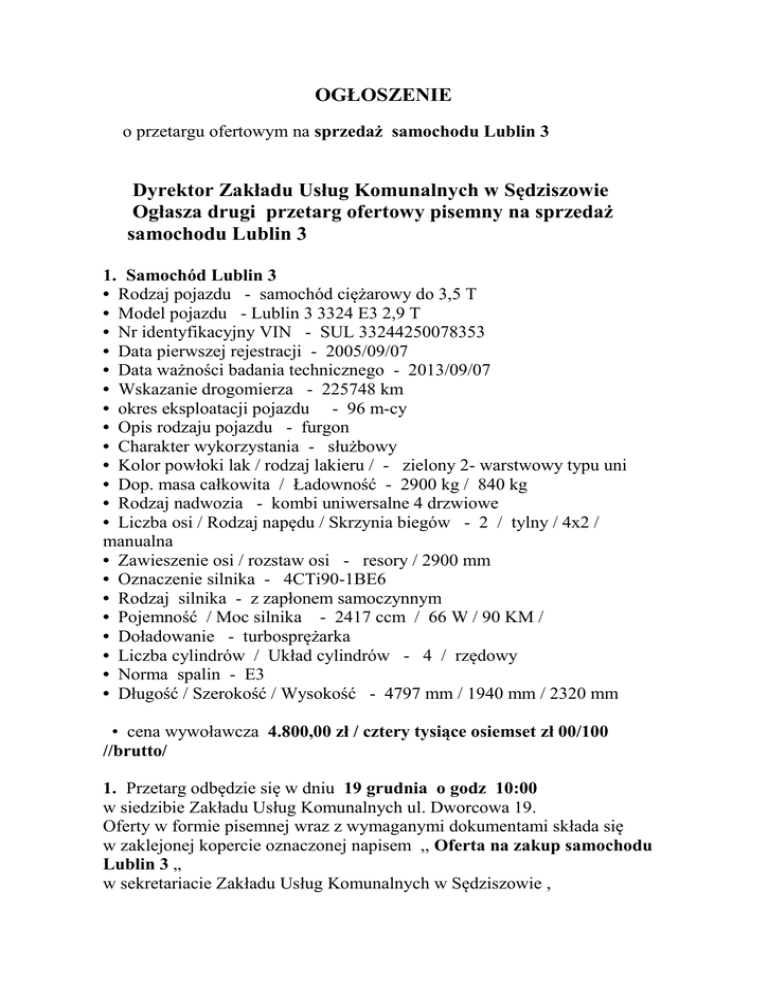 OGŁOSZENIE o przetargu ofertowym na sprzedaż samochodu Lublin 3 Dyrektor Zakładu Usług Komunalnych w Sędziszowie Ogłasza drugi przetarg ofertowy pisemny na sprzedaż samochodu Lublin 3 1. Samochód Lublin 3 • Rodzaj pojazdu - samochód ciężarowy do 3,5 T • Model pojazdu - Lublin 3 3324 E3 2,9 T • Nr identyfikacyjny VIN - SUL 33244250078353 • Data pierwszej rejestracji - 2005/09/07 • Data ważności badania technicznego - 2013/09/07 • Wskazanie drogomierza - 225748 km • okres eksploatacji pojazdu - 96 m-cy • Opis rodzaju pojazdu - furgon • Charakter wykorzystania - służbowy • Kolor powłoki lak / rodzaj lakieru / - zielony 2- warstwowy typu uni • Dop. masa całkowita / Ładowność - 2900 kg / 840 kg • Rodzaj nadwozia - kombi uniwersalne 4 drzwiowe • Liczba osi / Rodzaj napędu / Skrzynia biegów - 2 / tylny / 4x2 / manualna • Zawieszenie osi / rozstaw osi - resory / 2900 mm • Oznaczenie silnika - 4CTi90-1BE6 • Rodzaj silnika - z zapłonem samoczynnym • Pojemność / Moc silnika - 2417 ccm / 66 W / 90 KM / • Doładowanie - turbosprężarka • Liczba cylindrów / Układ cylindrów - 4 / rzędowy • Norma spalin - E3 • Długość / Szerokość / Wysokość - 4797 mm / 1940 mm / 2320 mm • cena wywoławcza 4.800,00 zł / cztery tysiące osiemset zł 00/100 //brutto/ 1. Przetarg odbędzie się w dniu 19 grudnia o godz 10:00 w siedzibie Zakładu Usług Komunalnych ul. Dworcowa 19. Oferty w formie pisemnej wraz z wymaganymi dokumentami składa się w zaklejonej kopercie oznaczonej napisem ,, Oferta na zakup samochodu Lublin 3 „ w sekretariacie Zakładu Usług Komunalnych w Sędziszowie , ul. Dworcowa 19 do dnia 19 grudnia do godz. 09 : 00 Oferta powinna zawierać : 1. nazwę i adres oferenta 2. datę sporządzenia oferty 3. określenie proponowanej ceny kupna 4. oświadczenie oferenta o zapoznaniu się z warunkami i przedmiotem przetargu 5. kopię dowodu wpłaty wadium Każdy oferent może złożyć tylko jedną ofertę . Samochód Lublin 3 zostanie sprzedany za najwyższą oferowaną cenę . W przypadku zaoferowania takiej samej ceny przez więcej niż jednego oferenta , przetarg będzie kontynuowany w formie aukcji , aż do wybrania oferenta , który zaproponuje najwyższą cenę . Oferty cenowe poniżej ceny wywoławczej nie będą rozpatrywane . Otwarcie ofert nastąpi w dniu 19 grudnia o godz. 10 : 00 w siedzibie Zakładu Usług Komunalnych , ul. Dworcowa 19 . Warunkiem przystąpienia do przetargu jest wpłacenie wymaganego wadium w wysokości 5% ceny wywoławczej danego pojazdu t.j 240,00 zł / dwieście czterdzieści 00/100 zł / . Wadium należy wpłacić najpóźniej w dniu przetargu do godz .09 :.00 przelewem na konto Zakładu Usług Komunalnych 18845000050110080099390001 lub do kasy Zakładu Usług Komunalnych z dopiskiem ,, sprzedaż samochodu Lublin 3 ‘’ Data dokonania wpłaty wadium jest datą uznania rachunku bankowego Zakładu Usług Komunalnych w Sędziszowie . Wadium wpłacone przez oferenta , który przetarg wygrał zalicza się na poczet ceny. Wadium przepada na rzecz Zakładu Usług Komunalnych jeżeli oferent , którego oferta została przyjęta uchyli się od zawarcia umowy. Pozostałym uczestnikom wadium zwraca się po zamknięciu przetargu , w terminie 7-miu dni od zamknięcia przetargu . 2. 3. Odrzuceniu podlegają oferty : 1/ złożone po wyznaczonym terminie 2/ w niewłaściwym miejscu 3/ przez oferenta , który nie wniósł wadium 4/ nie zawierające wymaganych danych i dokumentów lub są one niekompletne , nieczytelne , budzą wątpliwości – zaś złożenie wyjaśnień mogłoby prowadzić do uznania jej za nową ofertę . 4. Wartość nominalna postąpienia – 1 % ceny wywoławczej . 5. Przetarg jest ważny bez względu na liczbę uczestników , jeżeli choć jeden uczestnik zaoferuje co najmniej o jedno postąpienie powyżej ceny wywoławczej . 6. Warunkiem nabycia pojazdu jest wpłata ceny osiągniętej w przetargu w całości w ciągu 5 dni przed podpisaniem umowy . Nabywca pojazdu ponosi wszystkie koszty związane z jego nabyciem . 7. Umowa kupna – sprzedaży zostanie zawarta w terminie 7 dni od daty rozstrzygnięcia przetargu . Wydanie przedmiotu sprzedaży nastąpi po zapłaceniu ceny nabycia i zawarcia umowy kupna-sprzedaży . 8. Zakład Usług Komunalnych nie bierze odpowiedzialności za stan techniczny sprzedawanego pojazdu : samochodu Lublin 3 . Zastrzega sobie możliwość unieważnienia przetargu bez podania przyczyn. 9. Samochód Lublin można oglądać na terenie Bazy ZUK w Sędziszowie w Sędziszowie ul. Polna 9 w dniach od 9 do13 grudzień 2013 r. i od 16-18 grudzień 2013 r w godzinach od 08:00 do 14:00 ,po wcześniejszym uzgodnieniu telefonicznym . Szczegółowych informacji na temat pojazdu i wyceny rzeczoznawcy można uzyskać w siedzibie Zakładu Usług Komunalnych w Sędziszowie , ul. Dworcowa 19 lub pod numerami tel . 41 3812023 .,73147120 Sędziszów dnia 03 grudzień 2013.r. Dyrektor Zakładu Usług Komunalnych mgr inż. Wiesław Jarzyński