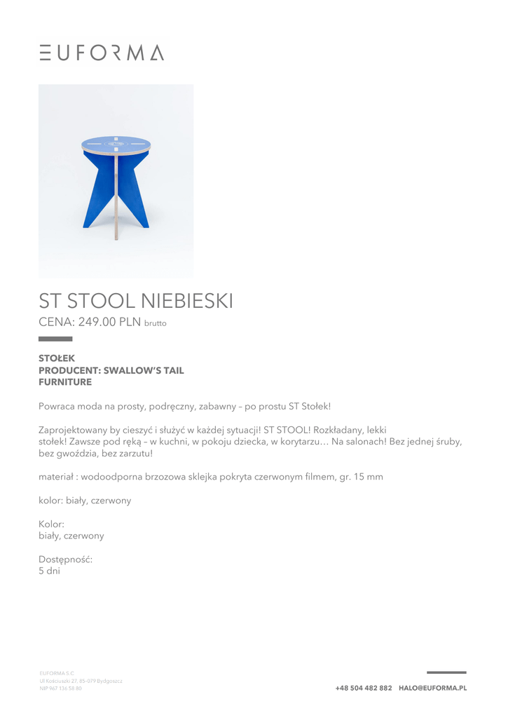 ST STOOL NIEBIESKI CENA: 249.00 PLN brutto STOŁEK PRODUCENT: SWALLOW’S TAIL FURNITURE Powraca moda na prosty, podręczny, zabawny – po prostu ST Stołek! Zaprojektowany by cieszyć i służyć w każdej sytuacji! ST STOOL! Rozkładany, lekki stołek! Zawsze pod ręką – w kuchni, w pokoju dziecka, w korytarzu… Na salonach! Bez jednej śruby, bez gwoździa, bez zarzutu! materiał : wodoodporna brzozowa sklejka pokryta czerwonym filmem, gr. 15 mm kolor: biały, czerwony Kolor: biały, czerwony Dostępność: 5 dni Powered by TCPDF (www.tcpdf.org)