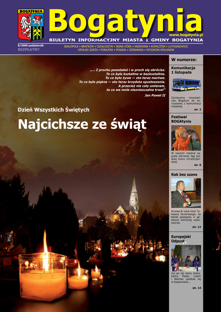 Bogatynia www.bogatynia.pl BIULETYN INFORMACYJNY MIASTA I GMINY BOGATYNIA 8/2009 październik BEZPŁATNY BIAŁOPOLE • BRATKÓW • DZIAŁOSZYN • JASNA GÓRA • KRZEWINA • KOPACZÓW • LUTOGNIEWICE OPOLNO ZDRÓJ • PORAJÓW • POSADA • SIENIAWKA • WYSZKÓW-WOLANÓW W numerze: „... Z prochu powstałeś i w proch się obrócisz. To co było kształtne w bezkształtne. To co było żywe — oto teraz martwe. To co było piękne — oto teraz brzydota spustoszenia. A przecież nie cały umieram, to co we mnie niezniszczalne trwa!” Jan Paweł II Dzień Wszystkich Świętych Najcichsze ze świąt Komunikacja 1 listopada Zachęcamy mieszkańców Bogatyni do korzystania z komunikacji miejskiej. str. 3 Festiwal BOGAtynia W naszym mieście zagrała pierwsza liga polskiej sceny chrześcijańskiej. str. 8 Rak bez szans Wykład dr nauk med. Tomasza Huzarskiego, na temat postępów w genetyce klinicznej nowotworów. str. 13 Europejski Odpust Już po raz ósmy mieszkańcy Polski, Czech i Niemiec spotkali się w Kopaczowie... str. 14 Sesja rozpoczęła się od wręczenia orderów „Przyjaciel Szkoły” za wkład włożony w uruchomienie pracowni mechatronicznej w Zespole Szkół Energetycznych i Ekonomicznych. Podziękowania na ręce burmistrza, przewodniczącego rady oraz pracowników urzędu złożył Dyrektor ZSEiE Jerzy Zając. Podczas ośmiogodzinnej sesji omówiono wiele ważnych kwestii, jednak dyskusję zdominowała tematyka Uhonorowani wyróżnieniem „Przyjaciel szkoły”: (od lewej) burmistrz Andrzej Grzmielewicz, przewodniczący Paweł Szczotka oraz wiceprzewodniczący Piotr Woeltz. „21 kwietnia Wojewoda Dolnośląski Rafał Jurkowlaniec wraz z burmistrzem Andrzejem Grzmielewiczem uroczyście otworzyli pracownię mechatroniczną i salę gimnastyczną w Zespole Szkół Energetycznych i Ekonomicznych. Fot. UMiG Bogatynia Całkowity koszt pracowni to 556 900,00 zł, natomiast 389 830,00 zł to wartość dofinansowania jakie otrzymaliśmy na realizację tego projektu w ramach Regionalnego Programu Operacyjnego Województwa Dolnośląskiego.” Sesja Rady. związana z wystąpieniami pokontrolnymi Regionalnej Izby Obrachunkowej oraz Najwyższej Izby Kontroli. Obie instytucje sprawujące nadzór nad działalnością jednostek samorządowych oraz innych organów państwowych wskazały uchy- Komisja ds. Zdrowia i Spraw Socjalnych Analizują społeczne problemy Komisja ds. Zdrowia i Spraw Socjalnych jest jedną ze stałych komisji działających przy naszej radzie. W trakcie posiedzeń zajmujemy się tematami ujętymi w rocznym planie pracy, uzupełnianymi przez bieżące problemy pojawiające się w ciągu roku, opiniujemy projekty uchwał, odpowiadamy na skierowane do nas pisma, występujemy z wnioskami. Kluczowym tematem prac komisji jest funkcjonowanie opieki medycznej na terenie miasta i gminy. Na bieżąco omawiana jest sytuacja finansowa, aktualne potrzeby, realizacja kontraktów z NFZ, kierunki restrukturyzacji szpitala oraz funkcjonowanie podstawowej opieki medycznej, w tym wiejskich ośrodków zdrowia. W związku z tym posiedzenia komisji odbywają się także na terenie szpitala oraz w wiejskich ośrodkach zdrowia. Istotnym tematem prac komisji jest funkcjonowanie Ośrodka Pomocy Społecznej oraz Ośrodka Profilaktyki i Rozwiązywania Problemów Alkoholowych. Corocznie przyjmujemy sprawozdania z działalności tych pod- miotów, omawiamy bieżące problemy, sytuację finansową. Problem uzależnień i pomoc rodzinie, bezrobocie i pomoc osobom bezrobotnym, sytuacja mieszkaniowa, wypoczynek letni i zimowy dzieci oraz młodzieży, funkcjonowanie Koła Pomocy Dzieciom Niepełnosprawnym Ruchowo, Domu Dziennego Pobytu Osób Niepełnosprawnych oraz Seniorów w Bogatyni, punktu i Klubu Honorowych Dawców Krwi – to kolejne sprawy, którymi zajmuje się komisja. Wszystkie te problemy są bardzo istotne dla mieszkań- bienia w jednostkach, które podlegały kontroli. Jak wyjaśniła Skarbnik Gminy Bogumiła Wysocka, większość z nich została skorygowana podczas kontroli. Następnie Przewodniczący Rady Gminy i Miasta Bogaców naszej gminy, wymagają stałej analizy, zaangażowania, często pomocy, także finansowej ze strony burmistrza i rady. Analizując naszą pracę najbardziej satysfakcjonującym osiągnięciem jest fakt ciągłego funkcjonowania naszego szpitala. Cieszy nas, iż nie doszło np. do jego sprzedaży. Kosztowało to nas wiele „walki”. Szkoda natomiast, że przerwane zostały negocjacje z SP ZOZ w Zgorzelcu, myślę, że należy do nich wrócić. Nie udało się do tej pory znaleźć godnej, samodzielnej i nie ograniczonej barierami siedziby dla Ośrodka Pomocy Społecznej. Wnioskujemy o zabezpieczenie środków finansowych w budżecie na 2010 rok z przeznaczeniem na adaptację budynku po byłej strażni- tynia Paweł Szczotka przedstawił pozytywną opinię Składu Orzekającego Regionalnej Izby Obrachunkowej o sprawozdaniu dotyczącym realizacji budżetu gminy za pierwsze półrocze 2009 roku. Sprawozdanie szczegółowo omówiła Skarbnik Gminy, po czym przedstawiono plan ograniczenia wydatków oraz wprowadzenia dyscypliny finansowej w budżecie gminy. W dalszej części sesji swoje sprawozdania finansowe przedstawili prezesi gminnych spółek, a także dyrektor zakładu budżetowego. Jak wynika z przedstawionych dokumentów, pomimo strat, jakie poniosły spółki za okres pierwszego półrocza widoczna jest tendencja wzrostowa w stosunku do lat ubiegłych. Podczas 51 sesji Rady Gminy i Miasta Bogatynia podjęto kilka ważnych uchwał, m.in. wprowadzono zmiany w budżecie gminy, dzięki którym przeznaczono środki finansowe na niezbędne remonty budynków przy ulicy Pocztowej - 15c oraz Kościuszki - 22a. Sesję zakończyły interpelacje radnych. Fot. UMiG Bogatynia W środę 30 września br. odbyła się 51 Sesja Rady Gminy i Miasta Bogatynia. W porządku obrad znalazły się wystąpienia pokontrolne Regionalnej Izby Obrachunkowej oraz Najwyższej I