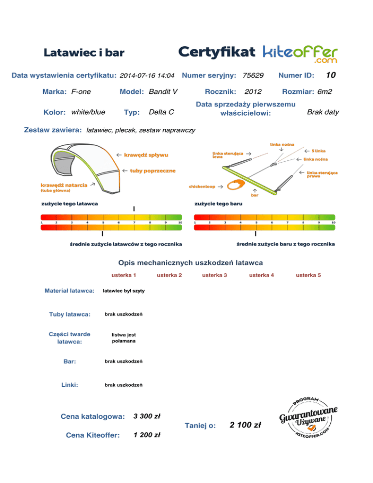Data wystawienia certyfikatu: 2014-07-16 14:04 Marka: F-one Numer seryjny: 75629 Model: Bandit V Kolor: white/blue Typ: Rocznik: 2012 Numer ID: Rozmiar: 6m2 Data sprzedaży pierwszemu właścicielowi: Delta C Brak daty Zestaw zawiera: latawiec, plecak, zestaw naprawczy | | | Opis mechanicznych uszkodzeń latawca usterka 1 Materiał latawca: latawiec był szyty Tuby latawca: brak uszkodzeń Części twarde latawca: listwa jest połamana Bar: brak uszkodzeń Linki: brak uszkodzeń Cena katalogowa: usterka 2 usterka 3 3 300 zł Taniej o: Cena Kiteoffer: usterka 4 1 200 zł 2 100 zł 10 usterka 5