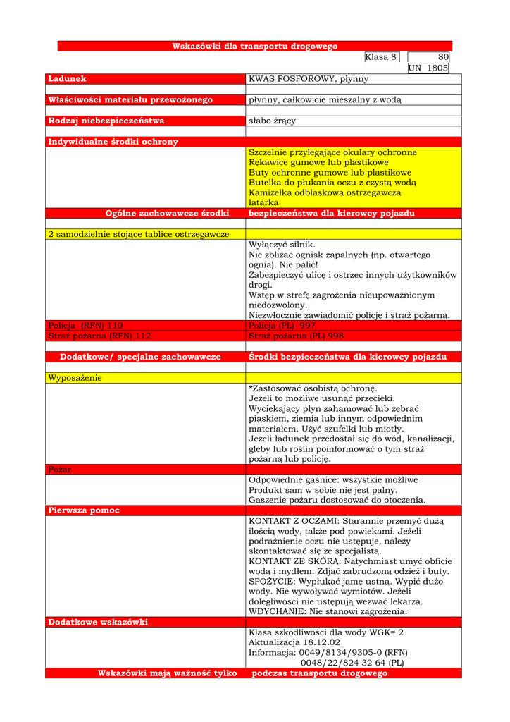 Wskazówki dla transportu drogowego Klasa 8 Ładunek KWAS FOSFOROWY, płynny Właściwości materiału przewożonego płynny, całkowicie mieszalny z wodą Rodzaj niebezpieczeństwa słabo żrący 80 UN 1805 Indywidualne środki ochrony Ogólne zachowawcze środki Szczelnie przylegające okulary ochronne Rękawice gumowe lub plastikowe Buty ochronne gumowe lub plastikowe Butelka do płukania oczu z czystą wodą Kamizelka odblaskowa ostrzegawcza latarka bezpieczeństwa dla kierowcy pojazdu 2 samodzielnie stojące tablice ostrzegawcze Policja (RFN) 110 Straż pożarna (RFN) 112 Dodatkowe/ specjalne zachowawcze Wyłączyć silnik. Nie zbliżać ognisk zapalnych (np. otwartego ognia). Nie palić! Zabezpieczyć ulicę i ostrzec innych użytkowników drogi. Wstęp w strefę zagrożenia nieupoważnionym niedozwolony. Niezwłocznie zawiadomić policję i straż pożarną. Policja (PL) 997 Straż pożarna (PL) 998 Środki bezpieczeństwa dla kierowcy pojazdu Wyposażenie *Zastosować osobistą ochronę. Jeżeli to możliwe usunąć przecieki. Wyciekający płyn zahamować lub zebrać piaskiem, ziemią lub innym odpowiednim materiałem. Użyć szufelki lub miotły. Jeżeli ładunek przedostał się do wód, kanalizacji, gleby lub roślin poinformować o tym straż pożarną lub policję. Pożar Odpowiednie gaśnice: wszystkie możliwe Produkt sam w sobie nie jest palny. Gaszenie pożaru dostosować do otoczenia. Pierwsza pomoc KONTAKT Z OCZAMI: Starannie przemyć dużą ilością wody, także pod powiekami. Jeżeli podrażnienie oczu nie ustępuje, należy skontaktować się ze specjalistą. KONTAKT ZE SKÓRĄ: Natychmiast umyć obficie wodą i mydłem. Zdjąć zabrudzoną odzież i buty. SPOŻYCIE: Wypłukać jamę ustną. Wypić dużo wody. Nie wywoływać wymiotów. Jeżeli dolegliwości nie ustępują wezwać lekarza. WDYCHANIE: Nie stanowi zagrożenia. Dodatkowe wskazówki Wskazówki mają ważność tylko Klasa szkodliwości dla wody WGK= 2 Aktualizacja 18.12.02 Informacja: 0049/8134/9305-0 (RFN) 0048/22/824 32 64 (PL) podczas transportu drogowego
