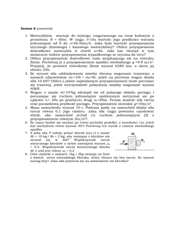 Zestaw 8 (czwartek) 1. Motocyklista startuje do wyścigu rozgrywanego na torze kołowym o promieniu R = 60m. W ciągu t=10s wartość jego prędkości wzrasta jednostajnie od 0 do v=58.5km/h. Jaka była wartość przyspieszenia stycznego (liniowego) i kątowego motocyklisty? Oblicz przyspieszenie dośrodkowe motocykla w chwili t0=8s. Jaki kąt tworzył w tym momencie wektor przyspieszenia wypadkowego ze styczną do toru? 2. Oblicz przyspieszenie dośrodkowe ciała znajdującego się na równiku Ziemi. Porównaj je z przyspieszeniem spadku swobodnego g =9.8 m/s2. Przyjmij, że promień równikowy Ziemi wynosi 6380 km, a okres jej obrotu 24h. 3. Ile wynosi siła oddziaływania między dwoma wagonami tramwaju o masach odpowiednio m1=10t i m2=8t, jeżeli na pierwszy wagon działa siła 10 kN? Oblicz z jakim największym przyspieszeniem może poruszać się tramwaj, jeżeli wytrzymałość połączenia między wagonami wynosi 40kN. 4. Wagon o masie m=104kg odczepił się od jadącego składu pociągu i poruszając się ruchem jednostajnie opóźnionym zatrzymał się po upływie t1= 20s po przebyciu drogi s1=20m. Proszę znaleźć siłę tarcia oraz początkową prędkość pociągu. Przyspieszenie ziemskie g=10m/s2. 5. Masa samochodu wynosi 10 t. Podczas jazdy na samochód działa siła tarcia równa 0,1 jego ciężaru. Jaką siłę ciągu powinien uzyskiwać silnik, aby samochód jechał (1) ruchem jednostajnym (2) z przyspieszeniem równym 2m/s2? 6. Ile czasu będzie się zsuwać po równi pochyłej pudełko, z wysokości 1m, jeżeli kąt nachylenia równi wynosi 30o? Porównaj ten wynik z czasem swobodnego spadku. 7. Z jaką siłą F należy pchać klocek (rys.1) o masie M1 = 10 kg i M2 = 2 kg, aby mniejszy z klocków nie zsuwał się w dół? Współczynnik tarcia statycznego klocków o siebie nawzajem wynosi a = 0,5. Współczynnik tarcia kinetycznego klocka M1 o stół jest równy b = 0,2 8. Dwa ciężarki o masach 1kg i 2kg zwisają na linie z dwóch stron nieważkiego bloczka, który obraca się bez tarcia. Ile wynosi naciąg liny? Jaka siła przenosi się na zawieszenie osi bloczka?