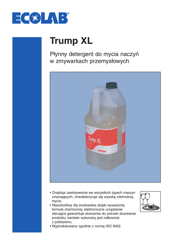 Trump XL Płynny detergent do mycia naczyń w zmywarkach przemysłowych • Znajduje zastosowanie we wszystkich typach maszyn zmywających, charakteryzuje się wysoką zdolnością mycia. • Nieszkodliwy dla środowiska dzięki wyważonej formule chemicznej; elektroniczne urządzenie sterujące gwarantuje stosownie do potrzeb dozowanie produktu; kanister wykonany jest całkowicie z polietylenu. • Wyprodukowany zgodnie z normą ISO 9002. Trump XL Płynny detergent do mycia naczyń w zmywarkach przemysłowych Działanie produktu: Myjące. Stosowanie: Sposób użycia: Odkręcić nakrętkę, umieścić sondę w kanistrze, uruchomić zmywarkę; dozowanie produktu odbywa się automatycznie. Urządzenie dozujące: J 302. Dozowanie: 1 ÷ 4 ml/l. Temperatura: 55 ÷ 65oC. Czas działania: 40 ÷ 200 sek. Zalecane środki ochronne: Rękawice i okulary ochronne. Środki bezpieczeństwa: Przed użyciem produktu upewnij się czy wszyscy pracownicy zapoznali się z informacjami umieszczonymi na etykiecie. Dane ekologiczne: Opakowanie: Stan skupienia: płyn; Kolor: jasnożółty; Zapach: neutralny; Skład: wodorotlenek sodu, EDTA; Zdolność do biol. neutralizacji: ponad 90% według WRMG UBA−Nr 0779 0241; Wartość pH: 12,2 (1% roztwór); Ciężar właściwy: 1,27. Karton: 4 kanistry z polietylenu × 5 l, oraz 20 litrowy kanister z polietylenu. Polietylen daje się zneutralizować. Przy spalaniu nie wydziela gazów trujących, przy składowaniu nie zanieczyszcza wód gruntowych. Warunki Przechowywania: Przechowywać w temp. pomiędzy 10oC a 35oC. Nie mieszać z żadnym innym produktem. CSTRUMPXL/P/021202/PL Dopuszczony do stosowania w zakładach przetwórstwa spożywczego atestem PZH nr HŻ 12475/93 Ecolab Sp. z o.o. 30-504 Kraków; ul. Kalwaryjska 69 tel.: 012/26 16 100; fax: 012/26 16 101 www.ecolab.com