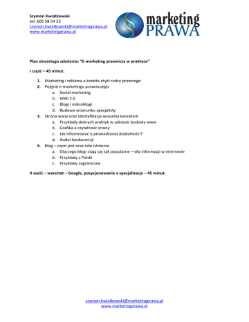 Szymon Kwiatkowski tel: 605 58 54 52 [email protected] www.marketingprawa.pl Plan otwartego szkolenia: ”E-marketing prawniczy w praktyce” I część – 45 minut: 1. Marketing i reklama a kodeks etyki radcy prawnego 2. Pojęcie e-marketingu prawniczego a. Social marketing b. Web 2.0 c. Blogi i mikroblogi d. Budowa wizerunku specjalisty 3. Strona www oraz identyfikacja wizualna kancelarii a. Przykłady dobrych praktyk w zakresie budowy www b. Grafika a czytelnośd strony c. Jak informowad o prowadzonej działalności? d. Audyt konkurencji 4. Blog – czym jest oraz cele istnienia a. Dlaczego blogi stają się tak popularne – siła informacji w internecie b. Przykłady z Polski c. Przykłady zagraniczne II cześć – warsztat – Google, pozycjonowanie a specjalizacja – 45 minut. [email protected] www.marketingprawa.pl