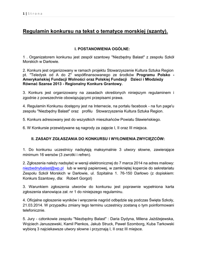 1|Strona Regulamin konkursu na tekst o tematyce morskiej (szanty). I. POSTANOWIENIA OGÓLNE: 1 . Organizatorem konkursu jest zespół szantowy "Niezbędny Balast" z zespołu Szkół Morskich w Darłowie. 2. Konkurs jest organizowany w ramach projektu Stowarzyszenie Kultura Sztuka Region pt. "Teledysk od A do Z" współfinansowanego ze środków Programu Polsko Amerykańskiej Fundacji Wolności oraz Polskiej Fundacji Dzieci i Młodzieży Równać Szanse 2013 - Regionalny Konkurs Grantowy. 3. Konkurs jest organizowany na zasadach określonych niniejszym regulaminem i zgodnie z powszechnie obowiązującymi przepisami prawa. 4. Regulamin Konkursu dostępny jest na Internecie, na portalu facebook - na fun page'u zespołu "Niezbędny Balast" oraz profilu Stowarzyszenia Kultura Sztuka Region. 5. Konkurs adresowany jest do wszystkich mieszkańców Powiatu Sławieńskiego. 6. W Konkursie przewidywane są nagrody za zajęcie I, II oraz III miejsca. II. ZASADY ZGŁASZANIA DO KONKURSU I WYŁONIENIA ZWYCIĘZCÓW: 1. Do konkursu uczestnicy nadsyłają maksymalnie 3 utwory słowne, zawierające minimum 16 wersów (3 zwrotki i refren). 2. Zgłoszenia należy nadsyłać w wersji elektronicznej do 7 marca 2014 na adres mailowy: [email protected] lub w wersji papierowej, w zamkniętej kopercie do sekretariatu Zespołu Szkół Morskich w Darłowie, ul. Szpitalna 1. 76-150 Darłowo (z dopiskiem: Konkurs Szantowy, dla: Robert Gorgol) 3. Warunkiem zgłoszenia utworów do konkursu jest poprawnie wypełniona karta zgłoszenia stanowiąca zał. nr 1 do niniejszego regulaminu. 4. Oficjalne ogłoszenie wyników i wręczenie nagród odbędzie się podczas Święta Szkoły, 21.03.2014. W przypadku zmiany tego terminu uczestnicy zostaną o tym poinformowani telefonicznie. 5. Jury - członkowie zespołu "Niezbędny Balast" : Daria Dydyna, Milena Jażdżejewska, Wojciech Januszewski, Kamil Pienkos, Jakub Struck, Paweł Szomborg, Kuba Tarkowski wybiorą 3 najciekawsze utwory słowne i przyznają I, II oraz III miejsce. 2|Strona Przy wyborze brane będzie pod uwagę: - melodyjność tekstów i ich dynamika - walory artystyczne - zgodność z tematyką morską - nawiązanie do regionu i jego mieszkańców Mile widziane będą teksty o tematyce: "piraci", "tęsknota i powroty", "pieśń pracy". 6. Uczestnik oświadcza, że przesłane przez niego utwory są wyłącznie jego autorstwa i posiada do nich pełne prawa: autorskie i materialne. 7. Przystąpienie do Konkursu, zgodnie z postanowieniami niniejszego Regulaminu, jest równoznaczne ze złożeniem przez uczestnika oświadczenia w przedmiocie akceptacji niniejszego Regulaminu i zgodą na przetwarzanie jego danych osobowych przez Organizatora. 8. Organizator zastrzega sobie prawo do nieodpłatnego wykorzystywania nadesłanych utworów słownych w celach promocyjnych zespołu muzycznego "Niezbędny Balast", Zespołu Szkół Morskich oraz regionu Pomorza. 9. Autor utworów słownych biorących udział w konkursie wyraża zgodę na wykorzystanie ich do celów wymienionych w pkt. II. 8 w szczególności w formie piosenek, teledysków. Wyraża zgodę na publikację tych utworów w mediach: Internet, radio, telewizja, prasa. III. POSTANOWIENIA KOŃCOWE: 1. Organizator zastrzega, że nie ponosi odpowiedzialności za: zdarzenia uniemożliwiające prawidłowe przeprowadzenie Konkursu, których nie był w stanie przewidzieć, lub którym nie mógł zapobiec, w szczególności w przypadku zaistnienia zdarzeń losowych w tym siły wyższej. 2. Organizator zastrzega sobie prawo zmiany postanowień niniejszego regulaminu w przypadku zmian przepisów prawnych lub innych istotnych zdarzeń mających wpływ na organizowanie Konkursu. 3. Niniejszy Regulamin wchodzi w życie z dniem rozpoczęcia konkursu i obowiązuje do czasu jego zakończenia. 3.5. Organizator zastrzega sobie prawo do odwołania Konkursu bez podania przyczyn. Decyzja taka zostanie podana do publicznej wiadomości. 3|Strona Zał. nr 1 do regulaminu KARTA ZGŁOSZENIA DO KONKURSU NA TEKST O TEMATYCE MORSKIEJ (SZANTY) 1. imię i nazwisko ........................................................................ 2. adres: ulica ....................................................kod................... miasto......................................................................... 3. telefon ........................................... 4. e-mail ............................................ 5. ilość zgłoszonych utworów 6. tytuły .................. - ................................................................... - ................................................................... - ................................................................... 7. Oświadczam, że przesłane przeze mnie utwory są wyłącznie mojego autorstwa i posiadam do nich pełne prawa: autorskie i materialne. 8. Wyrażam zgodę na przetwarzanie moich danych osobowych przez Organizatora do celów promocyjnych projektu. 9. Oświadczam , ze zapoznałem się z regulaminem konkursu. podpis..........................