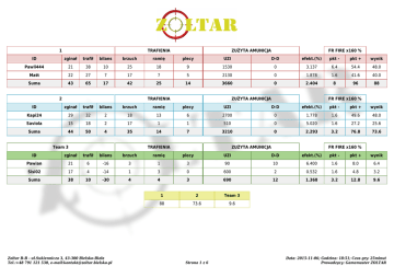 1 TRAFIENIA ZUŻYTA AMUNICJA FR FIRE x160 % ID zginał trafił bilans brzuch ramię plecy UZI D-D efekt.(%) pkt - pkt + wynik Pawli444 21 38 10 25 18 9 1530 0 3.137 6.4 54.4 48.0 Matt 22 27 7 17 7 5 2130 0 1.878 1.6 41.6 40.0 Suma 43 65 17 42 25 14 3660 0 2.404 8 96 88 2 TRAFIENIA ZUŻYTA AMUNICJA FR FIRE x160 % ID zginał trafił bilans brzuch ramię plecy UZI D-D efekt.(%) pkt - pkt + wynik Kapi24 29 32 2 18 13 6 2700 0 1.778 1.6 49.6 48.0 Saviola 15 18 2 17 1 1 510 0 5.020 1.6 27.2 25.6 Suma 44 50 4 35 14 7 3210 0 2.293 3.2 76.8 73.6 Team 3 TRAFIENIA ZUŻYTA AMUNICJA FR FIRE x160 % ID zginał trafił bilans brzuch ramię plecy UZI D-D efekt.(%) pkt - pkt + wynik Pawian 21 6 -16 3 1 3 90 10 6.400 1.6 8.0 6.4 Sisi02 17 4 -14 1 3 0 600 2 0.532 1.6 4.8 3.2 Suma 38 10 -30 4 4 3 690 12 1.368 3.2 12.8 9.6 Zoltar B-B - ul.Sukiennicza 3, 43-300 Bielsko-Biała Tel.:+48 791 121 530, e-mail:[email protected] 1 2 Team 3 88 73.6 9.6 Strona 1 z 6 Data: 2015-11-06; Godzina: 18:51; Czas gry: 25minut Prowadzący: Gamemaster ZOLTAR 1 TRAFIENIA ZUŻYTA AMUNICJA ID zginał trafił bilans brzuch ramię plecy UZI D-D Mhgun Shg Snp Monia 46 89 43 55 52 13 3720 0 0 0 0 0 2.392 89.0 Pawli444 41 56 15 40 16 9 2580 0 0 0 0 0 2.171 56.0 Monika 48 45 -3 26 14 13 0 0 930 30 23 30 4.442 45.0 Matt 52 44 -8 30 7 12 1830 0 30 0 3 30 2.324 44.0 Kapi24 41 37 -4 24 13 5 3600 0 0 0 0 0 1.028 37.0 Ola 50 34 -16 20 12 6 3450 4 0 0 0 0 0.984 34.0 Sisi02 24 25 1 17 5 7 1710 1 0 0 0 0 1.461 25.0 Pawian 39 22 -17 14 11 3 1650 42 0 0 0 0 1.300 22.0 Saviola 26 15 -11 14 1 1 1830 0 0 0 0 0 0.820 15.0 Suma 367 367 0 240 131 69 20370 47 960 30 26 60 1.708 367 Zoltar B-B - ul.Sukiennicza 3, 43-300 Bielsko-Biała Tel.:+48 791 121 530, e-mail:[email protected] Strona 2 z 6 ATank efekt.(%) wynik Data: 2015-11-06; Godzina: 19:24; Czas gry: 25minut Prowadzący: Gamemaster ZOLTAR Drużyny Miejsce Zoltar B-B - ul.Sukiennicza 3, 43-300 Bielsko-Biała Tel.:+48 791 121 530, e-mail:[email protected] Rozgrywki Nazwa 1 2 Suma 1 88 - 88 2 73.6 - 73.6 Team 3 9.6 - 9.6 Strona 3 z 6 Data: 2015-11-06 Prowadzący: Gamemaster ZOLTAR Zestawienie wg wyniku Miejsce TRAFIENIA ZUŻYTA AMUNICJA ID zginał trafił bilans brzuch ramię plecy UZI D-D Mhgun Shg Snp aTank efekt.(%) pkt - pkt + wynik Monia 110.40 213.60 103.20 132.00 124.80 31.20 8928.00 0.00 0.00 0.00 0.00 0.00 2.392 0.00 213.60 213.60 Pawli444 74.40 112.80 50.40 78.00 40.80 21.60 4932.00 0.00 0.00 0.00 0.00 0.00 2.530 7.68 132.48 124.80 Monika 115.20 108.00 -7.20 62.40 33.60 31.20 0.00 0.00 2232.00 72.00 55.20 72.00 4.442 0.00 108.00 108.00 4 Kapi24 84.00 82.80 18.00 50.40 31.20 13.20 7560.00 0.00 0.00 0.00 0.00 0.00 1.349 1.92 103.92 102.00 5 Matt 88.80 85.20 12.00 56.40 16.80 20.40 4752.00 0.00 36.00 0.00 3.60 36.00 2.088 1.92 102.72 100.80 6 Ola 120.00 81.60 -38.40 48.00 28.80 14.40 8280.00 9.60 0.00 0.00 0.00 0.00 0.984 0.00 81.60 81.60 7 Saviola 49.20 39.60 -0.48 37.20 2.40 2.40 2808.00 0.00 0.00 0.00 0.00 0.00 1.735 1.92 50.64 48.72 8 Pawian 72.00 33.60 -37.92 20.40 14.40 7.20 2088.00 62.40 0.00 0.00 0.00 0.00 1.585 1.92 36.00 34.08 9 Sisi02 49.20 34.80 -15.36 21.60 9.60 8.40 2772.00 3.60 0.00 0.00 0.00 0.00 1.219 1.92 35.76 33.84 Zoltar B-B - ul.Sukiennicza 3, 43-300 Bielsko-Biała Tel.:+48 791 121 530, e-mail:[email protected] Strona 4 z 6 Data: 2015-11-06 Prowadzący: Gamemaster ZOLTAR Zestawienie wg bilansu Miejsce TRAFIENIA ZUŻYTA AMUNICJA ID zginał trafił bilans brzuch ramię plecy UZI D-D Mhgun Shg Snp aTank efekt.(%) pkt - pkt + wynik Monia 110.40 213.60 103.20 132.00 124.80 31.20 8928.00 0.00 0.00 0.00 0.00 0.00 2.392 0.00 213.60 213.60 Pawli444 74.40 112.80 50.40 78.00 40.80 21.60 4932.00 0.00 0.00 0.00 0.00 0.00 2.530 7.68 132.48 124.80 Kapi24 84.00 82.80 18.00 50.40 31.20 13.20 7560.00 0.00 0.00 0.00 0.00 0.00 1.349 1.92 103.92 102.00 4 Matt 88.80 85.20 12.00 56.40 16.80 20.40 4752.00 0.00 36.00 0.00 3.60 36.00 2.088 1.92 102.72 100.80 5 Saviola 49.20 39.60 -0.48 37.20 2.40 2.40 2808.00 0.00 0.00 0.00 0.00 0.00 1.735 1.92 50.64 48.72 6 Monika 115.20 108.00 -7.20 62.40 33.60 31.20 0.00 0.00 2232.00 72.00 55.20 72.00 4.442 0.00 108.00 108.00 7 Sisi02 49.20 34.80 -15.36 21.60 9.60 8.40 2772.00 3.60 0.00 0.00 0.00 0.00 1.219 1.92 35.76 33.84 8 Pawian 72.00 33.60 -37.92 20.40 14.40 7.20 2088.00 62.40 0.00 0.00 0.00 0.00 1.585 1.92 36.00 34.08 9 Ola 120.00 81.60 -38.40 48.00 28.80 14.40 8280.00 9.60 0.00 0.00 0.00 0.00 0.984 0.00 81.60 81.60 Zoltar B-B - ul.Sukiennicza 3, 43-300 Bielsko-Biała Tel.:+48 791 121 530, e-mail:[email protected] Strona 5 z 6 Data: 2015-11-06 Prowadzący: Gamemaster ZOLTAR Zestawienie wg efektywności Miejsce TRAFIENIA ZUŻYTA AMUNICJA ID zginał trafił bilans brzuch ramię plecy UZI D-D Mhgun Shg Snp aTank efekt.(%) pkt - pkt + wynik Monika 115.20 108.00 -7.20 62.40 33.60 31.20 0.00 0.00 2232.00 72.00 55.20 72.00 4.442 0.00 108.00 108.00 Pawli444 74.40 112.80 50.40 78.00 40.80 21.60 4932.00 0.00 0.00 0.00 0.00 0.00 2.530 7.68 132.48 124.80 Monia 110.40 213.60 103.20 132.00 124.80 31.20 8928.00 0.00 0.00 0.00 0.00 0.00 2.392 0.00 213.60 213.60 4 Matt 88.80 85.20 12.00 56.40 16.80 20.40 4752.00 0.00 36.00 0.00 3.60 36.00 2.088 1.92 102.72 100.80 5 Saviola 49.20 39.60 -0.48 37.20 2.40 2.40 2808.00 0.00 0.00 0.00 0.00 0.00 1.735 1.92 50.64 48.72 6 Pawian 72.00 33.60 -37.92 20.40 14.40 7.20 2088.00 62.40 0.00 0.00 0.00 0.00 1.585 1.92 36.00 34.08 7 Kapi24 84.00 82.80 18.00 50.40 31.20 13.20 7560.00 0.00 0.00 0.00 0.00 0.00 1.349 1.92 103.92 102.00 8 Sisi02 49.20 34.80 -15.36 21.60 9.60 8.40 2772.00 3.60 0.00 0.00 0.00 0.00 1.219 1.92 35.76 33.84 9 Ola 120.00 81.60 -38.40 48.00 28.80 14.40 8280.00 9.60 0.00 0.00 0.00 0.00 0.984 0.00 81.60 81.60 Zoltar B-B - ul.Sukiennicza 3, 43-300 Bielsko-Biała Tel.:+48 791 121 530, e-mail:[email protected] Strona 6 z 6 Data: 2015-11-06 Prowadzący: Gamemaster ZOLTAR