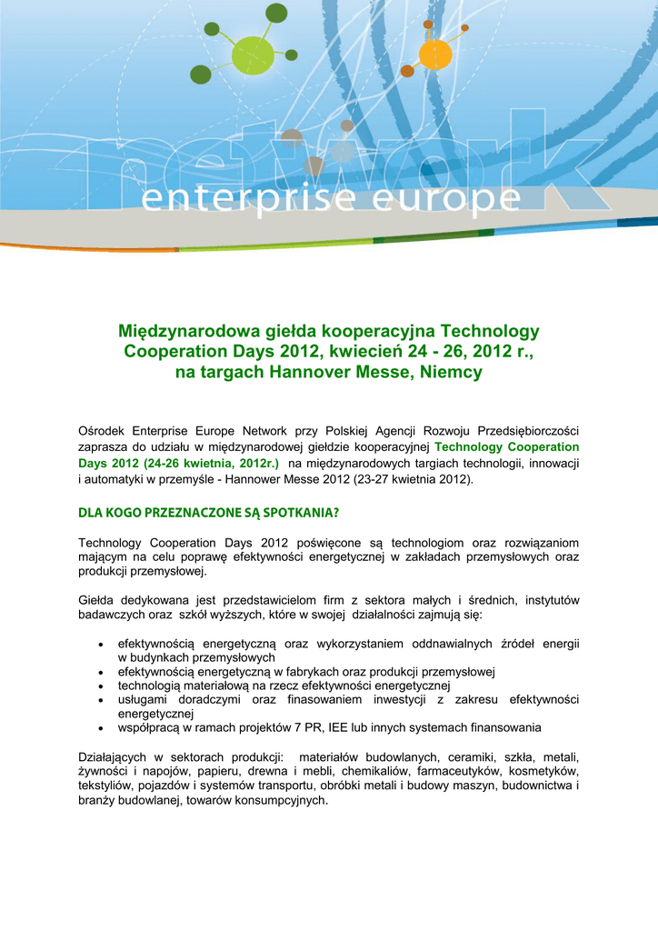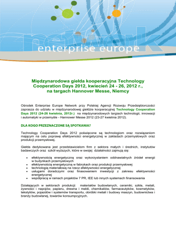 Międzynarodowa giełda kooperacyjna Technology Cooperation Days 2012, kwiecień 24 - 26, 2012 r., na targach Hannover Messe, Niemcy Ośrodek Enterprise Europe Network przy Polskiej Agencji Rozwoju Przedsiębiorczości zaprasza do udziału w międzynarodowej giełdzie kooperacyjnej Technology Cooperation Days 2012 (24-26 kwietnia, 2012r.) na międzynarodowych targiach technologii, innowacji i automatyki w przemyśle - Hannower Messe 2012 (23-27 kwietnia 2012). Technology Cooperation Days 2012 poświęcone są technologiom oraz rozwiązaniom mającym na celu poprawę efektywności energetycznej w zakładach przemysłowych oraz produkcji przemysłowej. Giełda dedykowana jest przedstawicielom firm z sektora małych i średnich, instytutów badawczych oraz szkół wyższych, które w swojej działalności zajmują się: efektywnością energetyczną oraz wykorzystaniem oddnawialnych źródeł energii w budynkach przemysłowych efektywnością energetyczną w fabrykach oraz produkcji przemysłowej technologią materiałową na rzecz efektywności energetycznej usługami doradczymi oraz finasowaniem inwestycji z zakresu efektywności energetycznej współpracą w ramach projektów 7 PR, IEE lub innych systemach finansowania Działających w sektorach produkcji: materiałów budowlanych, ceramiki, szkła, metali, żywności i napojów, papieru, drewna i mebli, chemikaliów, farmaceutyków, kosmetyków, tekstyliów, pojazdów i systemów transportu, obróbki metali i budowy maszyn, budownictwa i branży budowlanej, towarów konsumpcyjnych. GIEŁDA KOOPERACYJNA TECHNOLOGY COOPERATION DAYS Giełda kooperacyjna Technology Cooperation Days towarzyszy targom Hannover Messe od 2002 roku. Pozwala ona wystawcom i zwiedzającym znaleźć partnerów biznesowych m.in. w zakresie współpracy technologicznej, badań i rozwoju, produkcji, marketingu, kooperacji w formie joint venture lub licencji. W swojej kilkuletniej historii Technology Cooperation Days wzięło udział ponad 1500 uczestników, w wyniku licznych spotkań dwustronnych podpisano szereg międzynarodowych umów o partnerstwie. Giełda jest organizowana we współpracy z C-Energy + oraz GBE-Factory. Uczestnicy w formularzu rejestracyjnym online określają profil swojej działalności oraz rodzaj współpracy, który chcieliby nawiązać. Dane zarejestrowanych firm umieszczane są w katalogu online na stronie https://www.technologycooperationdays.com/index.php?page=cat_tech Z katalogu online zarejestrowani uczestnicy dokonują wyboru firm, z którymi chcieliby spotkać się podczas giełdy. W dniach 24 – 26 kwietnia 2012 r. w hali 2, na stoisku E15 tech transfer,odbywać się będą serie uprzednio zaaranżowanych 30-minutowych spotkań pomiędzy dobranymi w pary firmami. Spotkania zostaną zorganizowane w następujących godzinach: 24 kwietnia 2012 – 10:00-17:00 25 kwietnia 2012 – 10:00-17:00 26 kwietnia 2012 – 10:00-17:00 Oficjalnym językiem spotkań będzie język angielski. do 10 kwietnia 2012 r. zakończenie rejestracji uczestników giełdy do 13 kwietnia 2012 r. zakończenie wyboru partnerów do spotkań 24-26 kwietnia 2012 r. spotkania kooperacyjne w hali 2, stoisko E15 Dla uczestników rejestrujących sie za pomocą ośrodka Entreprise Europe Network przy PARP udział w giełdzie jest bezpłatny. Co zyskuje przesiębiorca: bilet wstępu na targi Hannover Messe umieszczenie profilu firmy w katalogu online, możliwość rezerwowania dwustronnych spotkań, przygotowanie indywidualnych harmonogramów spotkań, regularną aktualizację harmonogramu spotkań, udział w umówionych wcześniej spotkaniach z wybranymi partnerami. Uczestnicy pokrywają koszty transportu i zakwaterowania we własnym zakresie. PROCEDURA REJESTRACYJNA Przed rejestracją należy skontaktować się z ośrodkiem EEN, aby uzyskać darmowe kody rejestracyjne. Dzięki tym kodom udział w giełdzie kooperacyjnej jest bezpłatny. Następnie należy wypełnić formularz rejestracyjny online na stronie: https://www.technologycooperationdays.com/p_registration.php tworząc tym samym profil firmy. Będzie on zawierał: charakterystykę firmy i jej działalności, informacje dotyczące potencjalnej współpracy - Państwa oferty i rodzaju partnera biznesowego, którego poszukujecie. Następnie profil firmy zostanie opublikowany w katalogu online na stronie internetowej giełdy. Każdy z uczestników może wybrać profile interesujących firm i poprosić o spotkania z ich przedstawicielami. HANNOVER MESSE 2012. Międzynarodowe targi Hannover Messe należą do najstarszych i najważniejszych targów technologii, innowacji i automatyki w przemyśle. Odbywające się w Hanowerze targi zgromadziły w 2011 r. ponad 6 500 wystawców z 65 krajów oraz prawie 230 tysięcy odwiedzających. Efektywnośc energetyczna jest jednym z kluczowych tematów HANNOVER MESSE 2012. Więcej informacji na temat http://www.hannovermesse.de targów można znaleźć na stronie Uczestnicy giełdy kooperacyjnej Technology Cooperation Days 2012 będą mogli skorzystać ze stoiska Polski Produkt Przyszłości organizowanego przez PARP w ramach targów HANNOVER MESSE 2012. Termin rejestracji mija 10 kwietnia 2012 r.! Dodatkowych informacji udziela p. Magdalena Gephard z Enterprise Europe Network przy PARP, e-mail: [email protected], tel.: 0 22 432 87 05.