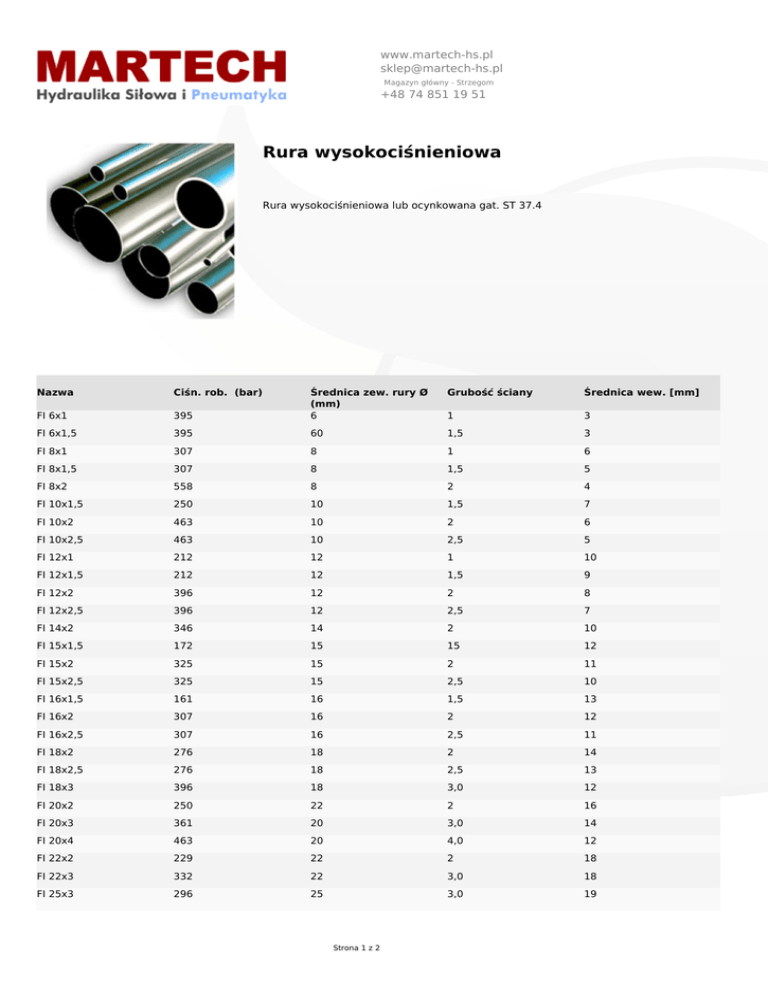 www.martech-hs.pl [email protected] Magazyn główny - Strzegom +48 74 851 19 51 Rura wysokociśnieniowa Rura wysokociśnieniowa lub ocynkowana gat. ST 37.4 Nazwa Ciśn. rob. (bar) Grubość ściany Średnica wew. [mm] 395 Średnica zew. rury Ø (mm) 6 FI 6x1 1 3 FI 6x1,5 395 60 1,5 3 FI 8x1 307 8 1 6 FI 8x1,5 307 8 1,5 5 FI 8x2 558 8 2 4 FI 10x1,5 250 10 1,5 7 FI 10x2 463 10 2 6 FI 10x2,5 463 10 2,5 5 FI 12x1 212 12 1 10 FI 12x1,5 212 12 1,5 9 FI 12x2 396 12 2 8 FI 12x2,5 396 12 2,5 7 FI 14x2 346 14 2 10 FI 15x1,5 172 15 15 12 FI 15x2 325 15 2 11 FI 15x2,5 325 15 2,5 10 FI 16x1,5 161 16 1,5 13 FI 16x2 307 16 2 12 FI 16x2,5 307 16 2,5 11 FI 18x2 276 18 2 14 FI 18x2,5 276 18 2,5 13 FI 18x3 396 18 3,0 12 FI 20x2 250 22 2 16 FI 20x3 361 20 3,0 14 FI 20x4 463 20 4,0 12 FI 22x2 229 22 2 18 FI 22x3 332 22 3,0 18 FI 25x3 296 25 3,0 19 Strona 1 z 2 Nazwa Ciśn. rob. (bar) Grubość ściany Średnica wew. [mm] 382 Średnica zew. rury Ø (mm) 25 FI 25x4 4,0 17 FI 28x2 183 28 2 24 FI 28x3 267 28 3,0 22 FI 28x4 346 28 4,0 20 FI 30x3 250 30 3,0 24 FI 30x4 325 30 4,0 22 FI 35x3 217 35 3,0 29 FI 35x4 283 35 4,0 27 FI 38x3 201 38 3,0 32 FI 38x4 263 38 4,0 30 FI 38x5 321 38 5,0 28 FI 42x3 183 42 3,0 36 FI 42x4 239 42 4,0 34 FI 50x5 250 50 5,0 40 FI 55x5 229 55 5,0 45 F 60x5 212 60 5,0 50 FI 75x5 172 75 5,0 65 FI 90x6 172 90 6 78 Strona 2 z 2