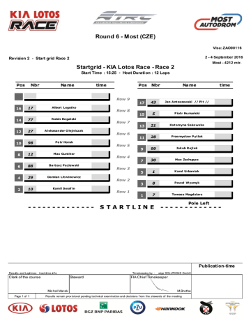 Round 6 - Most (CZE) Visa: ZAO00116 2 - 4 September 2016 Revision 2 - Start grid Race 2 Most - 4212 mtr. Startgrid - KIA Lotos Race - Race 2 Start Time : 15:25 - Heat Duration : 12 Laps Pos Nbr Name time Row 9 16 17 Albert Legutko 14 77 Robin Rogalski 12 27 Alekasander O lejniczak 10 98 Petr Horak 8 12 Max Gunther 6 88 Bartosz Paziewski 4 29 Damian Litwinowicz 2 10 Kamil Seraf in -------------- Row 8 Row 7 Row 6 Row 5 Row 4 Row 3 Row 2 Row 1 Pos Nbr 17 43 Jan Antoszewski // Pit // 15 5 P iotr Humański 13 21 Katarzyna Sakowska 11 28 Przemysław P ytlak 9 99 Jakub Rejlek 7 30 Max Zschuppe 5 1 Karol Urbaniak 3 8 Paweł Wysmyk 1 7 Tomasz Magdziarz S TARTLINE -- Name time Pole Left ------------- Publication-time Results and Laptimes : tracktime.inf o Clerk of the course Mic hal Ma rek Page 1 of 1 Timekeeping by : _wige SOLUTIONS GmbH Steward FIA Chief Timekeeper M.Brothe Results remain prov isional pending technical examination and decisions f rom the stewards of the meeting