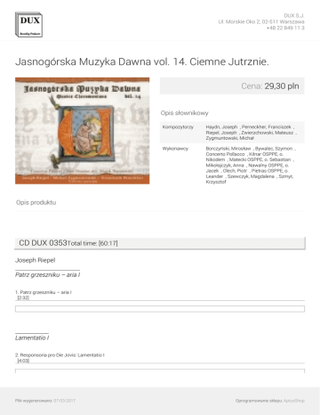 DUX S.J. Ul. Morskie Oko 2, 02-511 Warszawa +48 22 849 11 3 Jasnogórska Muzyka Dawna vol. 14. Ciemne Jutrznie. Cena: 29,30 pln Opis słownikowy Kompozytorzy Haydn, Joseph ∎, Perneckher, Franciszek ∎, Riepel, Joseph ∎, Zwierzchowski, Mateusz ∎, Zygmuntowski, Michał ∎ Wykonawcy Borczyński, Mirosław ∎, Bywalec, Szymon ∎, Concerto Pollacco ∎, Kilnar OSPPE, o. Nikodem ∎, Matecki OSPPE, o. Sebastian ∎, Mikołajczyk, Anna ∎, Nawalny OSPPE, o. Jacek ∎, Olech, Piotr ∎, Pietras OSPPE, o. Leander ∎, Szewczyk, Magdalena ∎, Szmyt, Krzysztof ∎ Opis produktu CD DUX 0353Total time: [60:17] Joseph Riepel Patrz grzeszniku – aria I 1. Patrz grzeszniku – aria I [2:32] Lamentatio I 2. Responsoria pro Die Jovis: Lamentatio I [4:03] Plik wygenerowano: 07-03-2017 Oprogramowanie sklepu: AptusShop DUX S.J. Ul. Morskie Oko 2, 02-511 Warszawa +48 22 849 11 3 Joseph Haydn In monte Olivetti 3. Responsoria pro Die Jovis: In monte Olivetti (opr. O. Michał Zygmuntowski OSPPE) [2:40] Lamentatio II 4. Responsoria pro Die Jovis: Lamentatio II [3:18] Joseph Haydn Tristis est anima mea 5. Responsoria pro Die Jovis: Tristis est anima mea (opr. O. Michał Zygmuntowski OSPPE) [1:56] Joseph Haydn Ecce vidimus eum 6. Responsoria pro Die Jovis: Ecce vidimus eum (opr. O. Michał Zygmuntowski OSPPE) [2:46] Michał Zygmuntowski Omnes amici mei 7. Responsoria pro Parasceve: Omnes amici mei [2:35] Plik wygenerowano: 07-03-2017 Oprogramowanie sklepu: AptusShop DUX S.J. Ul. Morskie Oko 2, 02-511 Warszawa +48 22 849 11 3 Lamentatio V 8. Responsoria pro Parasceve: Lamentatio V [4:59] Michał Zygmuntowski Velum templi 9. Responsoria pro Parasceve: Velum templi [1:32] Lamentatio VI 10. Responsoria pro Parasceve: Lamentatio VI [3:27] Joseph Riepel Vinea mea 11. Responsoria pro Parasceve: Vinea mea [1:33] Lamentatio VII 12. Responsoria pro Sabbato Sancto: Lamentatio VII [5:20] Joseph Riepel Plik wygenerowano: 07-03-2017 Oprogramowanie sklepu: AptusShop DUX S.J. Ul. Morskie Oko 2, 02-511 Warszawa +48 22 849 11 3 Sicut ovis 13. Responsoria pro Sabbato Sancto: Sicut ovis [2:31] Mateusz Zwierzchowski Jerusalem, surge et exulte 14. Responsoria pro Sabbato Sancto: Jerusalem, surge et exulte [1:59] Lamentatio IX 15. Responsoria pro Sabbato Sancto: Lamentatio IX [5:15] Franciszek Perneckher Plange quasi virgo 16. Responsoria pro Sabbato Sancto: Plange quasi virgo [3:28] Joseph Riepel Ach! lud wybrany 17. Responsoria pro Sabbato Sancto: Ach! lud wybrany [7:51] Joseph Riepel Patrz grzeszniku – aria II Plik wygenerowano: 07-03-2017 Oprogramowanie sklepu: AptusShop DUX S.J. Ul. Morskie Oko 2, 02-511 Warszawa +48 22 849 11 3 18. Responsoria pro Sabbato Sancto: Patrz grzeszniku – aria II [2:32] Wykonawcy: Concerto Pollacco Anna Mikołajczyk /sopran/ Krzysztof Szmyt /tenor/ Magdalena Szewczyk /mezzosopran/ Mirosław Borczyński /bas/ o. Jacek Nawalny OSPPE /lamentacje/ o. Leander Pietras OSPPE /lamentacje/ o. Nikodem Kilnar OSPPE /lamentacje/ o. Sebastian Matecki OSPPE /lamentacje/ Piotr Olech /alt/ Szymon Bywalec /dyrygent/ Plik wygenerowano: 07-03-2017 Powered by TCPDF (www.tcpdf.org) Oprogramowanie sklepu: AptusShop