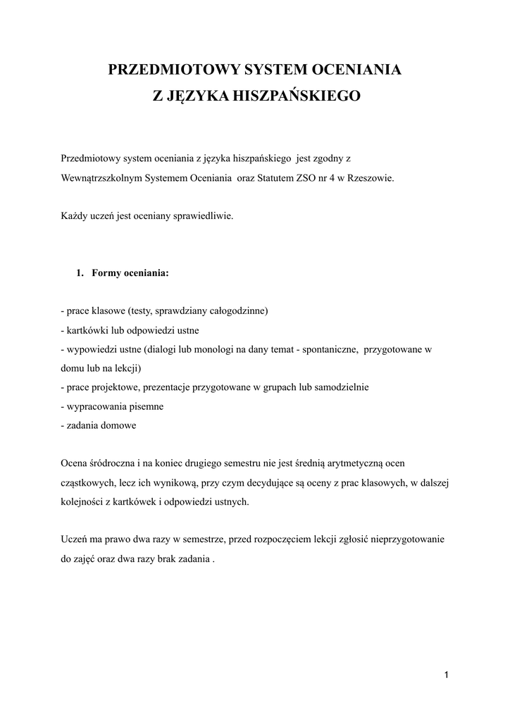 PRZEDMIOTOWY SYSTEM OCENIANIA Z JĘZYKA HISZPAŃSKIEGO Przedmiotowy system oceniania z języka hiszpańskiego jest zgodny z Wewnątrzszkolnym Systemem Oceniania oraz Statutem ZSO nr 4 w Rzeszowie. Każdy uczeń jest oceniany sprawiedliwie. 1. Formy oceniania: - prace klasowe (testy, sprawdziany całogodzinne) - kartkówki lub odpowiedzi ustne - wypowiedzi ustne (dialogi lub monologi na dany temat - spontaniczne, przygotowane w domu lub na lekcji) - prace projektowe, prezentacje przygotowane w grupach lub samodzielnie - wypracowania pisemne - zadania domowe Ocena śródroczna i na koniec drugiego semestru nie jest średnią arytmetyczną ocen cząstkowych, lecz ich wynikową, przy czym decydujące są oceny z prac klasowych, w dalszej kolejności z kartkówek i odpowiedzi ustnych. Uczeń ma prawo dwa razy w semestrze, przed rozpoczęciem lekcji zgłosić nieprzygotowanie do zajęć oraz dwa razy brak zadania . 1 Proponowane przeliczenie procentowe na stopnie: pow. 100%- celujący 91% - 100% - bardzo dobry 76% - 90% - dobry 50% - 75% - dostateczny 30% - 49% - dopuszczający 0% - 29% - niedostateczny Procentowe kryteria oceniania dostosowane do możliwości uczniów posiadających orzeczenie PPP o obniżeniu wymagań edukacyjnych: 90% - 100% celujący 75% - 89 % bardzo dobry 55% - 74% dobry 35% - 54 % dostateczny 20% - 34 % dopuszczający 0% - 19% niedostateczny Każdy sprawdzian może zawierać zadanie (ćwiczenie) wykraczające poza podstawy programowe na ocenę celującą. 2. Kryteria oceniania odpowiedzi ustnej: Do odpowiedzi ustnej uczniów obowiązują 3 ostatnie tematy lekcyjne, obejmujące zagadnienia gramatyczne i treści tematyczne oraz wszystkie zagadnienia leksykalne (słówka). 2 Odpowiedź ucznia składa się z następujących części: 1. prezentacja zadania domowego / czytanie i tłumaczenie fragmentu tekstu /wykonanie ćwiczenia gramatycznego sprawdzającego opanowanie ostatnio poznanych struktur (50 % oceny), 2. dialog z nauczycielem w formie odpowiedzi na pytania związane z omawianym zagadnieniem / streszczenie tekstu / zastosowanie poznanych struktur gramatycznych w zdaniach (25 % oceny), 3. sprawdzenie znajomości słownictwa ( zarówno poprzez pojedyncze wyrazy jak i całe zwroty lub tłumaczenie zdań) (25 % oceny). Oceniana jest: 1. poprawność gramatyczna i leksykalna, 2. płynność i skuteczność komunikacji, 3. poprawność wymowy Uczeń może się zgłosić do odpowiedzi na każdej lekcji. Z odpowiedzi zwalnia ucznia wylosowany „szczęśliwy numerek” lub zgłoszone na początku lekcji nieprzygotowanie do lekcji 3. System motywacyjny (czynniki wpływające na podniesienie oceny śródrocznej i rocznej): - wykonywanie dodatkowych zadań - szczególna aktywność na lekcji - osiągnięcia w konkursach szkolnych i pozaszkolnych Systematyczne prowadzenie zeszytu oraz zeszytu ćwiczeń będzie warunkiem starania się o wyższą ocenę. 3 4. Zasady poprawiania stopni: Uczeń ma prawo poprawić ocenę ze sprawdzianu pisemnego (całogodzinnego). Poprawa jest dobrowolna, odbywa się w terminie i formie ustalonej przez nauczyciela. Na koniec semestru i roku szkolnego nie przewiduje się zaliczania materiału w celu podwyższenia stopnia. 5. Sposób udostępniania rodzicom prac kontrolnych: Prace klasowe (całogodzinne) udostępniane są na prośbę rodziców w obecności nauczyciela danego przedmiotu w trakcie jego dyżuru konsultacyjnego lub po indywidualnym ustaleniu terminu spotkania. 6. Dostosowanie wymagań do orzeczeń PPP. Szczegółowe dostosowania wymagań edukacyjnych dla każdego ucznia ze stosownym orzeczeniem PPP zawarte są w IPET. Uczniowie posiadający orzeczenie PPP o wydłużeniu czasu pracy mają o 1/3 przykładów mniej do wykonania na sprawdzianie pisemnym. Uczniowie posiadający orzeczenie o potrzebie kształcenia specjalnego piszą sprawdziany dostosowane do ich zdolności percepcyjnych. W przypadku kiedy orzeczenie PPP dotyczy dysleksji, dysgrafii i dysortografii, obowiązują podstawowe kryteria oceniania stosowane dla wszystkich uczniów z wyjątkiem wymagań dotyczących ortografii. 4 KRYTERIA OCENIANIA OSIĄGNIĘĆ UCZNIÓW Z JĘZYKA HISZPAŃSKIEGO Ocenę celującą otrzymuje uczeń, który: Samodzielnie i twórczo rozwija własne uzdolnienia; Biegle posługuje się zdobytymi wiadomościami i umiejętnościami; Osiąga sukcesy w konkursach szczebla wyższego niż szkolny; Otrzymuje 100% wyniki ze wszystkich form sprawdzania wiedzy i umiejętności. Ocenę bardzo dobrą otrzymuje uczeń, który: Potrafi poprawnie operować strukturami gramatycznymi prostymi i złożonymi; Potrafi budować spójne zdania i stosuje szeroki zakres słownictwa odpowiedni do zadania; Potrafi zrozumieć kluczowe informacje w różnorodnych tekstach i rozmowach; Potrafi wydobyć potrzebne informacje i przekształcić je w formę pisemną; Z łatwością rozróżnia dźwięki; Rozpoznaje uczucia mówiącego i rozumie polecenia nauczyciela; 5 Potrafi z powodzeniem przekazać wiadomość; Posługuje się poprawnym językiem, popełniając niewiele błędów; Omawia tematy codzienne i tematy o charakterze abstrakcyjnym; Można go z łatwością zrozumieć; Potrafi napisać zdanie zawierające złożone struktury i słownictwo; Jego tekst jest zorganizowany w sposób spójny i zawiera wszystkie niezbędne elementy; Pisze teksty o odpowiedniej długości; Używa prawidłowej pisowni i interpunkcji; Otrzymuje minimum 90% z większości sprawdzianów. Ocenę dobrą otrzymuje uczeń, który: Potrafi poprawnie operować większością struktur prostych i złożonych; W większości wypadków buduje zdania spójne i używa szerokiego zakresu słownictwa odpowiedniego do zadania; Potrafi zrozumieć większość kluczowych informacji w różnorodnych tekstach i rozmowach; Potrafi wydobyć większość potrzebnych informacji i przekształcić je w formę pisemną; Potrafi rozpoznać uczucia i reakcje mówiącego; 6 Potrafi rozróżnić dźwięki i zrozumieć polecenia nauczyci