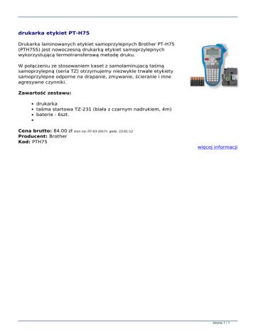 drukarka etykiet PT-H75 Drukarka laminowanych etykiet samoprzylepnych Brother PT-H75 (PTH75S) jest nowoczesną drukarką etykiet samoprzylepnych wykorzystującą termotransferową metodę druku. W połączeniu ze stosowaniem kaset z samolaminujacą taśmą samoprzylepną (seria TZ) otrzymujemy niezwykle trwałe etykiety samoprzylepne odporne na drapanie, zmywanie, ścieranie i inne agresywne czynniki. Zawartość zestawu: drukarka taśma startowa TZ-231 (biała z czarnym nadrukiem, 4m) baterie - 6szt. Cena brutto: 84.00 zł Producent: Brother Kod: PTH75 stan na: 07-03-2017r. godz. 23:01:12 więcej informacji strona 1 / 1 Powered by TCPDF (www.tcpdf.org)