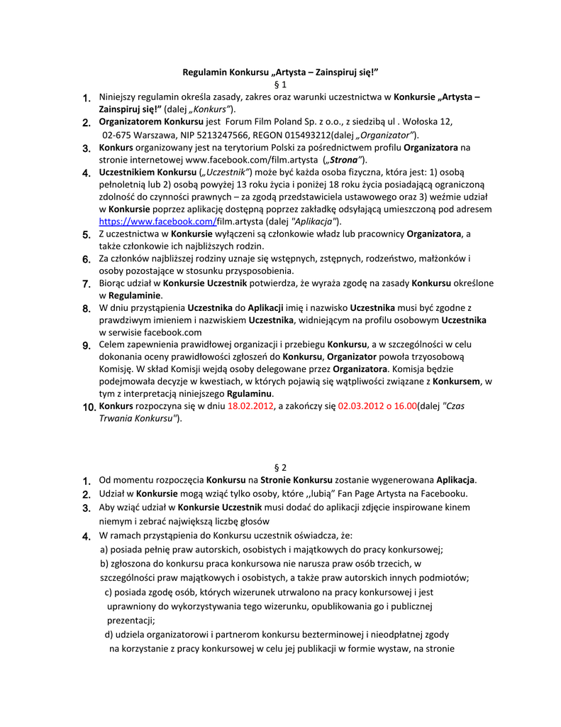 Regulamin Konkursu „Artysta – Zainspiruj się!” §1 1. Niniejszy regulamin określa zasady, zakres oraz warunki uczestnictwa w Konkursie „Artysta – Zainspiruj się!” (dalej „Konkurs”). 2. Organizatorem Konkursu jest Forum Film Poland Sp. z o.o., z siedzibą ul . Wołoska 12, 02-675 Warszawa, NIP 5213247566, REGON 015493212(dalej „Organizator”). 3. Konkurs organizowany jest na terytorium Polski za pośrednictwem profilu Organizatora na stronie internetowej www.facebook.com/film.artysta („Strona”). 4. Uczestnikiem Konkursu („Uczestnik”) może być każda osoba fizyczna, która jest: 1) osobą pełnoletnią lub 2) osobą powyżej 13 roku życia i poniżej 18 roku życia posiadającą ograniczoną zdolność do czynności prawnych – za zgodą przedstawiciela ustawowego oraz 3) weźmie udział w Konkursie poprzez aplikację dostępną poprzez zakładkę odsyłającą umieszczoną pod adresem https://www.facebook.com/film.artysta (dalej "Aplikacja"). 5. Z uczestnictwa w Konkursie wyłączeni są członkowie władz lub pracownicy Organizatora, a także członkowie ich najbliższych rodzin. 6. Za członków najbliższej rodziny uznaje się wstępnych, zstępnych, rodzeństwo, małżonków i osoby pozostające w stosunku przysposobienia. 7. Biorąc udział w Konkursie Uczestnik potwierdza, że wyraża zgodę na zasady Konkursu określone w Regulaminie. 8. W dniu przystąpienia Uczestnika do Aplikacji imię i nazwisko Uczestnika musi być zgodne z prawdziwym imieniem i nazwiskiem Uczestnika, widniejącym na profilu osobowym Uczestnika w serwisie facebook.com 9. Celem zapewnienia prawidłowej organizacji i przebiegu Konkursu, a w szczególności w celu dokonania oceny prawidłowości zgłoszeń do Konkursu, Organizator powoła trzyosobową Komisję. W skład Komisji wejdą osoby delegowane przez Organizatora. Komisja będzie podejmowała decyzje w kwestiach, w których pojawią się wątpliwości związane z Konkursem, w tym z interpretacją niniejszego Rgulaminu. 10. Konkurs rozpoczyna się w dniu 18.02.2012, a zakończy się 02.03.2012 o 16.00(dalej "Czas Trwania Konkursu"). 1. 2. 3. 4. §2 Od momentu rozpoczęcia Konkursu na Stronie Konkursu zostanie wygenerowana Aplikacja. Udział w Konkursie mogą wziąć tylko osoby, które ,,lubią” Fan Page Artysta na Facebooku. Aby wziąć udział w Konkursie Uczestnik musi dodać do aplikacji zdjęcie inspirowane kinem niemym i zebrać największą liczbę głosów W ramach przystąpienia do Konkursu uczestnik oświadcza, że: a) posiada pełnię praw autorskich, osobistych i majątkowych do pracy konkursowej; b) zgłoszona do konkursu praca konkursowa nie narusza praw osób trzecich, w szczególności praw majątkowych i osobistych, a także praw autorskich innych podmiotów; c) posiada zgodę osób, których wizerunek utrwalono na pracy konkursowej i jest uprawniony do wykorzystywania tego wizerunku, opublikowania go i publicznej prezentacji; d) udziela organizatorowi i partnerom konkursu bezterminowej i nieodpłatnej zgody na korzystanie z pracy konkursowej w celu jej publikacji w formie wystaw, na stronie internetowej oraz materiałach promocyjnych, bez ograniczeń czasowych i terytorialnych, z zastrzeżeniem podania nazwiska autora przy publikacji jego prac. Jeśli zgłoszenia nie spełnia wymagań określonych w niniejszym Regulaminie, Organizator zastrzega sobie prawo usunięcia takiego Zgłoszenia. 5. W przypadku pojawienia się ze strony osób trzecich ewentualnych roszczeń wynikających z tytułu naruszenia praw autorskich lub innych praw osobistych przez uczestnika, Uczestnik zobowiązany będzie, jako osoba wyłącznie odpowiedzialna, do pokrycia wszelkich szkód oraz roszczeń odszkodowawczych. 6. Zgłoszenie nie może zawierać treści sprzecznych z prawem, dobrymi obyczajami, naruszać praw osób trzecich jak również nie może przedstawiać lub opisywać sytuacji lub zdarzeń, które mogą powodować zagrożenie dla zdrowia lub życia ludzi lub zwierząt. Zgłoszenia które nie spełniają powyższych warunków nie będą brane pod uwagę przez Komisję Konkursową podczas wyłaniania zwycięzców. Organizator zastrzega sobie prawo do usunięcia takiego Zgłoszenia. 7. Zwycięzcą Konkursu zostaje Uczestnik Konkursu, wyłoniony przez komisję spośród 20 uczestnikow,którzy zbiorą największą ilość głosów. 8.Uczestnik może zaprosić dowolną ilość znajomych. 9.Organizator zastrzega sobie możliwość wcześniejszego zakończenia edycji w przypadku, gdy limit nagród zostanie wyczerpany. §3 1. Nagrody przewidziane w Konkursie ufundował Organizator. 1. Nagrodą w Konkursie jest zaproszenie dla dwóch osób na wybrane premiery filmów organizowane przez Organizatora w roku 2012, wybrane przez Organizatora 1. Jeden Uczestnik Konkursu może wygrać jeden raz. 2. Uczestnikom Akcji nie przysługuje prawo wymiany nagród na gotówkę, ani nagrodę innego rodzaju. 3. Uczestnicy mogą zrzec się nagrody, ale w zamian nie przysługuje im ekwiwalent pieniężny, ani jakakolwiek inna nagroda. §4 1. Organizator może wykluczyć Uczestnika z udziału w Akcji w przypadku naruszenia przez Uczestnika postanowień niniejszego Regulaminu. 2. Uczestnicy, wobec których zajdzie podejrzenie, że ingerują w mechanizm Akcji lub działają w sprzeczności z zasadami fair play zostaną wykluczeni z udziału w Akcji. 3. Organizator zastrzega sobie prawo zmian niniejszego Regulaminu w każdym czasie bez podania przyczyny przy zastosowaniu odpowiednich form informacji i zawiadomień Uczestników. 4. Zmiany w Regulaminie nie mogą naruszać praw nabytych przez Uczestników. 1. Zgłaszając swój udział w Akcji Uczestnik wyraża zgodę na przetwarzanie jego danych osobowych, zgodnie z przepisami ustawy z dnia 29 sierpnia 1997 r. o ochronie danych osobowych. Administratorem tych danych w rozumieniu obowiązujących przepisów jest Forum Film Poland Sp. z o.o., z siedzibą ul . Wołoska 12, 02-675 Warszawa, NIP 5213247566, R