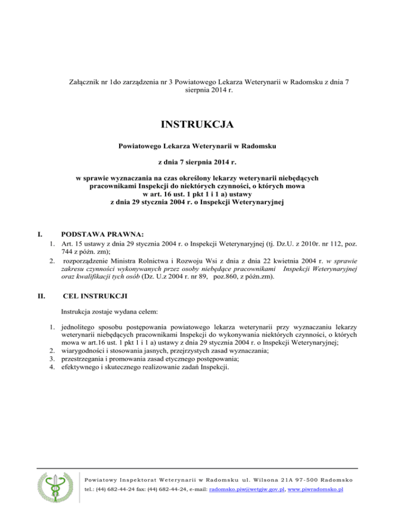 Załącznik nr 1do zarządzenia nr 3 Powiatowego Lekarza Weterynarii w Radomsku z dnia 7 sierpnia 2014 r. INSTRUKCJA Powiatowego Lekarza Weterynarii w Radomsku z dnia 7 sierpnia 2014 r. w sprawie wyznaczania na czas określony lekarzy weterynarii niebędących pracownikami Inspekcji do niektórych czynności, o których mowa w art. 16 ust. 1 pkt 1 i 1 a) ustawy z dnia 29 stycznia 2004 r. o Inspekcji Weterynaryjnej I. II. PODSTAWA PRAWNA: 1. Art. 15 ustawy z dnia 29 stycznia 2004 r. o Inspekcji Weterynaryjnej (tj. Dz.U. z 2010r. nr 112, poz. 744 z póżn. zm); 2. rozporządzenie Ministra Rolnictwa i Rozwoju Wsi z dnia z dnia 22 kwietnia 2004 r. w sprawie zakresu czynności wykonywanych przez osoby niebędące pracownikami Inspekcji Weterynaryjnej oraz kwalifikacji tych osób (Dz. U.z 2004 r. nr 89, poz.860, z póżn.zm). CEL INSTRUKCJI Instrukcja zostaje wydana celem: 1. jednolitego sposobu postępowania powiatowego lekarza weterynarii przy wyznaczaniu lekarzy weterynarii niebędących pracownikami Inspekcji do wykonywania niektórych czynności, o których mowa w art.16 ust. 1 pkt 1 i 1 a) ustawy z dnia 29 stycznia 2004 r. o Inspekcji Weterynaryjnej; 2. wiarygodności i stosowania jasnych, przejrzystych zasad wyznaczania; 3. przestrzegania i promowania zasad etycznego postępowania; 4. efektywnego i skutecznego realizowanie zadań Inspekcji. Powiatowy Inspektorat Weterynarii w Radomsku ul. Wilsona 21A 97-500 Radomsko tel.: (44) 682-44-24 fax: (44) 682-44-24, e-mail: [email protected], www.piwradomsko.pl POSTANOWIENIA OGÓLNE III. 1. Powiatowy lekarz weterynarii wyznacza lekarzy weterynarii niebędących pracownikami Inspekcji Weterynaryjnej zgodnie z art. 16 ust. 1 pkt 1 i 1a ustawy z dnia 29 stycznia 2004 r. o Inspekcji Weterynaryjnej zwanej dalej ustawą. 2. Wyznaczenie lekarzy weterynarii może nastąpić wyłącznie w przypadku spełnienia wymogów, o których mowa w rozporządzeniu Ministra Rolnictwa i Rozwoju Wsi z dnia z dnia 22 kwietnia 2004 r. w sprawie zakresu czynności wykonywanych przez osoby niebędące pracownikami Inspekcji Weterynaryjnej oraz kwalifikacji tych osób (Dz. U. nr 89, poz.860 z póżn. zm). 3. Lekarze weterynarii wyznaczeni w zakresie obowiązków realizowanych w ramach wyznaczenia są lekarzami urzędowymi i obowiązują ich: rzetelność, bezstronność i terminowość wykonywania powierzonych obowiązków. Wyznaczeni lekarze weterynarii są zobowiązani do zachowania poufności informacji pozyskanych przy wykonywaniu obowiązków realizowanych w ramach wyznaczenia. 4. Wyznaczenia obejmują okres 3 miesięcy. IV. POSTANOWIENIA SZCZEGÓŁOWE SKŁADANIE WNIOSKÓW 1. Powiatowy lekarz weterynarii ustala zakres zadań będących przedmiotem wyznaczenia oraz przygotowuje informację, która zawiera: 1) charakter, zakres i lokalizację zadań; 2) termin realizacji zadań; 3) sposób i termin składania wniosków przez lekarzy weterynarii ubiegających się o wyznaczenie; 4) termin rozpatrywania wniosków. 2. Informacja ta jest podawana do publicznej wiadomości poprzez umieszczenie jej na stronie internetowej powiatowego inspektoratu weterynarii (BIP) oraz w sposób zwyczajowo przyjęty w powiatowym inspektoracie weterynarii. Publikacja informacji musi nastąpić co najmniej na dwa tygodnie przed terminem zakończenia składania wniosków. 3. Powiatowy lekarz weterynarii udostępnia formularze wniosków o wyznaczenie stanowiące załącznik nr 1 do niniejszej instrukcji lekarzom weterynarii zainteresowanym wyznaczeniem. Powiatowy Inspektorat Weterynarii w Radomsku ul. Wilsona 21A 97-500 Radomsko tel.: (44) 682-44-24 fax: (44) 682-44-24, e-mail: [email protected], www.piwradomsko.pl -2- 4. Do składanych wniosków dołącza się dokumenty wyszczególnione w w/w formularzu w postaci kopii potwierdzonej za zgodność z oryginałem. 5. Z obowiązku złożenia kopii dokumentów zwolnieni są lekarze weterynarii, którzy składali w danym Powiatowym Inspektoracie Weterynarii określony dokument w latach ubiegłych. ROZPATRYWANIE WNIOSKÓW 1. Rozpatrywanie wniosków odbywa się komisyjnie. 1) Powiatowy lekarz weterynarii, spośród pracowników powiatowego inspektoratu weterynarii powołuje Komisję do spraw rozpatrzenia wniosków lekarzy weterynarii ubiegających się o wyznaczenie, zwaną dalej Komisją, której pracom przewodniczy osobiście. Komisja obok przewodniczącego składa się z co najmniej dwóch członków. 2) Komisja w wyznaczonym przez powiatowego lekarza weterynarii terminie zbiera się na posiedzeniu, na którym rozpatruje wnioski. 3) Rozpatrywane wnioski są poddawane ocenie według odpowiednich kryteriów określonych w załączniku nr 2 do niniejszej Instrukcji. Ocenę przeprowadza się w skali punktowej od 0 do 5. 4) Wszystkie wnioski sprawdzane są pod względem formalnym w zakresie kryteriów obligatoryjnych, wymaganych przepisami prawa. 5) Wnioski lekarzy wyznaczanych po raz pierwszy oceniane są ponadto w zakresie kryteriów podstawowych określonych w załączniku 2 ust. 1, pkt 2. 6) Wnioski lekarzy wyznaczanych uprzednio w powiecie oceniane są ponadto w zakresie kryteriów określonych w załączniku 2 ust. 1, pkt 2 i 3. 7) W przypadku złożenia większej liczby wniosków o wyznaczenie w tym samym charakterze, zakresie i lokalizacji, o wyznaczeniu decyduje wyższa średnia ocen. Przy równych średnich ocenach przyznanych wnioskom, decyzję o wyznaczeniu podejmuje Powiatowy Lekarz Weterynarii - przewodniczący pracom Komisji. 8) Ze swoich prac Komisja przedstawia propozycje w zakresie wyznaczenia Powiatowemu Lekarzowi Weterynarii i następnie po podjęciu decyzji w rozstrzyganych sprawach przez jej przewodniczącego (PLW), sporządza protokół zawierający listę wyznaczonych lekarzy weterynarii z podaniem charakteru, zakresu i lokalizacji wyznaczenia oraz zadań nieobsadzonych po rozpatrzeniu wszystkich wniosków. Protokół jest podawany do publicznej wiadomości, poprzez umieszczenie na stronie internetowej powiatowego inspektoratu wete