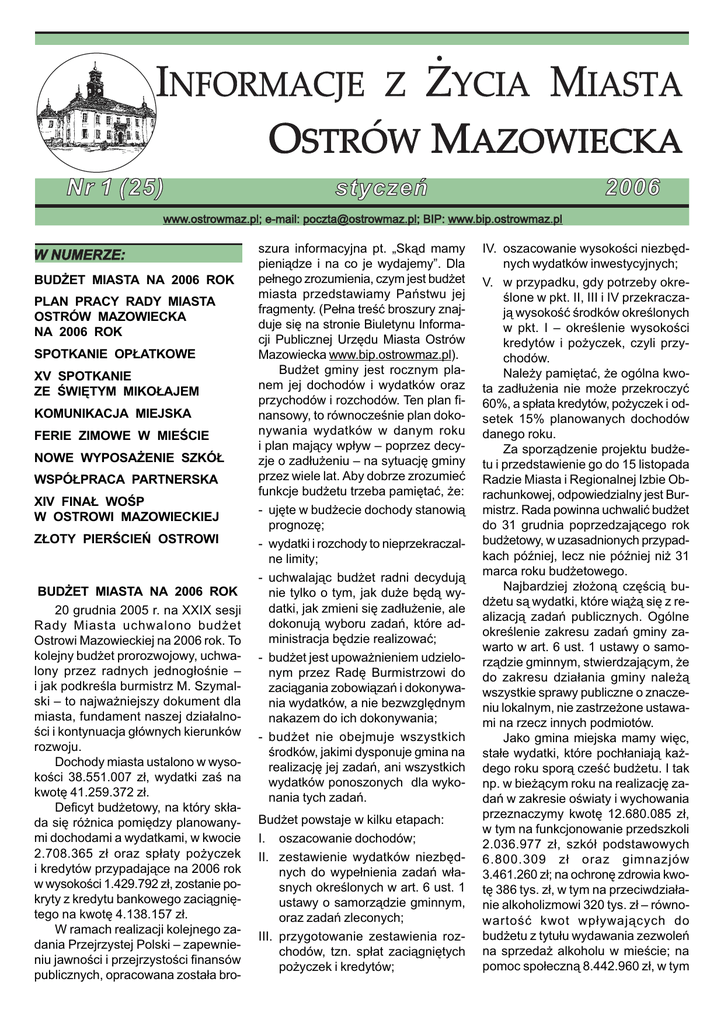 BUD¯ET MIASTA NA 2006 ROK PLAN PRACY RADY MIASTA OSTRÓW MAZOWIECKA NA 2006 ROK SPOTKANIE OP£ATKOWE XV SPOTKANIE ZE WIÊTYM MIKO£AJEM KOMUNIKACJA MIEJSKA FERIE ZIMOWE W MIECIE NOWE WYPOSA¯ENIE SZKÓ£ WSPÓ£PRACA PARTNERSKA XIV FINA£ WOP W OSTROWI MAZOWIECKIEJ Z£OTY PIERCIEÑ OSTROWI BUD¯ET MIASTA NA 2006 ROK 20 grudnia 2005 r. na XXIX sesji Rady Miasta uchwalono bud¿et Ostrowi Mazowieckiej na 2006 rok. To kolejny bud¿et prorozwojowy, uchwalony przez radnych jednog³onie i jak podkrela burmistrz M. Szymalski to najwa¿niejszy dokument dla miasta, fundament naszej dzia³alnoci i kontynuacja g³ównych kierunków rozwoju. Dochody miasta ustalono w wysokoci 38.551.007 z³, wydatki za na kwotê 41.259.372 z³. Deficyt bud¿etowy, na który sk³ada siê ró¿nica pomiêdzy planowanymi dochodami a wydatkami, w kwocie 2.708.365 z³ oraz sp³aty po¿yczek i kredytów przypadaj¹ce na 2006 rok w wysokoci 1.429.792 z³, zostanie pokryty z kredytu bankowego zaci¹gniêtego na kwotê 4.138.157 z³. W ramach realizacji kolejnego zadania Przejrzystej Polski zapewnieniu jawnoci i przejrzystoci finansów publicznych, opracowana zosta³a bro- szura informacyjna pt. Sk¹d mamy pieni¹dze i na co je wydajemy. Dla pe³nego zrozumienia, czym jest bud¿et miasta przedstawiamy Pañstwu jej fragmenty. (Pe³na treæ broszury znajduje siê na stronie Biuletynu Informacji Publicznej Urzêdu Miasta Ostrów Mazowiecka www.bip.ostrowmaz.pl). Bud¿et gminy jest rocznym planem jej dochodów i wydatków oraz przychodów i rozchodów. Ten plan finansowy, to równoczenie plan dokonywania wydatków w danym roku i plan maj¹cy wp³yw poprzez decyzje o zad³u¿eniu na sytuacjê gminy przez wiele lat. Aby dobrze zrozumieæ funkcje bud¿etu trzeba pamiêtaæ, ¿e: - ujête w bud¿ecie dochody stanowi¹ prognozê; - wydatki i rozchody to nieprzekraczalne limity; - uchwalaj¹c bud¿et radni decyduj¹ nie tylko o tym, jak du¿e bêd¹ wydatki, jak zmieni siê zad³u¿enie, ale dokonuj¹ wyboru zadañ, które administracja bêdzie realizowaæ; - bud¿et jest upowa¿nieniem udzielonym przez Radê Burmistrzowi do zaci¹gania zobowi¹zañ i dokonywania wydatków, a nie bezwzglêdnym nakazem do ich dokonywania; - bud¿et nie obejmuje wszystkich rodków, jakimi dysponuje gmina na realizacjê jej zadañ, ani wszystkich wydatków ponoszonych dla wykonania tych zadañ. Bud¿et powstaje w kilku etapach: I. oszacowanie dochodów; II. zestawienie wydatków niezbêdnych do wype³nienia zadañ w³asnych okrelonych w art. 6 ust. 1 ustawy o samorz¹dzie gminnym, oraz zadañ zleconych; III. przygotowanie zestawienia rozchodów, tzn. sp³at zaci¹gniêtych po¿yczek i kredytów; IV. oszacowanie wysokoci niezbêdnych wydatków inwestycyjnych; V. w przypadku, gdy potrzeby okrelone w pkt. II, III i IV przekraczaj¹ wysokoæ rodków okrelonych w pkt. I okrelenie wysokoci kredytów i po¿yczek, czyli przychodów. Nale¿y pamiêtaæ, ¿e ogólna kwota zad³u¿enia nie mo¿e przekroczyæ 60%, a sp³ata kredytów, po¿yczek i odsetek 15% planowanych dochodów danego roku. Za sporz¹dzenie projektu bud¿etu i przedstawienie go do 15 listopada Radzie Miasta i Regionalnej Izbie Obrachunkowej, odpowiedzialny jest Burmistrz. Rada powinna uchwaliæ bud¿et do 31 grudnia poprzedzaj¹cego rok bud¿etowy, w uzasadnionych przypadkach póniej, lecz nie póniej ni¿ 31 marca roku bud¿etowego. Najbardziej z³o¿on¹ czêci¹ bud¿etu s¹ wydatki, które wi¹¿¹ siê z realizacj¹ zadañ publicznych. Ogólne okrelenie zakresu zadañ gminy zawarto w art. 6 ust. 1 ustawy o samorz¹dzie gminnym, stwierdzaj¹cym, ¿e do zakresu dzia³ania gminy nale¿¹ wszystkie sprawy publiczne o znaczeniu lokalnym, nie zastrze¿one ustawami na rzecz innych podmiotów. Jako gmina miejska mamy wiêc, sta³e wydatki, które poch³aniaj¹ ka¿dego roku spor¹ czeæ bud¿etu. I tak np. w bie¿¹cym roku na realizacjê zadañ w zakresie owiaty i wychowania przeznaczymy kwotê 12.680.085 z³, w tym na funkcjonowanie przedszkoli 2.036.977 z³, szkó³ podstawowych 6.800.309 z³ oraz gimnazjów 3.461.260 z³; na ochronê zdrowia kwotê 386 tys. z³, w tym na przeciwdzia³anie alkoholizmowi 320 tys. z³ równowartoæ kwot wp³ywaj¹cych do bud¿etu z tytu³u wydawania zezwoleñ na sprzeda¿ alkoholu w miecie; na pomoc spo³eczn¹ 8.442.960 z³, w tym m.in. dodatki mieszkaniowe 910 tys. z³, wiadczenia spo³eczne 5.901 tys. z³; na edukacyjn¹ opiekê wychowawcz¹ 401.785 z³, w tym funkcjonowanie wietlic szkolnych 324 tys. z³; na gospodarkê komunaln¹ i ochronê rodowiska 1.945.413 z³, w tym m.in. oczyszczanie miasta 607 tys. z³, utrzymanie zieleni 107 tys. z³, owietlenie ulic 505 tys. z³; na kulturê i ochronê dziedzictwa narodowego 1.532.214 z³, w tym na funkcjonowanie Miejskiego Domu Kultury 846 tys. z³, Miejskiej Biblioteki Publicznej 632.214 z³; na kulturê fizyczn¹ i sport, w ramach dzia³añ Miejskiego Orodka Sportu i Rekreacji 1.364.827 z³. W zwi¹zku z bardzo dobr¹ sytuacj¹ finansow¹ miasta, w bud¿ecie na 2006 r. przeznaczono a¿ 8.464.647 z³ na inwestycje, co stanowi 20,5% planowanych wydatków ogó³em. Najwa¿niejsza inwestycja to budowa Centrum Kultury i Rekreacji Za Stawem na ponad 5 mln z³, w tym rodki w³asne 1.973.350 z³ oraz kredyt w wysokoci 3.138.157 z³. Dodatkowo na realizacjê tego zadania bêdziemy ubiegaæ siê o rodki z zewn¹trz na ponad 9 mln z³. Rok 2006 to kolejny rok wzmo¿onych wydatków na inwestycje drogowe na ³¹czn¹ kwotê 1.727 tys. z³, z czego 500 tys. stanowi¹ rodki w³asne, 1 mln z³ kredytu oraz 227 tys. z³ rodki pozyskane z zewn¹trz. Kontynuujemy przebudowê ulic: Akacjowej (55.250 z³), W. Broniewskiego II etap (303 tys. z³), Lenej (76 tys. z³), M³yñskiej (100 tys. z³), R. Traugutta (98.750 z³), Winiowej (100 tys. z³). Nowe inwestycje w zakresie przebudowy ulic obejmuj¹: ul. Klonow¹ (86 tys. z³), Królowej Bony (101 tys. z³), Ksi¹¿êc¹ (100 tys. z³), M. Malinowskiego (65 tys. z³), Mieszka (119.300 z³