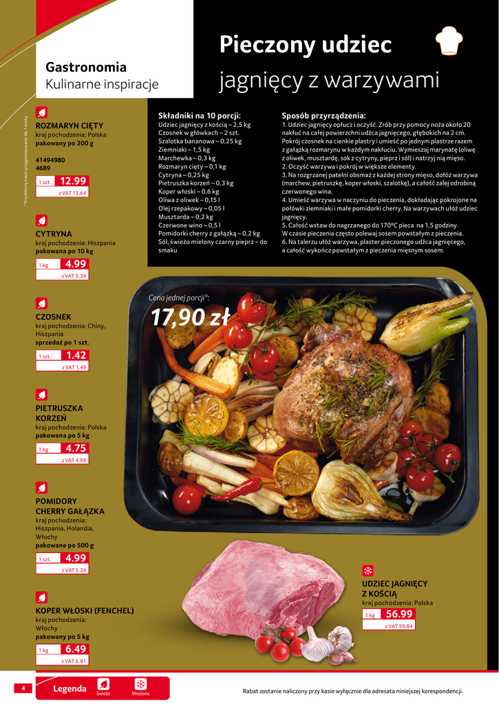 * Przybliżony koszt przygotowywania dla 1 osoby Gastronomia Kulinarne inspiracje ROZMARYN CIĘTY kraj pochodzenia: Polska pakowany po 200 g 41494980 4689 1 szt. 12.99 z VAT 13.64 CYTRYNA kraj pochodzenia: Hiszpania pakowana po 10 kg 1 kg Pieczony udziec jagnięcy z warzywami Składniki na 10 porcji: Sposób przyrządzenia: Udziec jagnięcy z kością – 2,5 kg Czosnek w główkach – 2 szt. Szalotka bananowa – 0,25 kg Ziemniaki – 1,5 kg Marchewka – 0,3 kg Rozmaryn cięty – 0,1 kg Cytryna – 0,25 kg Pietruszka korzeń – 0,3 kg Koper włoski – 0,6 kg Oliwa z oliwek – 0,15 l Olej rzepakowy – 0,05 l Musztarda – 0,2 kg Czerwone wino – 0,5 l Pomidorki cherry z gałązką – 0,2 kg Sól, świeżo mielony czarny pieprz – do smaku 1. Udziec jagnięcy opłucz i oczyść. Zrób przy pomocy noża około 20 nakłuć na całej powierzchni udźca jagnięcego, głębokich na 2 cm. Pokrój czosnek na cienkie plastry i umieść po jednym plastrze razem z gałązką rozmarynu w każdym nakłuciu. Wymieszaj marynatę (oliwę z oliwek, musztardę, sok z cytryny, pieprz i sól) i natrzyj nią mięso. 2. Oczyść warzywa i pokrój w większe elementy. 3. Na rozgrzanej patelni obsmaż z każdej strony mięso, dołóż warzywa (marchew, pietruszkę, koper włoski, szalotkę), a całość zalej odrobiną czerwonego wina. 4. Umieść warzywa w naczyniu do pieczenia, dokładając pokrojone na połówki ziemniaki i małe pomidorki cherry. Na warzywach ułóż udziec jagnięcy. 5. Całość wstaw do nagrzanego do 170⁰C pieca na 1,5 godziny. W czasie pieczenia często polewaj sosem powstałym z pieczenia. 6. Na talerzu ułóż warzywa, plaster pieczonego udźca jagnięcego, a całość wykończ powstałym z pieczenia mięsnym sosem. 4.99 z VAT 5.39 Cena jednej porcji*: 17,90 zł CZOSNEK kraj pochodzenia: Chiny, Hiszpania sprzedaż po 1 szt. 1 szt. 1.42 z VAT 1.49 PIETRUSZKA KORZEŃ kraj pochodzenia: Polska pakowana po 5 kg 1 kg 4.75 z VAT 4.99 POMIDORY CHERRY GAŁĄZKA kraj pochodzenia: Hiszpania, Holandia, Włochy pakowane po 500 g 1 szt. 4.99 z VAT 5.24 UDZIEC JAGNIĘCY Z KOŚCIĄ KOPER WŁOSKI (FENCHEL) kraj pochodzenia: Włochy pakowany po 5 kg 1 kg kraj pochodzenia: Polska 1 kg 56.99 z VAT 59.84 6.49 z VAT 6.81 4 Legenda Świeże Mrożone Rabat zostanie naliczony przy kasie wyłącznie dla adresata niniejszej korespondencji.