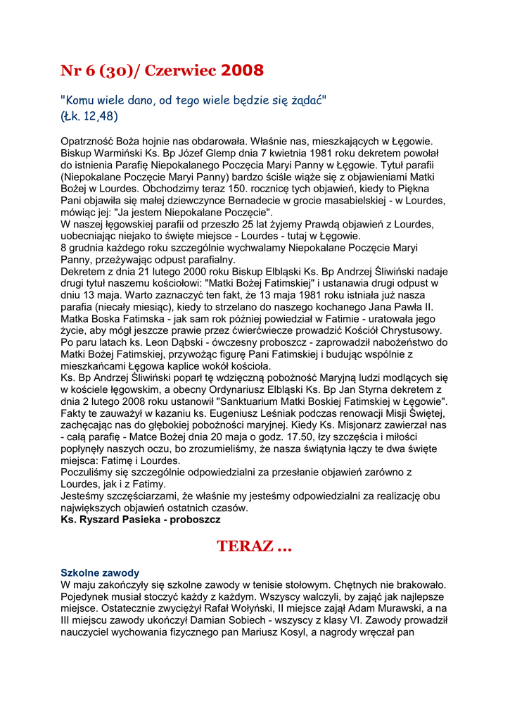 Nr 6 (30)/ Czerwiec 2008 "Komu wiele dano, od tego wiele będzie się żądać" (Łk. 12,48) Opatrzność Boża hojnie nas obdarowała. Właśnie nas, mieszkających w Łęgowie. Biskup Warmiński Ks. Bp Józef Glemp dnia 7 kwietnia 1981 roku dekretem powołał do istnienia Parafię Niepokalanego Poczęcia Maryi Panny w Łęgowie. Tytuł parafii (Niepokalane Poczęcie Maryi Panny) bardzo ściśle wiąże się z objawieniami Matki Bożej w Lourdes. Obchodzimy teraz 150. rocznicę tych objawień, kiedy to Piękna Pani objawiła się małej dziewczynce Bernadecie w grocie masabielskiej - w Lourdes, mówiąc jej: "Ja jestem Niepokalane Poczęcie". W naszej łęgowskiej parafii od przeszło 25 lat żyjemy Prawdą objawień z Lourdes, uobecniając niejako to święte miejsce - Lourdes - tutaj w Łęgowie. 8 grudnia każdego roku szczególnie wychwalamy Niepokalane Poczęcie Maryi Panny, przeżywając odpust parafialny. Dekretem z dnia 21 lutego 2000 roku Biskup Elbląski Ks. Bp Andrzej Śliwiński nadaje drugi tytuł naszemu kościołowi: "Matki Bożej Fatimskiej" i ustanawia drugi odpust w dniu 13 maja. Warto zaznaczyć ten fakt, że 13 maja 1981 roku istniała już nasza parafia (niecały miesiąc), kiedy to strzelano do naszego kochanego Jana Pawła II. Matka Boska Fatimska - jak sam rok później powiedział w Fatimie - uratowała jego życie, aby mógł jeszcze prawie przez ćwierćwiecze prowadzić Kościół Chrystusowy. Po paru latach ks. Leon Dąbski - ówczesny proboszcz - zaprowadził nabożeństwo do Matki Bożej Fatimskiej, przywożąc figurę Pani Fatimskiej i budując wspólnie z mieszkańcami Łęgowa kaplice wokół kościoła. Ks. Bp Andrzej Śliwiński poparł tę wdzięczną pobożność Maryjną ludzi modlących się w kościele łęgowskim, a obecny Ordynariusz Elbląski Ks. Bp Jan Styrna dekretem z dnia 2 lutego 2008 roku ustanowił "Sanktuarium Matki Boskiej Fatimskiej w Łęgowie". Fakty te zauważył w kazaniu ks. Eugeniusz Leśniak podczas renowacji Misji Świętej, zachęcając nas do głębokiej pobożności maryjnej. Kiedy Ks. Misjonarz zawierzał nas - całą parafię - Matce Bożej dnia 20 maja o godz. 17.50, łzy szczęścia i miłości popłynęły naszych oczu, bo zrozumieliśmy, że nasza świątynia łączy te dwa święte miejsca: Fatimę i Lourdes. Poczuliśmy się szczególnie odpowiedzialni za przesłanie objawień zarówno z Lourdes, jak i z Fatimy. Jesteśmy szczęściarzami, że właśnie my jesteśmy odpowiedzialni za realizację obu największych objawień ostatnich czasów. Ks. Ryszard Pasieka - proboszcz TERAZ ... Szkolne zawody W maju zakończyły się szkolne zawody w tenisie stołowym. Chętnych nie brakowało. Pojedynek musiał stoczyć każdy z każdym. Wszyscy walczyli, by zająć jak najlepsze miejsce. Ostatecznie zwyciężył Rafał Wołyński, II miejsce zajął Adam Murawski, a na III miejscu zawody ukończył Damian Sobiech - wszyscy z klasy VI. Zawody prowadził nauczyciel wychowania fizycznego pan Mariusz Kosyl, a nagrody wręczał pan dyrektor - Jan Wójcik. Adam Murawski 16 maja w Kisielicach odbył się turniej piłkarski "Z podwórka na Stadion" dziewcząt i chłopców na szczeblu gminnym. Naszą szkołę reprezentowały klasy II i III w składzie: Iza Umińska, Klaudia Bachor, Marysia Głowacka, Kinga Herzberg, Iza Bartnikowska, Andżelika Kuchnia, Patryk Melerski, Mariusz Szpakowski, Bartek Mućka, Bartek Żaczek, Kamil Ciesiński, Damian Katan. Dziewczęta zajęły drugie miejsce. Chłopcy zaś wygrali zawody gminne po pokonaniu Gorynia oraz Kisielic i awansowali do rozgrywek powiatowych. Na szczeblu powiatowym 21 maja drużyna chłopców zdobyła III miejsce. Trenerem łęgowskiej drużyny był Piotr Jakubczyk. Jan Wójcik Renowacja Misji św. w naszej parafii Minął już rok od zakończenia Misji św. w naszym kościele. W tym roku przeżywaliśmy ich renowację. Do naszej parafii przyjechał, podobnie jak w tamtym roku, Ks. Misjonarz Eugeniusz Leśniak. W niedzielę, 18maja, uczestniczyliśmy w pięknym nabożeństwie majowym. Zebraliśmy się wokół Krzyża Misyjnego w naszej wsi. Po odśpiewaniu Litanii Loretańskiej i błogosławieństwie udzielonym przez Ks. Misjonarza, leśniczy Henryk Wróbel przybliżył nam historię świerków, które wyrosły z nasion poświęconych przez papieża Benedykta XVI. Drzewka te posadzone zostały po obu stronach krzyża. Leśniczy przekazał Ks. Proboszczowi - Ryszardowi Pasiece odpowiedni certyfikat. Krystyna Chmielewska Razem z dziećmi z naszej szkoły uczestniczyłem w odnowieniu Misji św. Chodziliśmy do kościoła, gdzie Ks. Misjonarz opowiadał nam różne ciekawe historie. Wyjaśniał nam rzeczy, których jeszcze nie znaliśmy, zachęcał do wspólnej modlitwy. Wspólnie z księdzem i Nikolą Wojtczuk odprawialiśmy Drogę Krzyżową. Nikola była narratorem, ja byłem dzieckiem, a ksiądz mówił słowa Pana Jezusa. Trochę się denerwowałem, ale wszystko zakończyło się dobrze. Byłem dumny, że brałem udział w tym nabożeństwie. Damian Sobiech W uroczystość Bożego Ciała w kościele o godz. 10.00 była odprawiona Msza św., po której wyruszyliśmy z procesją przez wioskę. Razem z Proboszczem i Ks. Misjonarzem modliliśmy się przy czterech pięknie przygotowanych przez parafian ołtarzach, śpiewaliśmy pieśni. Ostatni ołtarz znajdował się przy Krzyżu Misyjnym. Tam Ks. Proboszcz udzielił błogosławieństwa na 4 strony świata. Po tej wspaniałej uroczystości odnowieni duchowo i z Ciałem Pana Jezusa w sercach wróciliśmy do swoich domów. Anna Ostrowska Dzień Matki Dzień Matki to jeden z najpiękniejszych dni w roku. Z tej okazji dzieci z młodszych klas zaprosiły mamy do szkoły i przedstawiły różne wierszyki, piosenki, zagrały nawet na fletach. Na twarzach mam był uśmiech, niektórym ze wzruszenia zakręciły się łzy w oczach. Potem mamy zostały zaproszone na poczęstunek. Żaneta Sadowska WKRÓTCE ... Intencje Mszy św. w czerwcu 01.06.