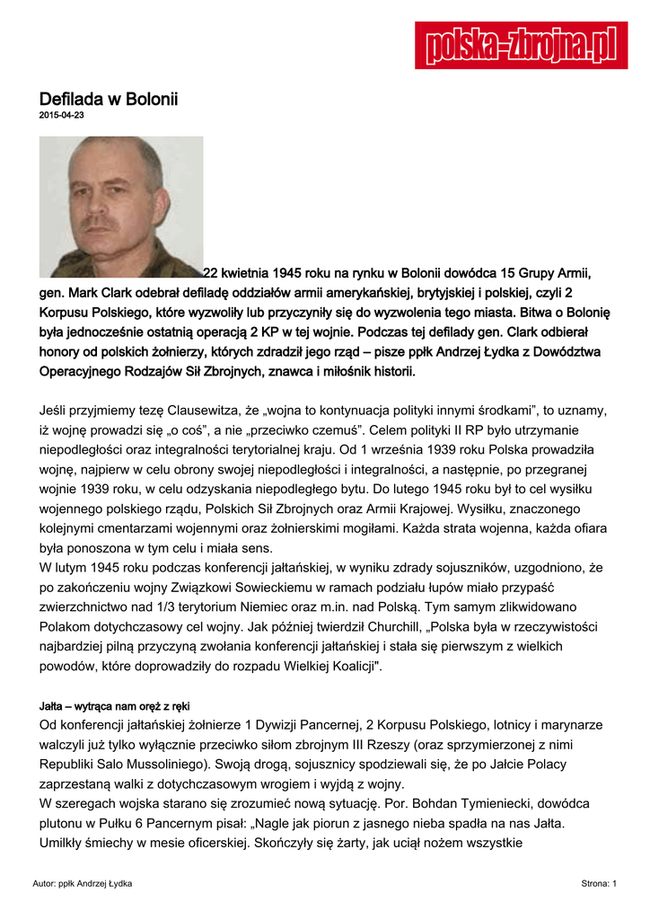 Defilada w Bolonii 2015-04-23 22 kwietnia 1945 roku na rynku w Bolonii dowódca 15 Grupy Armii, gen. Mark Clark odebrał defiladę oddziałów armii amerykańskiej, brytyjskiej i polskiej, czyli 2 Korpusu Polskiego, które wyzwoliły lub przyczyniły się do wyzwolenia tego miasta. Bitwa o Bolonię była jednocześnie ostatnią operacją 2 KP w tej wojnie. Podczas tej defilady gen. Clark odbierał honory od polskich żołnierzy, których zdradził jego rząd – pisze ppłk Andrzej Łydka z Dowództwa Operacyjnego Rodzajów Sił Zbrojnych, znawca i miłośnik historii. Jeśli przyjmiemy tezę Clausewitza, że „wojna to kontynuacja polityki innymi środkami”, to uznamy, iż wojnę prowadzi się „o coś”, a nie „przeciwko czemuś”. Celem polityki II RP było utrzymanie niepodległości oraz integralności terytorialnej kraju. Od 1 września 1939 roku Polska prowadziła wojnę, najpierw w celu obrony swojej niepodległości i integralności, a następnie, po przegranej wojnie 1939 roku, w celu odzyskania niepodległego bytu. Do lutego 1945 roku był to cel wysiłku wojennego polskiego rządu, Polskich Sił Zbrojnych oraz Armii Krajowej. Wysiłku, znaczonego kolejnymi cmentarzami wojennymi oraz żołnierskimi mogiłami. Każda strata wojenna, każda ofiara była ponoszona w tym celu i miała sens. W lutym 1945 roku podczas konferencji jałtańskiej, w wyniku zdrady sojuszników, uzgodniono, że po zakończeniu wojny Związkowi Sowieckiemu w ramach podziału łupów miało przypaść zwierzchnictwo nad 1/3 terytorium Niemiec oraz m.in. nad Polską. Tym samym zlikwidowano Polakom dotychczasowy cel wojny. Jak później twierdził Churchill, „Polska była w rzeczywistości najbardziej pilną przyczyną zwołania konferencji jałtańskiej i stała się pierwszym z wielkich powodów, które doprowadziły do rozpadu Wielkiej Koalicji". Jałta – wytrąca nam oręż z ręki Od konferencji jałtańskiej żołnierze 1 Dywizji Pancernej, 2 Korpusu Polskiego, lotnicy i marynarze walczyli już tylko wyłącznie przeciwko siłom zbrojnym III Rzeszy (oraz sprzymierzonej z nimi Republiki Salo Mussoliniego). Swoją drogą, sojusznicy spodziewali się, że po Jałcie Polacy zaprzestaną walki z dotychczasowym wrogiem i wyjdą z wojny. W szeregach wojska starano się zrozumieć nową sytuację. Por. Bohdan Tymieniecki, dowódca plutonu w Pułku 6 Pancernym pisał: „Nagle jak piorun z jasnego nieba spadła na nas Jałta. Umilkły śmiechy w mesie oficerskiej. Skończyły się żarty, jak uciął nożem wszystkie Autor: ppłk Andrzej Łydka Strona: 1 nieporozumienia, kwasy, ambicje osobiste, zadrażnienia. Na to nie było już miejsca. Ci młodzi chłopcy patrzyli na nas wyczekująco, żądając wyjaśnień, chcieli mieć pełny obraz narastającej rzeczywistości. Jak im to wytłumaczyć? Jak im to uczciwie wyjaśnić? Jak sami sobie nie mogliśmy wyobrazić zaistniałej sytuacji. Nam starszym, już o tej odrobinie życiowego doświadczenia, rosło coraz bardziej przed oczami potworne widmo „konia na wzgórzu”. Dowodzący korpusem gen. Anders z podobnymi uczuciami pisał do swojego przełożonego, dowódcy 8 Armii: „Przeżywamy najcięższe chwile w naszym życiu. Ostatnia decyzja konferencji trzech, oddająca faktycznie naszą ojczyznę i nasz naród na łup bolszewikom, wytrąca nam oręż z ręki... Pozostawiliśmy na naszym szlaku, który uważaliśmy za szlak bojowy do Polski, tysiące mogił naszych towarzyszy broni. Dlatego też żołnierz 2 Korpusu odczuł ostatnią decyzję konferencji trzech jako najwyższą niesprawiedliwość, będącą w sprzeczności z jego żołnierskim poczuciem honoru... Żołnierz pyta mnie, jaki ma być cel jego walki. Nie umiem dzisiaj odpowiedzieć na to pytanie. Stała się rzecz straszna, znaleźliśmy się w położeniu, z którego „jak dotąd” nie widzę wyjścia... Widzę konieczność natychmiastowego zluzowania z odcinka bojowego oddziałów 2 Korpusu Polskiego: 1) wobec scharakteryzowanego przed chwilą nastroju żołnierzy; 2) wobec faktu, że ani ja, ani podwładni mi dowódcy nie mogliby dzisiaj znaleźć w sumieniu swym uzasadnienia dla żądania od żołnierzy 2 Korpusu Polskiego nowych ofiar”... Postanowienia Jałty były klęską polityczną polskiego rządu, a ciężar sprawy polskiej siłą rzeczy przesunął się na wojsko i dalszy jego udział w walkach. Gen. Anders, mianowany p.o. Naczelnego Wodza (Naczelny Wódz, gen. Bór-Komorowski przebywał w oflagu) w rozkazie do wojska pisał: „Żołnierze, marynarze, lotnicy! [...] Polskie Siły Zbrojne pozostają w dalszym ciągu wyrazem suwerenności Rzeczypospolitej [...] Aby siła nie rządziła nad prawem, pierwsi chwyciliśmy za broń 1 września 1939. Ze sztandarami okrytymi chwałą stajemy dziś w obliczu największej tragedii naszego narodu. Oczy wszystkich Polaków rozrzuconych po świecie, a przede wszystkim umęczonego Kraju, patrzą na nas z uczuciem nadziei. Wiedzą oni, że nasz ciężki marsz żołnierski kontynuować będziemy zgodnie z naszą przysięgą, z rozkazami Pana Prezydenta, prawowitego przedstawiciela majestatu Rzeczypospolitej Polskiej, oraz z postanowieniami legalnego rządu. Pamiętać musimy, że w wyniku tej wojny zatryumfować ma uczciwość i sprawiedliwość. Uczciwy i sprawiedliwy świat nie może być bez Polski wielkiej, silnej i niepodległej. Zgodnie z honorem, do Polski takiej wrócić chcemy z bronią w ręku. A jeżeli obcy ludzie, lub bojaźliwi, pytać was będą, o co walczycie, odpowiadajcie, że żołnierz polski bije się dziś o to samo, o co poszedł w bój pięć lat temu: aby w naszym Kraju i w świecie nigdy siła nie mogła rządzić nad prawem". Polacy w operacji wyzwolenia Bolonii Od 9 kwietnia 1945 roku 2 Korpus brał udział w operacji „Buckland” zakończonej wyzwoleniem Bolonii. Teren przyszłej walki stanowiła równina, poprzecinana rzekami i kanałami biegnącymi poprzecznie do kierunku natarcia. Brzegi rzek i kana