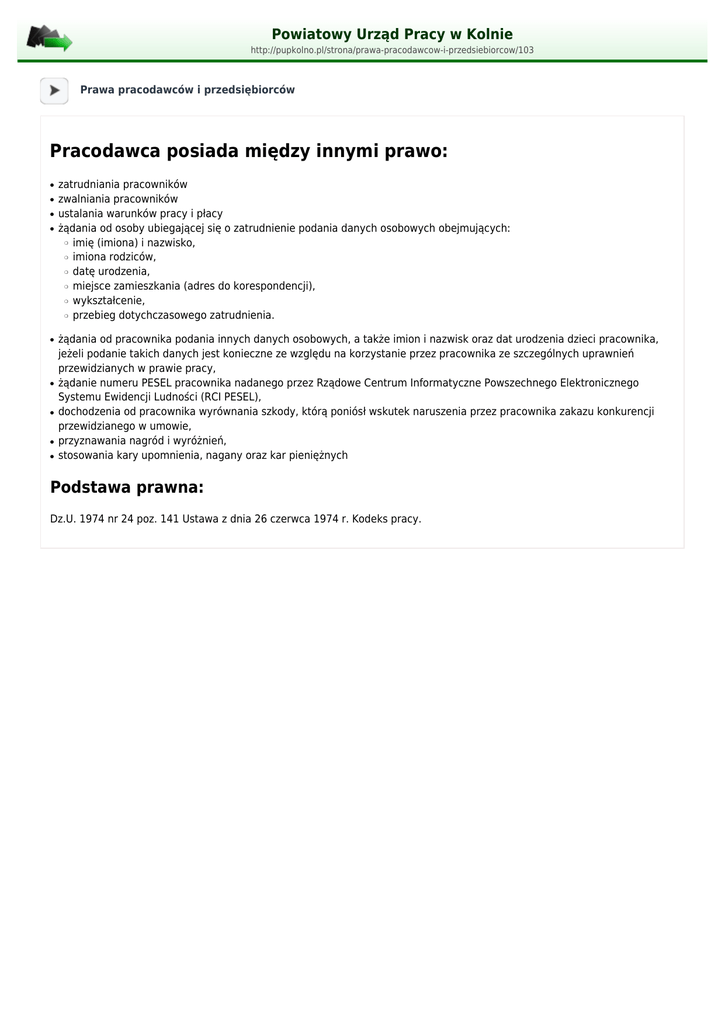 Powiatowy Urząd Pracy w Kolnie http://pupkolno.pl/strona/prawa-pracodawcow-i-przedsiebiorcow/103 Prawa pracodawców i przedsiębiorców Pracodawca posiada między innymi prawo: ● ● ● ● zatrudniania pracowników zwalniania pracowników ustalania warunków pracy i płacy żądania od osoby ubiegającej się o zatrudnienie podania danych osobowych obejmujących: imię (imiona) i nazwisko, imiona rodziców, datę urodzenia, miejsce zamieszkania (adres do korespondencji), wykształcenie, przebieg dotychczasowego zatrudnienia. ❍ ❍ ❍ ❍ ❍ ❍ ● ● ● ● ● żądania od pracownika podania innych danych osobowych, a także imion i nazwisk oraz dat urodzenia dzieci pracownika, jeżeli podanie takich danych jest konieczne ze względu na korzystanie przez pracownika ze szczególnych uprawnień przewidzianych w prawie pracy, żądanie numeru PESEL pracownika nadanego przez Rządowe Centrum Informatyczne Powszechnego Elektronicznego Systemu Ewidencji Ludności (RCI PESEL), dochodzenia od pracownika wyrównania szkody, którą poniósł wskutek naruszenia przez pracownika zakazu konkurencji przewidzianego w umowie, przyznawania nagród i wyróżnień, stosowania kary upomnienia, nagany oraz kar pieniężnych Podstawa prawna: Dz.U. 1974 nr 24 poz. 141 Ustawa z dnia 26 czerwca 1974 r. Kodeks pracy.