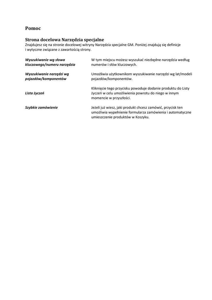 Pomoc Strona docelowa Narzędzia specjalne Znajdujesz się na stronie docelowej witryny Narzędzia specjalne GM. Poniżej znajdują się definicje i wytyczne związane z zawartością strony. Wyszukiwanie wg słowa kluczowego/numeru narzędzia W tym miejscu możesz wyszukać niezbędne narzędzia według numerów i słów kluczowych. Wyszukiwanie narzędzi wg pojazdów/komponentów Umożliwia użytkownikom wyszukiwanie narzędzi wg lat/modeli pojazdów/komponentów. Lista życzeń Kliknięcie tego przycisku powoduje dodanie produktu do Listy życzeń w celu umożliwienia powrotu do niego w innym momencie w przyszłości. Szybkie zamówienie Jeżeli już wiesz, jaki produkt chcesz zamówić, przycisk ten umożliwia wypełnienie formularza zamówienia i automatyczne umieszczenie produktów w Koszyku.
