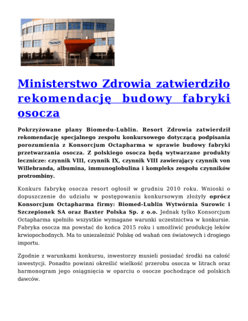 Ministerstwo Zdrowia zatwierdziło rekomendację budowy fabryki osocza Pokrzyżowane plany Biomedu-Lublin. Resort Zdrowia zatwierdził rekomendację specjalnego zespołu konkursowego dotyczącą podpisania porozumienia z Konsorcjum Octapharma w sprawie budowy fabryki przetwarzania osocza. Z polskiego osocza będą wytwarzane produkty lecznicze: czynnik VIII, czynnik IX, czynnik VIII zawierający czynnik von Willebranda, albumina, immunoglobulina i kompleks zespołu czynników protrombiny. Konkurs fabrykę osocza resort ogłosił w grudniu 2010 roku. Wnioski o dopuszczenie do udziału w postępowaniu konkursowym złożyły oprócz Konsorcjum Octapharma firmy: Biomed-Lublin Wytwórnia Surowic i Szczepionek SA oraz Baxter Polska Sp. z o.o. Jednak tylko Konsorcjum Octapharma spełniło wszystkie wymagane warunki uczestnictwa w konkursie. Fabryka osocza ma powstać do końca 2015 roku i umożliwić produkcję leków krwiopochodnych. Ma to uniezależnić Polskę od wahań cen światowych i drogiego importu. Zgodnie z warunkami konkursu, inwestorzy musieli posiadać środki na całość inwestycji. Ponadto powinni określić wielkość przerobu osocza w litrach oraz harmonogram jego osiągnięcia w oparciu o osocze pochodzące od polskich dawców. Kilka lat temu Biomed Lublin kupił niemal za bezcen laboratorium Frakcjonowania Osocza w Mielcu. MZ wymagało też gwarancji, że nadwyżki osocza, uzyskiwanego od polskich dawców, będą sprzedawane inwestorowi tak długo, jak będzie zabezpieczał w odpowiednich ilościach produkty frakcjonowania osocza na polski rynek. Inwestor będzie musiał także zobowiązać się do zakupu min. 120 tys. litrów osocza rocznie od Regionalnych Centrów Krwiodawstwa i Krwiolecznictwa. W Polsce uzyskuje się około 250 tys. litrów osocza rocznie, z czego do celów klinicznych (przede wszystkim do przetoczeń pacjentom w szpitalach) zużywa się ok. 30 proc. osocza pochodzącego od honorowych dawców. Pozostała nadwyżka – około 70 proc. (180 tys. l rocznie) powinna zostać przeznaczona do przetwarzania w leki, m.in. na hemofilię. Obecnie nadwyżka osocza jest sprzedawana zagranicznym firmom. Przed Sądem Okręgowym w Warszawie trwa proces w sprawie afery Laboratorium Frakcjonowania Osocza, które jako jedyne w kraju miało produkować leki z osocza. W 1997 roku spółka zaciągnęła 32 mln dol. kredytu od konsorcjum bankowego na budowę fabryki w Mielcu. Gwarancji w 60 proc. udzielił rząd Włodzimierza Cimoszewicza. Spółka wykorzystała z kredytu 21 mln zł, ale zamiast fabryki wybudowano tylko dwie hale; produkcja nigdy nie ruszyła, a spółka kredytu nie spłaciła. Banki wyegzekwowały od Skarbu Państwa, jako poręczyciela, prawie 61 mln zł. Oskarżeni w sprawie afery LFO, z którego miano „wyprowadzić” kilkadziesiąt mln zł, są byli szefowie spółki: Zygmunt N. i Włodzimierz W. Grozi im do 10 lat więzienia. Obaj twierdzą, że wszystkie dokonane operacje finansowe były legalne. Źródło: PAP Data publikacji: 15.02.2012r.