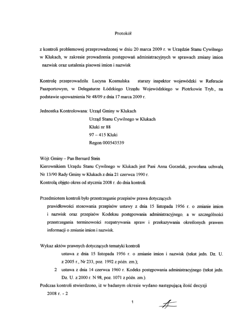 Protok6l z kontroli problemowej w Klukach, w przeprowadzonej zakresie prowadzenia w dniu 20 marca 2009 r. w Urz~dzie post~powan administracyjnych w Stanu Cywilnego sprawach zmiany imion nazwisk oraz ustalenia pisowni irnion i nazwisk Kontrol~ Lucyna Kosmulska przeprowadzila Paszportowym, w De1egaturze L6dzkiego starszy inspektor Urz~du Wojew6dzkiego wojew6dzki w Referacie w Piotrkowie Tryb., na podstawie upowaZ;nienia Nr 48/09 z dnia 17 marca 2009 r. Jednostka Kontrolowana: Urz",d Gminy w Klukach Urz'i.d Stanu Cywilnego w Klukach Kluki nr 88 97- 415 Kluki Regon 000543539 w 6jt Gminy -Pan Kierownikiem Bernard Urz~du Stein Stanu Cywilnego Nr 13/90 Rady Gminy w Klukach w Klukach jest Pani Anna Gorzelak, powolana uchwal8c z dnia 21 czerwca 1990 r. Kontroll\. obj~to okres od stycznia 2008 r. do dnia kontroli. Przedmiotem kontroli bylo przestrzeganie przepis6w prawa dotyczC\:cych prawidlowosci i nazwisk oraz stosowania przepis6w ustawy z dnia 15 listopada 1956 r. o zmianie imion przepis6w przestrzegania tenninowosci Kodeksu post~powania rozpatrywania administracyjnego: spraw i przekazywania a w szczeg61nosci okreslonych prawem informacji o zmianie imion i nazwisk. Wykaz akt6w prawnych dotycz",cych tematyki kontroli ustawa z dnia 15 listopada 1956 r. o zrnianie imion i nazwisk (tekst jedn. Dz. U. z 2005 r., Nr 233, poz. 1992 z p6in. zm.); 2 ustawa z dnia 14 czerwca 1960 r. Kodeks post~powania adrninistracyjnego (tekst jedn. Dz. U. z 2000 r. N 98, paz. 1071 z p6in. zrn.). Podczas kontroli stwierdzono, iz w badanym okresie wydano nast~puj'lC'l ilosc decyzji 2008 r. -2 1 --#= 2009 r. -2 w badanych sprawach dotycz~cych zmiany nazwiska stwierdzono co nast~puje We wszystkich sprawach zmiany nazwiska dokonano na wniosek obywateli polskich, Rozstrzygni~cia wydane zostaly zgodnie z przepisem Post~powania organu. okreslonych Wydane wart. administracyjne okreslaj",cym prowadzone z byly wlasciwosc mleJscow", termin6w zachowaniem 35 K.p.a decyzje zawierajC\. uzasadnienia faktyczne i prawne. Uzasadnienia sformulowano jednak w spos6b nazbyt og61nikowy, ograniczaja..csi~ jedynie do powt6rzenia tresci podania wnioskodawcy i nie odzwierciedlaj'lc Post~powania zawartego wyjasniaja..ce r6wniez nie zostaly przeprowadzone wskazanych przez stron~ przyczyn i okolicznosci nast~powaly w aktach sprawy materialu w oparciu o zamieszczone dowodowego w spos6b wnikliwy, zmiany nazwiska. Rozstrzygni~cia we wnioskach informacje co do na og6l i zal~czone do nich dokumenty. w dw6ch sprawach bl~dnie wskazano w sentencji decyzji i w uzasadnieniu decyzji podstaw~ prawnCl:, wskazujC\:c art. 2 ust. 2 pkt 2 cyt. ustawy, podczas gdy decyzja winna zostac wydana w trybie art. Ponadto 2 ust cyt. zwr6cono administracyjnego ustawy uwag~ i iz Kodeks prowadzenia i wszcz~cie wykluczaj,\:. iz w zawiadomieniach o wszcz~ciu post~powania w dw6ch sprawach oraz w wydanych w tych sprawach rozstrzygni~ciach wskazano, iz post~powania nalezy, na fakt, prowadzone byly jednoczesnie z urz~du i na wniosek. Wyjasnic post~powania adrninistracyjnego przewiduje post~powania post~powania administracyjnego na wniosek. Nieprawidlowym jest post~powania administracyjnego post~powania te zostaly wszcz~te tj. Sa..to odr~bne wszcz~cie sentencjach rozstrzygni~te tryby kt6re w zawiadomieniach decyzji wszcz~cia post~powania tryby post~powania, zatem umieszczanie w dwa z urz~du wzajemnie si~ o wszcz~ciu jednoczesnej informacji. lZ z urz~du i na z",danie. Ponadto zauwazyc nalezy, iz ustawa z dnia 15 listopada 1956 r. o zmianie imion i nazwisk (tekst jedn. Dz. U. z 2005 r., Nr 233, poz. 1992 z p6in. zm.), przewiduje wszcz~cie post~powania i prowadzenie sprawy lla wniosek obywatela polskiego (art. 1 cyt. ustawy). Dor~czenie decyzji zostalo potwierdzOlle podpisem stroll, ze wskazalliem daty dor~czellia. W aktach nazwiska sprawy instytucji Podczas instruktazu znajdujC\. si~ dokumenty i organ6w, kontroli wymienionych udzielono oraz wskaz6wek swiadczC\.ce o zawiadomieniu wart. Kierownikowi II zmiany ust. 1 u.z.i.n. Urz~du w zakresie scislego stosowania 2 odnosnie Stanu Cywilnego przepis6w w Klukach ustawy o zmianie imion i nazwisk oraz ustawy Kodeks post~powania Fakt kontroli zostal wpisany w ksi'lzce kontroli Protok61 sporz'ldzono administracyjnego. pod poz. Nr 2/2009 w dw6ch jednobrzmi'lcych egzemplarzach, z kt6rych jeden przekazano kierownikowi podmiotu kontrolowanego. Kierownikowi kontrolowanej jednostki przysluguje, przed podpisaniem protokolu kontroli, prawo zgloszenia umotywowanych zastrzezell, co do ustalell zawartych w protokole Zastrzezenia naleZy zglosic na pismie organowi zarz&.dzaj&.cemu kontrol~ w terminie 14 dni od otrzymania protokolu kontroli. Kierownik jednostki podpisania protokolu kontrolowanej kontroli lub osoba pelni&.ca jego obowi'lZki skladaj&.c w terminie 7 dni od dnia jego otrzymania pisemne wyjasnienia tej odmowy. Podpis V Kierownika Jednostki O~~::::::: DELEGA TURA t6DZKIEGO UR.Z~DU WOJEW6DZKIEGO W PIOTRKOWIE TRYBUNALSKIM 97.300 Piotrkow T ryb. ul. Sienkiewicza 16 A Podpis osoby kontroluja,.cej =-- STARSZYINSPEKTOR ~ B~eln / (zA Miejscowosc, .., ;?t/' ;- ..# dnia f'. .~ moze odm6wic JEW6DZK ucyna.Kl)5'1iIulslia 0.J/YYUi l'C( r .;t' G .rtJl( 3 , iAj}o.9,y ~ ~