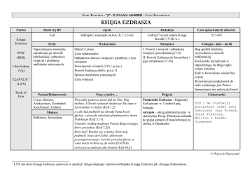 STARY TESTAMENT - $nt - H PALAIA DIAQHKH - VETUS TESTAMENTUM KSIĘGA EZDRASZA Nazwa Księga Ezdrasza עזרא (BHS) Liber Esdrae (Vg) Skrót wg BT Język Redakcja Czas opisywanych zdarzeń Ezd hebrajski; aramejski (4,8-6,18; 7,12-26) Ezdrasz? uczeń autora Księgi Kronik? (V-III w.) 537-467 Treść Wydarzenia Struktura Teologia - idee - myśli I. Powrót z niewoli i odbudowa świątyni jeroozlimskiej (1-6) II. Powrót Ezdrasza do Jerozolimy i jego działalność (7-10) Bóg spełnił obietnice wyzwolenia z niewoli babilońskiej Król perski narzędziem w rękach Boga, bo Bóg rządzi całym światem Kult w Jerozolimie winien być czysty Kryterium przynależności do ludu wybranego jest Prawo Samarytanie nie należą do Izrael Parę cytatów… Pojęcia Ciekawostki Wszystkie państwa ziemi dał mi Pan, Bóg niebios. I On mi rozkazał zbudować Mu dom w Jerozolimie w Judzie (Ezd 1,2) A cały lud podniósł na chwałę Pana krzyk głośny, z powodu założenia fundamentów domu Pańskiego (Ezd 3,11) Ustanów według mądrego Prawa Boga twojego, które posiadasz (Ezd 7,25) Boże mój! Bardzo się wstydzę, Boże mój, podnieść twarz do Ciebie, albowiem przestępstwa nasze wzrosły powyżej głowy, a wina nasza wzbiła się do nieba (Ezd 9,6) Jest jeszcze nadzieja dla Izraela (Ezd 10,2) Pamiętniki Ezdrasza - fragmenty Ezd spisane w 1 osobie l.poj. Satrapia satrapia - okręg administracyjny w starożytnej Persji. Palestyna należała do piątej satrapii (Transeufrateja) ze stolicą w Damaszku Ezd i Ne stanowiły początkowo jeden zwój hebrajski (wg: Talmud, Józef Flawiusz, Meliton z Sardes Orygenes) Najważniejsze momenty odrodzenia po niewoli babilońskiej: odbudowa świątyni i problemy małżeństw mieszanych ΕΣΔΡΑΣ Β`1 (LXX) Book of Ezra Postaci/Bohaterowie Cyrus, Dariusz, Artakserkses, ZorobabelSzeszbassar, Ezdrasz Miejsca Babilonia, Jerozolima Dekret Cyrusa Lista repatriantów Odbudowa ołtarza i świątyni i problemy z tym związane Poświęcenie swiatyni (515 r. p.n.e.) Powrót Ezdrasza (468 r. p.n.e.?) Sprawa małżeństw mieszanych Lista winnych © Wojciech Węgrzyniak 1 LXX ma dwie Księgi Ezdrasza, pierwsza to aporkyf, druga obejmuje zarówno hebrajską Księgę Ezdrasza jak i Księgą Nehemiasza.