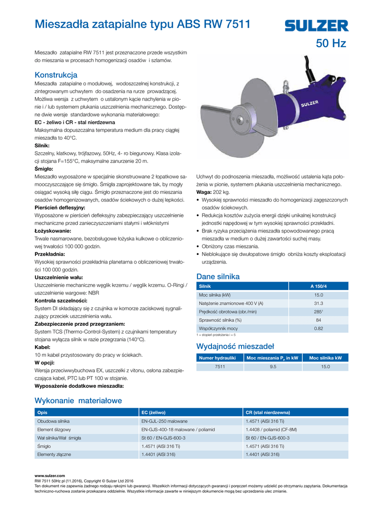 50 Hz Mieszadła zatapialne typu ABS RW 7511