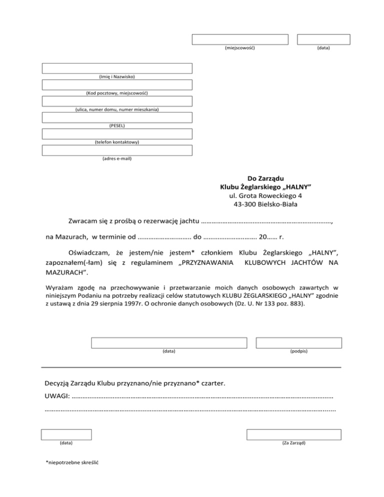 (miejscowość) (data) (Imię i Nazwisko) (Kod pocztowy, miejscowość) (ulica, numer domu, numer mieszkania) (PESEL) (telefon kontaktowy) (adres e-mail) Do Zarządu Klubu Żeglarskiego „HALNY” ul. Grota Roweckiego 4 43-300 Bielsko-Biała Zwracam się z prośbą o rezerwację jachtu ………………………………………………………………., na Mazurach, w terminie od ………………….…….. do …………………..……. 20…… r. Oświadczam, że jestem/nie jestem* członkiem Klubu Żeglarskiego „HALNY”, zapoznałem(-łam) się z regulaminem „PRZYZNAWANIA KLUBOWYCH JACHTÓW NA MAZURACH”. Wyrażam zgodę na przechowywanie i przetwarzanie moich danych osobowych zawartych w niniejszym Podaniu na potrzeby realizacji celów statutowych KLUBU ŻEGLARSKIEGO „HALNY” zgodnie z ustawą z dnia 29 sierpnia 1997r. O ochronie danych osobowych (Dz. U. Nr 133 poz. 883). (data) (podpis) Decyzją Zarządu Klubu przyznano/nie przyznano* czarter. UWAGI: ………………………………………………………………………………………………………………………………… …………………………………………………………………………………………………………………………………………....... (data) *niepotrzebne skreślić (Za Zarząd)