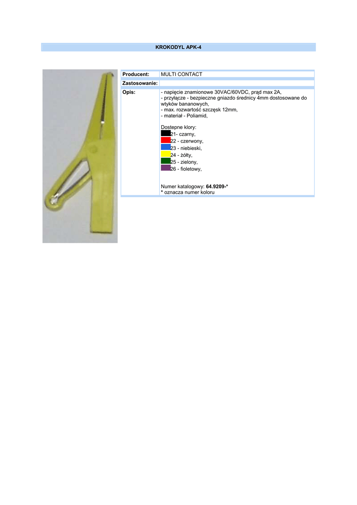 KROKODYL APK-4 Producent: MULTI CONTACT Zastosowanie: Opis: - napięcie znamionowe 30VAC/60VDC, prąd max 2A, - przyłącze - bezpieczne gniazdo średnicy 4mm dostosowane do wtyków bananowych, - max. rozwartość szczęsk 12mm, - materiał - Poliamid, Dostepne klory: 21- czarny, 22 - czerwony, 23 - niebieski, 24 - Ŝółty, 25 - zielony, 26 - fioletowy, Numer katalogowy: 64.9209-* * oznacza numer koloru