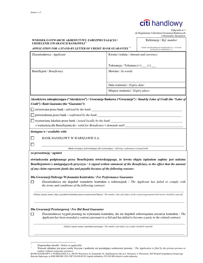 Strona 1 z 5 Załącznik nr 1 do Regulaminu Udzielania Gwarancji Bankowych i Otwierania Akredytyw Referencje / Ref. number WNIOSEK O OTWARCIE AKREDYTYWY ZABEZPIECZAJĄCEJ / UDZIELENIE GWARANCJI BANKOWEJ*1 APPLICATION FOR A STAND-BY LETTER OF CREDIT /BANK GUARANTEE *1 Zleceniodawca / Applicant BANKU HANDLOWEGO W WARSZAWIE S.A. / OF BANK HANDLOWY W WARSZAWIE S.A. Kwota i waluta / Amount and currency: Tolerancja / Tolerance (+) ___ (-) ___ Beneficjent / Beneficiary Słownie / In words: Data ważności / Expiry date: Miejsce ważności / Expiry place: Akredytywa zabezpieczająca (“Akredytywa”) / Gwarancja Bankowa (“Gwarancja”) / Stand-by Letter of Credit (the “Letter of Credit”) / Bank Guarantee (the “Guarantee”): awizowana przez bank / advised by the bank __________________________________________________________ potwierdzona przez bank / confirmed by the bank ______________________________________________________ wystawiona lokalnie przez bank / issued locally by the bank ______________________________________________ z ważnością dla Beneficjenta do / valid for Beneficiary’s demands until _____________________________________ dostępna w / available with: BANK HANDLOWY W WARSZAWIE S.A. ___________________________________________________________________________________________ (Bank awizujący, potwierdzający lub wystawiający / Advising, confirming or issuing bank) za prezentację / against oświadczenia podpisanego przez Beneficjenta stwierdzającego, że kwota objęta żądaniem zapłaty jest należna Beneficjentowi z następujących przyczyn / A signed written statement of the Beneficiary, to the effect that the amount of any claim represents funds due and payable because of the following reasons: Dla Gwarancji Dobrego Wykonania Kontraktu / For Performance Guarantee Zleceniodawca nie dopełnił warunków kontraktu o referencjach / The Applicant has failed to comply with the terms and conditions of the following contract: ___________________________________________________________________________________________________________ (Należy wpisać numer, datę i przedmiot kontraktu/umowy/zamówienia/faktury / The number, date and subject of the contract/agreement/order/invoice should be entered) ___________________________________________________________________________________________________________ Dla Gwarancji Przetargowej / For Bid Bond Guarantee Zleceniodawca wygrał przetarg na wykonanie kontraktu, ale nie dopełnił zobowiązania zawarcia kontraktu / The Applicant has been awarded a contract pursuant to a bid and has failed to become a party to the related contract: ____________________________________________________________________________________________________________ (Należy wpisać numer i przedmiot przetargu / The number and subject of a tender should be entered) ___________________________________________________________________________________________________________ 1 * Niepotrzebne skreślić / Delete as applicable. Wniosek składany jest przez osoby fizyczne i podmioty nie posiadające osobowości prawnej. / The Application is filed by the private persons or entities without corporate existence. BANK HANDLOWY w WARSZAWIE S.A.; 00-923 Warszawa; ul. Senatorska 16; ;Sąd Rejonowy dla m.st. Warszawy w Warszawie, XII Wydział Gospodarczy Krajowego Rejestru Sądowego, nr KRS 000 000 1538; NIP 526-030-02-91; kapitał zakładowy 522.638.400 złotych w pełni opłacony. Strona 2 z 5 Dla Gwarancji Płatności / For Payment Guarantee Zleceniodawca nie dokonał płatności z tytułu / The Applicant has failed to make payments under: ___________________________________________________________________________________________________________ (Należy wpisać numer, datę i przedmiot kontraktu/umowy/zamówienia/faktury / The number, date and subject of the contract/agreement/order/invoice should be entered) ________________________________________________________________________________________________ Gwarancja Płatności nie obejmuje zapłaty odsetek za opóźnienia w zapłacie za przedmiot Kontraktu / Payment Guarantee does not cover any payment of interest for delay in payment for the Contract deliverable, Gwarancja Płatności obejmuje oprócz zapłaty za przedmiot Kontraktu także odsetki za opóźnienie / In addition to the payment for the Contract deliverable, this Payment Guarantee also covers default interest Dla Gwarancji Zwrotu Zaliczki / For Advanced Payment Guarantee Zleceniodawca nie dokonał terminowego zwrotu zaliczki otrzymanej z tytułu / The Applicant has failed to repay, in due time, the advance payment received under: ___________________________________________________________________________________________________________ (Należy wpisać numer, datę i przedmiot kontraktu/umowy/zamówienia/faktury / The number, date and subject of the contract/agreement/order/invoice should be entered) ___________________________________________________________________________________________________________ (Należy wpisać nazwę banku i numer rachunku na jaki ma wpłynąć zaliczka / The name of the bank and account number designated for making the advance payment should be entered) (Inne warunki wypłaty / Description of transaction if other than described above) ___________________________________________________________________________________________________________ ___________________________________________________________________________________________________________ ___________________________________________________________________________________________________________ Warunki podane na załącznikach. Ustala się, że wszystkie stanowią integralną część Wniosku, o ile inaczej nie wskazał Zleceniodawca / Terms detailed in attachment(s) hereto. It is agreed that any and all attachment(s) are considered an integral part of this Application unless otherwise stated by the Applicant. Upoważniamy Was do wystawienia Akredytywy / Gwarancj