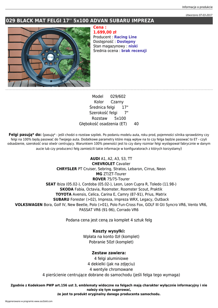 Informacje o produkcie Utworzono 07-03-2017 029 BLACK MAT FELGI 17'' 5x100 ADVAN SUBARU IMPREZA Cena : 1.699,00 zł Producent : Racing Line Dostępność : Dostępny Stan magazynowy : niski Średnia ocena : brak recenzji Model 029/602 Kolor Czarny Średnica felgi 17" Szerokość felgi 7" Rozstaw 5x100 Głębokość osadzenia (ET) 40 Felgi pasują* do: (pasują* - jeśli chodzi o rozstaw szpilek. Po podaniu modelu auta, roku prod, pojemności silnika sprawdzimy czy felgi na 100% będą pasować do Twojego auta. Dodatkowe parametry które mają wpływ na to czy felga będzie pasować to ET - czyli odsadzenie, szerokość oraz otwór centrujący. Warunkiem 100% pewności jest to czy dany rozmiar felgi występował fabrycznie w danym aucie lub czy producenci felg zamieścili takie informacje w konfiguratorach z których korzystamy) AUDI A1, A2, A3, S3, TT CHEVROLET Cavalier CHRYSLER PT Cruiser, Sebring, Stratos, Lebaron, Cirrus, Neon MG ZT/ZT-Tourer ROVER 75/75-Tourer SEAT Ibiza (05.02-), Cordoba (05.02-), Leon, Leon Cupra R, Toledo (11.98-) SKODA Fabia, Octavia, Roomster, Roomster Scout, Praktik TOYOTA Avensis, Celica, Carina E, Camry (87-91), Prius, Matrix SUBARU Forester (>02), Impreza, Impreza WRX, Legacy, Outback VOLKSWAGEN Bora, Golf IV, New Beetle, Polo (>01), Polo Fun-Cross Fox, GOLF III Gti Syncro VR6, Vento VR6, PASSAT VR6 (91-96), Corrado VR6 Podana cena jest ceną za komplet 4 sztuk felg Koszty wysyłki: Wpłata na konto 0zł (komplet) Pobranie 50zł (komplet) Zestaw zawiera: 4 felgi aluminiowe 4 dekielki (jak na zdjęciu) 4 wentyle chromowane 4 pierścienie centrujące dobrane do samochodu (jeśli felga tego wymaga) Zgodnie z Kodeksem PWP art.156 ust 3, emblematy widoczne na felgach mają charakter wyłącznie informacyjny i nie należy się tym sugerować, że jest to produkt oryginalny danego producenta samochodu. Wygenerowano w programie www.oscGold.com Alufelgi dobieramy wg parametrów katalogowych producentów. W przypadku niektórych modeli aut lub felg zachodzi konieczność zastosowania dystansów, śrub/nakrętek ampułkowych. Ponieważ, zawsze może zajść taka sytuacja w której katalog/konfigurator wprowadzi w błąd sprzedawcę zaleca się przed montarzem opon przyłożyć felgę na piastę i sprawdzić czy felga nigdzie nie będzie obcierać. Po założeniu opon zwrot felg będzie nie możliwy.