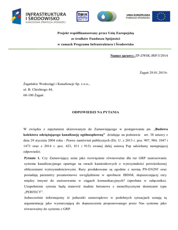 Projekt współfinansowany przez Unię Europejską ze środków Funduszu Spójności w ramach Programu Infrastruktura i Środowisko Numer sprawy: ZP-ZWIK-JRP/3/2014 Żagań 29.01.2015r. Żagańskie Wodociągi i Kanalizacje Sp. z o.o., ul. B. Chrobrego 44, 68-100 Żagań ODPOWIEDZI NA PYTANIA W związku z zapytaniem skierowanym do Zamawiającego w postępowaniu pn. „Budowa kolektora odciążającego kanalizację ogólnospławną” działając na podstawie art. 38 ustawy z dnia 29 stycznia 2004 roku - Prawo zamówień publicznych (Dz. U. z 2013 r. poz. 907, 984, 1047 i 1473 oraz z 2014 r. poz. 423, 811 i 915) zwanej dalej ustawą Pzp udzielamy następującej odpowiedzi. Pytanie 1. Czy Zamawiający uzna jako rozwiązanie równoważne dla rur GRP zastosowanie systemu kanalizacyjnego opartego na rurach kamionkowych o wytrzymałości potwierdzonej obliczeniami wytrzymałościowymi. Rury produkowane są zgodnie z normą PN-EN295 oraz posiadają parametry pozanormowe uwzględnione w aprobacie IBDiM, dopuszczającej rury między innymi do zastosowania w ciągach komunikacyjnych? (aprobata w załączniku). Uzupełnienie sytemu będą stanowić studnie betonowe z monolitycznymi dennicami typu „PERFECT”. Jednocześnie informujemy iż jednostki samorządowe w podobnych sytuacjach uznają tą argumentację jako wystarczającą do dopuszczenia proponowanego przez Nas systemu jako równoważny do systemu z GRP. Dopuszczenie takie eliminuje ryzyko protestów, które mogły by wnieść inne strony postępowania. Uzasadnienie techniczne dla zastosowania systemu rur kamionkowych ze studniami betonowymi typu Perfect: Kanały kamionkowe na tle innych materiałów wyróżniają się między innymi: • Większą odpornością termiczną i współczynnikiem rozszerzalności termicznej od rur tworzywowych uwzględnionych w dokumentacji. • Odpornością na promieniowanie słoneczne. • Parametrami wytrzymałościowymi niezależnymi od temperatury. • Wysoką odpornością na płukanie wysokociśnieniowe. Proponowany system rur kamionkowych posiada potwierdzenie odporności na płukanie dyszami wysokociśnieniowymi 340 bar. • Najwyższą odpornością chemiczną. Systemy kamionkowe posiadają najlepsze parametry odporności chemicznej. Dla materiału podstawowego odporność wynosi pH 0-14 dla uszczelek pH 0,4-13,4. • Wysoką odporność na ścieranie. W teście Darmstad testowi poddano rury z różnych materiałów. Na wykresach przedstawiających wyniku testu wyraźnie widać, że w zakresie ścieralność kamionka ma bardzo dobre parametry. Jeżeli rozpatrzymy wykres ścieralność z uwzględnieniem grubości ścianki rury wyniki są jeszcze bardziej korzystne dla kamionki. • Największą żywotnością kanałów. Według załącznika 6 przewodnika trwałości budownictwa (Ocena trwałości i właściwości budowli) opracowanego dla Niemieckiego Ministerstwa Transportu i Budownictwa trwałość kanałów kamionkowych wynosi 80-100 lat natomiast kanałów tworzywowych wynosi 40-50 lat. Doświadczenia eksploatacyjne pokazują, że żywotność kanałów kamionkowych może być znacznie wyższa niż podają wytyczne. • Większą sztywność rur oraz ich ciężarem. Połączenie tych dwóch parametrów skutecznie eliminuje możliwość wystąpienia przemieszczania kanałów lub utratę geometrii podczas zagęszczania opsypki lub podczas zasypywania kanału, które w znacznym stopniu wpływają na prawidłową eksploatację. Studnie betonowe z monolitycznymi dennicami typu „PERFECT” tle innych materiałów wyróżniają się między innymi: Lepszą kompatybilnością z rurami typu sztywnego • Większą wytrzymałością i trwałością materiału szczególnie w kontekście oddziaływania sił zgniatających, • Obojętnością na oddziaływanie sił wyporu wody, • Lepszą kompatybilnością z rurami typu sztywnego, • Odpornością na promieniowanie słoneczne, • Lepszą kompatybilnością z rurami typu sztywnego, • Technologia PERFECT umożliwia przemysłową i zautomatyzowaną produkcję betonowych monolitycznych dennych elementów studni kanalizacyjnych. Do produkcji ich stosuje się beton samozagęszczalny SCC. Beton ten umożliwia wykonanie elementów o bardzo skomplikowanych kształtach bez potrzeby jego mechanicznego zagęszczania. • w jednym cyklu produkcyjnym można otrzymać dennice o dowolnie skonfigurowanej kinecie, spoczniku i szczelnym połączeniem z rurami kolektora, z uwzględnieniem ilości przyłączy, wielkości ich średnic, wysokości ich położenia, kątów i spadków z zachowanie szczelności wymaganej przez producenta rur kamionkowych. • idealnym przepływem hydraulicznym - dokładne rozmieszczenie i nachylenie wszystkich przyłączy oraz rynien kinety umożliwia zoptymalizowanie przepływu na całej długości kolektora. Technologia PERFECT pozwala na wykonanie jednolitego spadku kolektora z dokładnością do 1 mm łącznie z przejściami szczelnymi i kinetą. Zapobiega to powstawaniu osadów, zatorów oraz zawirowań w kanale. Przyłącza są posadowione z dokładnością do 1°, w zakresie od 90° – 270° po obwodzie w stosunku do wylotu 0°. • Odporność chemiczna – zwiększenie odporności studni na agresywność chemiczną o ekspozycji XA2 i XA3 osiągamy przez zastosowanie do produkcji betonu cementu siarczano odpornego HSR zgodnie z krajowym uzupełnieniem normy PN-B-06265:2004. Uzasadnienie ekonomiczne dla zastosowania systemu rur kamionkowych ze studniami betonowymi typu Perfect: Zastosowanie proponowanego przez nas systemu pozwoli Państwu wybudować kanalizację o co najmniej dwukrotnie większej żywotności. W związku z powyższym będzie Państwo mogli obniżyć współczynnik amortyzacji, który znacząco wpływa na stawkę taryfy za oprowadzanie ścieków. Dla systemów tworzywowych zgodnie z wytycznymi przyjmuje się żywotność od 40– 50lat. Dla systemów kamionkowych żywotność określa się na okres 80 – 100lat. Ta za