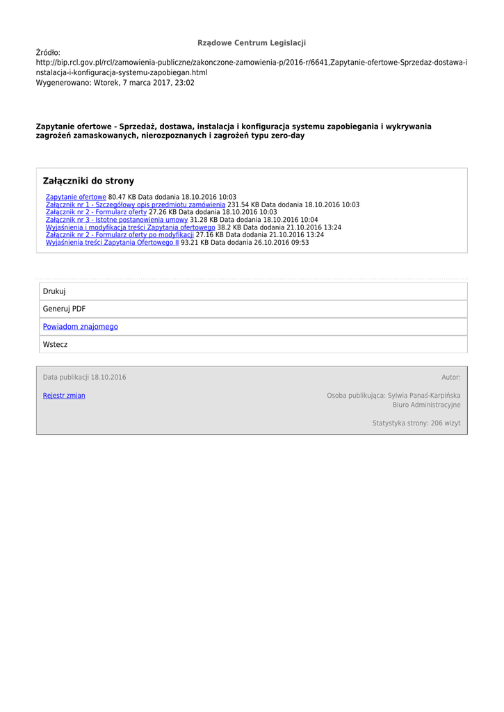 Rządowe Centrum Legislacji Źródło: http://bip.rcl.gov.pl/rcl/zamowienia-publiczne/zakonczone-zamowienia-p/2016-r/6641,Zapytanie-ofertowe-Sprzedaz-dostawa-i nstalacja-i-konfiguracja-systemu-zapobiegan.html Wygenerowano: Wtorek, 7 marca 2017, 23:02 Zapytanie ofertowe - Sprzedaż, dostawa, instalacja i konfiguracja systemu zapobiegania i wykrywania zagrożeń zamaskowanych, nierozpoznanych i zagrożeń typu zero-day Załączniki do strony Zapytanie ofertowe 80.47 KB Data dodania 18.10.2016 10:03 Załącznik nr 1 - Szczegółowy opis przedmiotu zamówienia 231.54 KB Data dodania 18.10.2016 10:03 Załącznik nr 2 - Formularz oferty 27.26 KB Data dodania 18.10.2016 10:03 Załącznik nr 3 - Istotne postanowienia umowy 31.28 KB Data dodania 18.10.2016 10:04 Wyjaśnienia i modyfikacja treści Zapytania ofertowego 38.2 KB Data dodania 21.10.2016 13:24 Załącznik nr 2 - Formularz oferty po modyfikacji 27.16 KB Data dodania 21.10.2016 13:24 Wyjaśnienia treści Zapytania Ofertowego II 93.21 KB Data dodania 26.10.2016 09:53 Drukuj Generuj PDF Powiadom znajomego Wstecz Data publikacji 18.10.2016 Rejestr zmian Autor: Osoba publikująca: Sylwia Panaś-Karpińska Biuro Administracyjne Statystyka strony: 206 wizyt