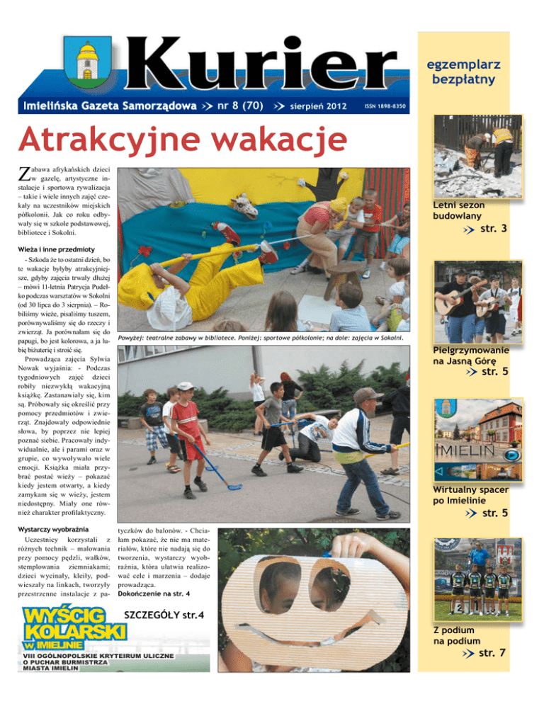 egzemplarz bezpłatny Imielińska Gazeta Samorządowa nr 8 (70) sierpień 2012 ISSN 1898-8350 Atrakcyjne wakacje Z abawa afrykańskich dzieci w gazelę, artystyczne instalacje i sportowa rywalizacja – takie i wiele innych zajęć czekały na uczestników miejskich półkolonii. Jak co roku odbywały się w szkole podstawowej, bibliotece i Sokolni. Powyżej: teatralne zabawy w bibliotece. Poniżej: sportowe półkolonie; na dole: zajęcia w Sokolni. Pielgrzymowanie na Jasną Górę str. 5 Wirtualny spacer po Imielinie str. 5 tyczków do balonów. - Chciałam pokazać, że nie ma materiałów, które nie nadają się do tworzenia, wystarczy wyobraźnia, która ułatwia realizować cele i marzenia – dodaje prowadząca. Dokończenie na str. 4 sierpień 2012 Wystarczy wyobraźnia Uczestnicy korzystali z różnych technik – malowania przy pomocy pędzli, wałków, stemplowania ziemniakami; dzieci wycinały, kleiły, podwieszały na linkach, tworzyły przestrzenne instalacje z pa- str. 3 Dokończenie na str. 4 szczegóły str.4 Z podium na podium str. 7 Kurier Wieża i inne przedmioty - Szkoda że to ostatni dzień, bo te wakacje byłyby atrakcyjniejsze, gdyby zajęcia trwały dłużej – mówi 11-letnia Patrycja Pudełko podczas warsztatów w Sokolni (od 30 lipca do 3 sierpnia). – Robiliśmy wieże, pisaliśmy tuszem, porównywaliśmy się do rzeczy i zwierząt. Ja porównałam się do papugi, bo jest kolorowa, a ja lubię biżuterię i stroić się. Prowadząca zajęcia Sylwia Nowak wyjaśnia: - Podczas tygodniowych zajęć dzieci robiły niezwykłą wakacyjną książkę. Zastanawiały się, kim są. Próbowały się określić przy pomocy przedmiotów i zwierząt. Znajdowały odpowiednie słowa, by poprzez nie lepiej poznać siebie. Pracowały indywidualnie, ale i parami oraz w grupie, co wywoływało wiele emocji. Książka miała przybrać postać wieży – pokazać kiedy jestem otwarty, a kiedy zamykam się w wieży, jestem niedostępny. Miały one również charakter profilaktyczny. Letni sezon budowlany Nasze sprawy Spotkanie w sprawie S-1 W związku z planowaną budową drogi ekspresowej S-1 od węzła „Kosztowy II” w Mysłowicach do węzła „Suchy Potok” w Bielsku-Białej spotkanie prezentacyjne odbędzie się 30 sierpnia (czwartek) o godzinie 16:00 w Bibliotece Miejskiej w Imielinie, ul. Imielińska 88 Inwestorem jest Generalna Dyrekcja Dróg Krajowych i Autostrad w Katowicach, a wykonawcą projektu drogi Biuro Projektowe KV Projekty Inżynieryjne i Architektoniczne. KRONIKA POLICYJNA Stypendia i wyprawka Stypendia naukowe Uczniowie, mieszkańcy Imielina, uczęszczający dla szkół podstawowych, gimnazjów i szkół ponadgimnazjalnych, kończących się egzaminem dojrzałości – maturą (z wyjątkiem uczniów klas I –III szkoły podstawowej), mogą ubiegać się o stypendia naukowe. Stypendia zostaną przyznawane na podstawie Uchwały Nr XXI/92/2008 Rady Miasta Imielin z dnia 27 czerwca 2008r. z późn. zm. w sprawie przyjęcia programu wspierania edukacji uzdolnionych uczniów przez miasta Imielin. O stypendium może się ubiegać uczeń, który w roku szkolnym 2011/2012 został: • laureatem lub finalistą konkursu przedmiotowego na szczeblu co najmniej wojewódzkim organizowanego przez kuratorium oświaty, lub z jego upoważnienia. • laureatem lub finalistą olimpiady przedmiotowej na szczeblu ogólnopolskim organizowanej przez komitety główne olimpiad przedmiotowych z listy MEN w danym roku szkolnym. Wniosek o stypendium winien zawierać: dane instytucji, lub osoby zgłaszającej (nazwa, lub imię i nazwisko osoby oraz adres), dane kandydata (imię i nazwisko, adres), uzasadnienie. Do wniosku o stypendium powinny być dołączone następujące dokumenty: - potwierdzona za zgodność z oryginałem kserokopia świadectwa ucznia za dany rok szkolny, - dokumenty lub ich kserokopie (potwierdzone za zgodność) potwierdzające, że uczeń jest laureatem lub finalistą, - zaświadczenie o kontynuowaniu nauki. Wnioski o stypendium należy składać w Urzędzie Miasta Imielin w terminie do dnia 30 września bieżącego roku. Bliższych informacji udziela Referat EZKS Urzędu Miasta Imielin ul. Imielinska 81 (pok. 34 lub 36) telefon 032 22 54 134, 032 22 54 136. Stypendia szkolne z MOPS-u 16 lipca około godz. 5.25 w Imielinie doszło do zderzenia samochodu osobowego z ciężarówką. Z ustaleń policjantów wynika, że kierująca volkswagenem mieszkanka Imielina wyjeżdżając z ul. Karolinki na ul. Imielińską z zamiarem skrętu w kierunku Mysłowic, nie udzieliła pierwszeństwa przejazdu kierującemu samochodem ciężarowym marki mercedes wraz z naczepą, który jechał ul. Imielińską w kierunku Bierunia, w wyniku czego doszło do zderzenia pojazdów. Dwie osoby tj. kierowca i pasażerka volkswagena zostały zabrane do szpitala. 22 lipca policjanci bieruńskiej drogówki na terenie powiatu bieruńsko-lędzińskiego przeprowadzili akcję PASY oraz TRZEŹWOŚĆ. Ujawnili 22 przypadki niekorzystania z pasów bezpieczeństwa w trakcie jazdy (20 osób to kierujący, 2 to pasażerowie), zwracali także uwagę na obowiązek przewożenia dzieci w fotelikach ochronnych. Funkcjonariusze skontrolowali również stan trzeźwości 537 kierujących, w wyniku czego w Imielinie w ręce policjantów wpadło 2 amatorów jazdy „na podwójnym gazie”. Na ul. Wyzwolenia zatrzymali 39-latka, który kierował samochodem będąc w stanie nietrzeźwości - wynik badania 0,57 promila. Na ul. Wandy w ręce funkcjonariuszy wpadł mieszkaniec Lędzin, który kierował motorowerem w stanie po użyciu alkoholu - wynik badania 0,40 promila. Kurier sierpień 2012 DYŻURY RADNYCH 3 września (poniedziałek) w sali nr 21 Urzędu Miasta w godz. 1600 – 1700 dyżurują radni: Bernadeta Ficek – okręg nr 1, Józef Pacwa – okręg nr 2, Jerzy Gołaszczyk - okręg nr 5. Okręgi te obejmują ulice: Heweliusza, Imielińską od nr. 1 do nr. 37 i od nr. 2 do nr. 58, Modrzewiową, Satelicką