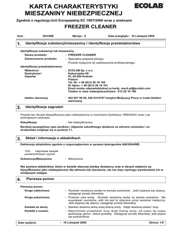 KARTA CHARAKTERYSTYKI MIESZANINY NIEBEZPIECZNEJ Zgodnie z regulacją Unii Europejskiej EC 1907/2006 wraz z aneksami FREEZER CLEANER Kod : 1. 104199E Wersja : 8 Data przeglądu : 16 Listopad 2009 Identyfikacja substancji/mieszaniny i identyfikacja przedsiębiorstwa Identyfikacja substancji lub mieszaniny Nazwa produktu : FREEZER CLEANER Zastosowanie produktu : Specjalny preparat piorący Produkt wyłącznie do zastosowania profesjonalnego. Identyfikacja przedsiębiorstwa Wytwórca/ Dystrybutor/ Importer telefon alarmowy 2. : ECOLAB Sp. z o.o. Kalwaryjska 69 PL-30-504 Kraków Poland Tel. Nr: + 48 (0)12 26 16 100 Nr faksu: + 48 (0)12 26 16 101 Email osoby odpowiedzialnej za kartę: [email protected] Telefon w razie niebezpieczeństwa: 012 26 16 100 : 042 657 99 00, 042 6314767 Instytut Medycyny Pracy w Łodzi (telefon alarmowy) Identyfikacja zagrożeń Produkt ten nie jest sklasyfikowany jako niebezpieczny w rozumieniu Dyrektywy 1999/45/EC wraz z jej późniejszymi zmianami. Klasyfikacja : Nie sklasyfikowany. Bardziej szczegółowy opis skutków i objawów szkodliwego działania na zdrowie człowieka i na środowisko znajduje się w punkcie 11. 3. Skład i informacja o składnikach Deklaracja składników zgodnie z rozporządzeniem w sprawie detergentów 648/2004/WE: <5% niejonowe związki powierzchniowo czynne Substancja/Mieszanina : Mieszanina Nie zawiera składników, które w świetle obecnej wiedzy dostawcy oraz w danym stężeniu są klasyfikowane jako niebezpieczne dla zdrowia lub otoczenia, nie ma więc wymogu wymieniania ich w niniejszym ustępie. 4. Pierwsza pomoc Pierwsza pomoc Droga oddechowa Droga pokarmowa Kontakt ze skórą Kontakt z oczami. Data wydania : Wynieść narażoną osobę na świeże powietrze. Jeśli pojawią się objawy, zasięgnąć porady lekarskiej. : Przemyć usta wodą. Wynieść narażoną osobę na świeże powietrze. Nie wywoływać wymiotów, jeśli nie jest to zalecane przez personel medyczny. Jeśli pojawią się objawy, zasięgnąć porady lekarskiej. : Spłukać skażoną skórę dużą ilością wody. Zdjąć skażoną odzież i buty. : Natychmiast przepłukać oczy dużą ilością wody, od czasu do czasu podnosząc górna i dolna powiekę. Zasięgnąć porady lekarskiej, jeśli pojawi się podrażnienie. : 16 Listopad 2009 Strona: 1/5 FREEZER CLEANER Szczególne sposoby leczenia : Brak. Bardziej szczegółowy opis skutków i objawów szkodliwego działania na zdrowie człowieka i na środowisko znajduje się w punkcie 11. 5. Postępowanie w przypadku pożaru Środki gaśnicze - Odpowiednie : W przypadku pożaru zastosować zraszania wodą (mgłą), użyć piany oraz suchych środków chemicznych lub CO2. Środki gaśnicze : Nie znane. Nieodpowiednie Środki ochrony indywidualnej dla strażaków 6. : Strażacy powinni nosić odpowiednie urządzenia ochronne oraz indywidualne aparaty oddechowe (SCBA) z maska zakrywającą całą twarz działająca w obszarze podwyższonego ciśnienia. Postępowanie w przypadku niezamierzonego uwolnienia do środowiska Indywidualne środki ostrożności : Nie udzielać zezwolenia na wejście - niepotrzebnemu i nie zabezpieczonemu personelowi. Nie dotykać, ani nie przechodzić, po rozlanym materiale. Unikać wdychania par lub mgły. Zapewnić właściwą wentylację. Zabezpieczenia środowiskowe : Należy unikać uwolnienia rozlanego/rozsypanego materiału, jego spływania/rozprzestrzeniania do gleby lub kontaktu z glebą, wodami powierzchniowymi i gruntowymi, drenami i kanalizacją. Małe rozlanie/rozproszenie : Rozcieńczyć wodą i zebrać ścierką jeżeli rozpuszcza się w wodzie lub zaadsorbować obojętnym suchym materiałem i umieścić we właściwym pojemniku na odpady. Duże rozlanie : Zabezpieczyć ujścia kanalizacji, instalacji wodnych oraz wejścia do piwnic i obszarów zamkniętych. Rozlane lub rozsypane substancje, należy zebrać za pomocą niepalnych substancji, takich jak: piasek, ziemia, wermikulit, ziemia okrzemkowa. Następnie umieścić w pojemnikach i utylizować zgodnie z miejscowymi przepisami (patrz punkt 13). Patrz także: punkt 8. zawiera informacje nt środków ochrony indywidualnej, a punkt 13. sposób postępowania z odpadami. 7. Postępowanie z substancją/mieszaniną i jej/jego magazynowanie Postępowanie z substancją lub : Nie spożywać. Unikać kontaktu z oczami, skórą i ubraniem. Po pracy należy dokładnie umyć ręce mydłem i wodą. preparatem Magazynowanie : Należy przechowywać zgodnie z miejscowymi przepisami. Przechowywać w oryginalnym opakowaniu, zdala od promieni słonecznych; w suchym, chłodnym i dobrze wentylowanym pomieszczeniu; zdala od niezgodnych materiałów (patrz punkt 10), napojów i jedzenia. Pojemnik powinien pozostać zamknięty i szczelny aż do czasu użycia. Nie przechowywać w temperaturze wyższej niż: 40°C Materiał opakowaniowy Zalecany 8. : Stosować oryginalny pojemnik. Kontrola narażenia i środki ochrony indywidualnej Najwyższe dopuszczalne stężenia substancji w środowisku pracy Kontrole narażenia Środki ochrony indywidualnej : Niedostępne. : Jeżeli pracownicy narażeni są na stężenia powyżej dopuszczalnych wartości, muszą stosować odpowiednie, certyfikowane maski chroniące układ oddechowy. Ochrona dróg oddechowych : Przy normalnym i zgodnym z przeznaczeniem użyciu, nie jest potrzebna maska oddechowa. (EN 143, 14387) Ochrona rąk (EN 374) Data wydania : Brak specjalnych zaleceń. : 16 Listopad 2009 Strona: 2/5 FREEZER CLEANER 9. Ochrona oczu i twarzy (EN 166) : Brak specjalnych zaleceń. Ochrona skóry (EN 14605) : Brak specjalnych zaleceń. Właściwości fizyczne i chemiczne Informacje ogólne Wygląd Stan fizyczny : Ciecz. Kolor : Przejrzysty. Zapach : Bez zapachu. Informacje ważne dla zdrowia, bezpieczeństwa oraz środowiska pH : 9.8 do 10.8 (100%) Temperatura wrzenia : Brak. Temperatura topnienia : Brak. Temperatura zapłonu : > 100°C 10. Palność (ciało stałe, gaz) Właściwości wybuchowe Granice wybuchow
