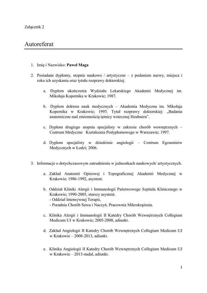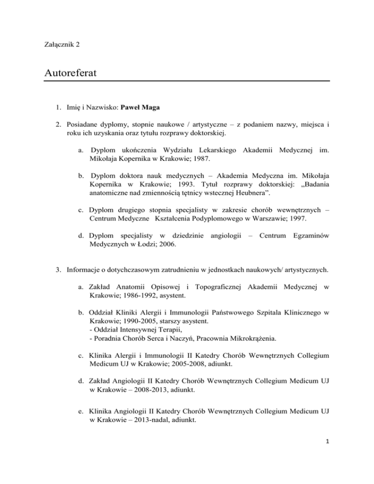 Załącznik 2 Autoreferat 1. Imię i Nazwisko: Paweł Maga 2. Posiadane dyplomy, stopnie naukowe / artystyczne – z podaniem nazwy, miejsca i roku ich uzyskania oraz tytułu rozprawy doktorskiej. a. Dyplom ukończenia Wydziału Lekarskiego Akademii Medycznej im. Mikołaja Kopernika w Krakowie; 1987. b. Dyplom doktora nauk medycznych – Akademia Medyczna im. Mikołaja Kopernika w Krakowie; 1993. Tytuł rozprawy doktorskiej: „Badania anatomiczne nad zmiennością tętnicy wstecznej Heubnera”. c. Dyplom drugiego stopnia specjalisty w zakresie chorób wewnętrznych – Centrum Medyczne Kształcenia Podyplomowego w Warszawie; 1997. d. Dyplom specjalisty w dziedzinie angiologii – Centrum Egzaminów Medycznych w Łodzi; 2006. 3. Informacje o dotychczasowym zatrudnieniu w jednostkach naukowych/ artystycznych. a. Zakład Anatomii Opisowej i Topograficznej Akademii Medycznej w Krakowie; 1986-1992, asystent. b. Oddział Kliniki Alergii i Immunologii Państwowego Szpitala Klinicznego w Krakowie; 1990-2005, starszy asystent. - Oddział Intensywnej Terapii, - Poradnia Chorób Serca i Naczyń, Pracownia Mikrokrążenia. c. Klinika Alergii i Immunologii II Katedry Chorób Wewnętrznych Collegium Medicum UJ w Krakowie; 2005-2008, adiunkt. d. Zakład Angiologii II Katedry Chorób Wewnętrznych Collegium Medicum UJ w Krakowie – 2008-2013, adiunkt. e. Klinika Angiologii II Katedry Chorób Wewnętrznych Collegium Medicum UJ w Krakowie – 2013-nadal, adiunkt. 1 4. Wskazanie osiągnięcia* wynikającego z art. 16 ust. 2 ustawy z dnia 14 marca 2003 r. o stopniach naukowych i tytule naukowym oraz o stopniach i tytule w zakresie sztuki (Dz. U. nr 65, poz. 595 ze zm.): a) tytuł osiągnięcia naukowego: Udział czynników zapalnych w procesie leczenia wewnątrznaczyniowego pacjentów z miażdżycą zarostową tętnic kończyn dolnych. b) (autor/autorzy, tytuł/tytuły publikacji, rok wydania, nazwa wydawnictwa), 1. Maga P, Sanak M, Rewerska B, Maga M, Jawień J, Wachsmann A, Rewerski P, Szczeklik W, Celejewska-Wójcik N.: Urinary cysteinyl leukotrienes in one-year follow-up of percutaneous transluminal angioplasty for peripheral arterial occlusive disease. 2016. Atherosclerosis. 2. Maga P, Sanak M, Jawień J, Rewerska B, Maga M, Wachsmann A, Koziej M, Gregorczyk Maga I, Niżankowski R.: 11-dehydro thromboxane B2 levels after percutaneous transluminal angioplasty in patients with peripheral arterial occlusive disease during a one year follow-up period. 2016. J Physiol Pharmacol. 3. Maga P, Mikołajczyk T.P, Partyka Ł, Krzanowski M, Malinowski K.P, Niżankowski R.: Percutaneous transluminal angioplasty in patients with peripheral arterial disease does not affect circulating monocyte subpopulations. 2016. BioMed Research International. c) omówienie celu naukowego w/w prac: Miażdżyca jest przewlekłą chorobą zapalną tętnic, charakteryzującą się tworzeniem bogatolipidowych blaszek miażdżycowych w obrębie warstwy wewnętrznej ściany tętnic. Zaawansowane zmiany miażdżycowe upośledzają ukrwienie tkanek i narządów przez zmniejszenie światła naczyń oraz wykrzepienie w wyniku pęknięcia blaszki miażdżycowej, co może mieć miejsce w każdym stadium jej rozwoju. Miażdżyca jest chorobą ogólnoustrojową i może dotyczyć wszystkich tętnic, w tym wieńcowych, domózgowych, trzewnych czy kończyn. Choroba ta, wraz z jej powikłaniami, stanowi jeden z najistotniejszych problemów współczesnej medycyny, zwłaszcza w krajach wysoko rozwiniętych, gdzie jest główną przyczyną zgonów oraz inwalidztwa wśród osób dorosłych. Miażdżyca tętnic kończyn dolnych (peripheral artery occlusive disease, PAOD), jedna z częstszych manifestacji klinicznych choroby, stwierdzana jest u 20% Europejczyków i mieszkańców Ameryki Północnej w grupie wiekowej powyżej 55 roku życia. Częstość występowania tego schorzenia rośnie z wiekiem i powyżej 70 rż. dotyczy aż 60% populacji ogólnej. 2 Współczesna koncepcja aterogenezy podkreśla istotny udział procesu zapalnego, w tym silnych mediatorów prozapalnych jakimi są eikozanoidy oraz udział reakcji immunologicznych. Eikozanoidy są produktami przemiany materii nienasyconych kwasów tłuszczowych, wśród których, kwas arachidonowy jest substratem dla dwóch enzymów: 5'lipooksygenazy (5-LO) i cyklooksygenazy (COX). Wykazano, że enzymy związane ze ścieżką produktów 5-LO ulegają ekspresji w ścianie naczyń, w różnym stadium miażdżycy aorty i tętnic wieńcowych. Lipooksygenazy są enzymami katalizującymi stereoswoistą dehydrogenację i dioksygenację wielonienasysonych kwasów tłuszczowych. Zidentyfikowana w leukocytach wielojądrzastych 5-LO arachidonowa wykazuje nadekspresję w makrofagach, komórkach dendrytycznych, komórkach piankowatych, mastocytach i neutrofilach w obrębie naczyń z miażdżycą. Enzym ten generuje niestabilny związek leukotrien A4 (LT A4), który jest prekursorem stabilnego leukotrienu B4(LT B4) i innych leukotrienów cysteinylowych. Produktem cyklooksygenazy jest prostaglandyna PGG przekształcana do PGH2, z którego powstają prostaglandyny, prostacyklina oraz tromboksan A (TX A). Tromboxan jest m.in. czynnikiem naczynioskurczowym i aktywującym agregację płytek krwi. Głównym metabolitem tromboksanu A2 (TX A2) jest tromboksan B2 (TX B2) i 11-dehydro TXB2, którego poziom może wzrastać podczas aktywacji płytek w trakcie krwawienia lub procedur wewnątrznaczyniowych, w zakresie tętnic wieńcowych. Metabolizm tromboksanu w płytkach krwi jest hamowany przez aspirynę, która nieodwracalnie hamuje cyklooksygenazę-1. Z uwagi na całkowite wydalanie z moczem 11-dechydroTXB2 oraz jego okres półtrwania (45minut), może być stosowany do monitorowania syntezy tromboksanu w zaburzeniach układu sercowo-naczyniowego. Rola leukotrienów i tromboksanów jako mediatorów zapalnych w miażdżycy zarostowej tętnic kończyn dolnych oraz w procesie leczenia wewnątrznaczyniowego z uwzględnieniem 